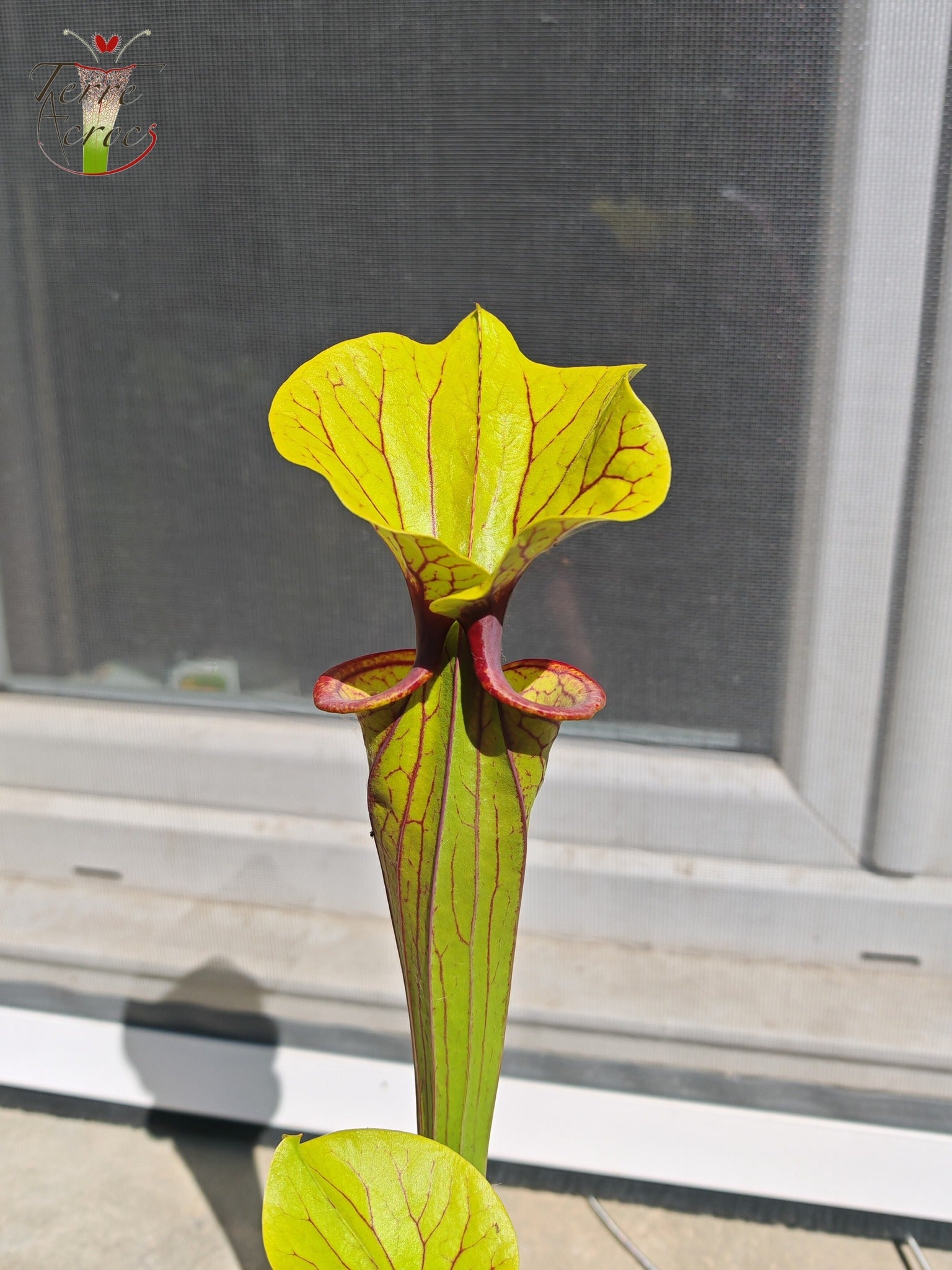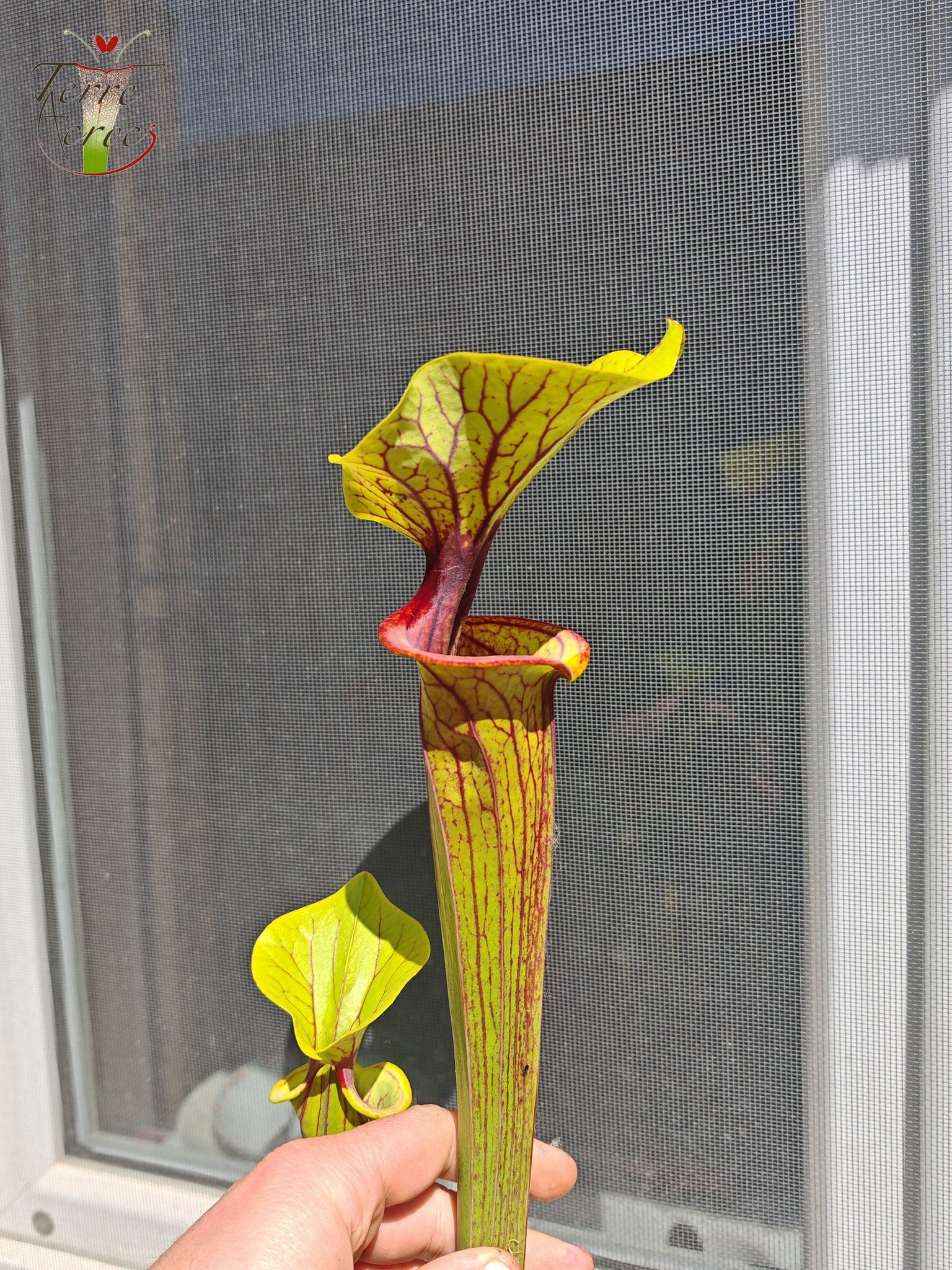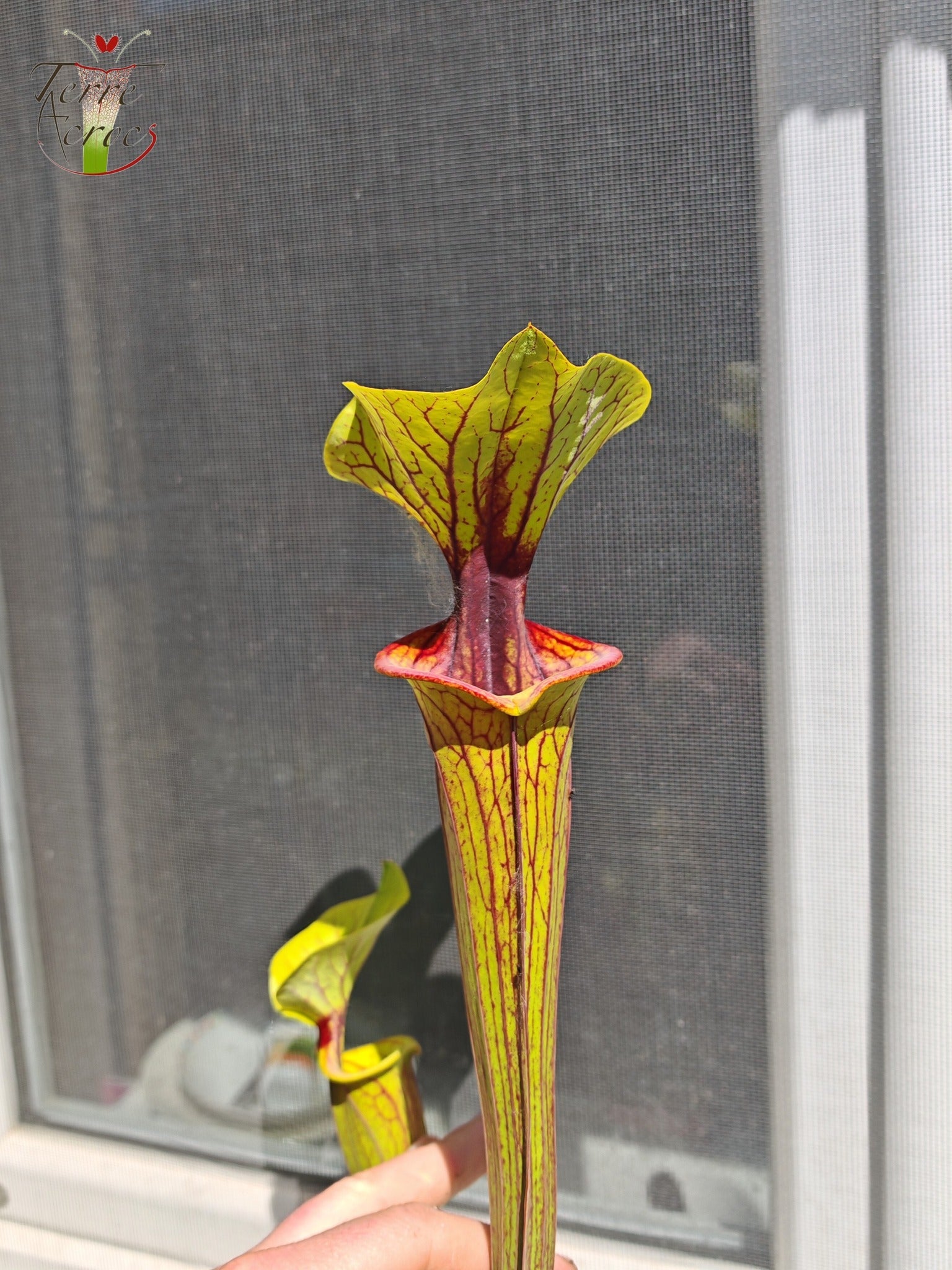 One of the most famous Sarracenia flava var. ornata. A must have both for its beauty itself and for its genetics to make hybrids. The lip of the peristome as well as the throat are a magnificent intense red.