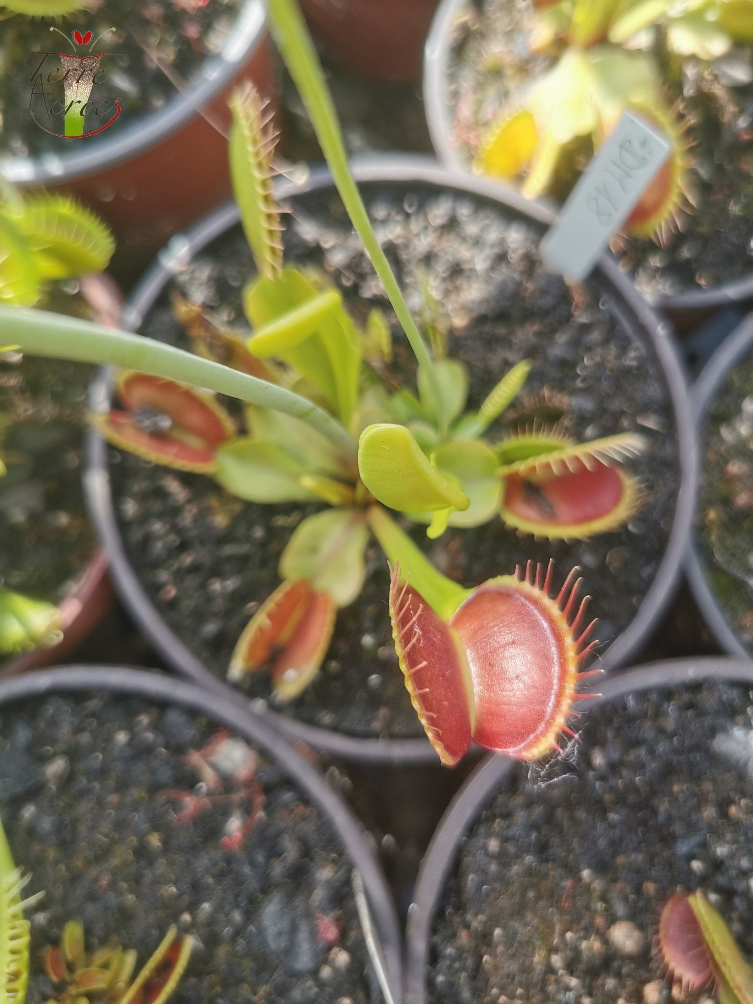 Dionaea muscipula cultivar “Giant Peach” qui se caractérise par une forme érigée, des pièges d’une taille supérieure à la forme type, plutôt convexes et fortement colorés d'un rouge orangé qui rappel une pêche . Les dents se colorent également de rouge.