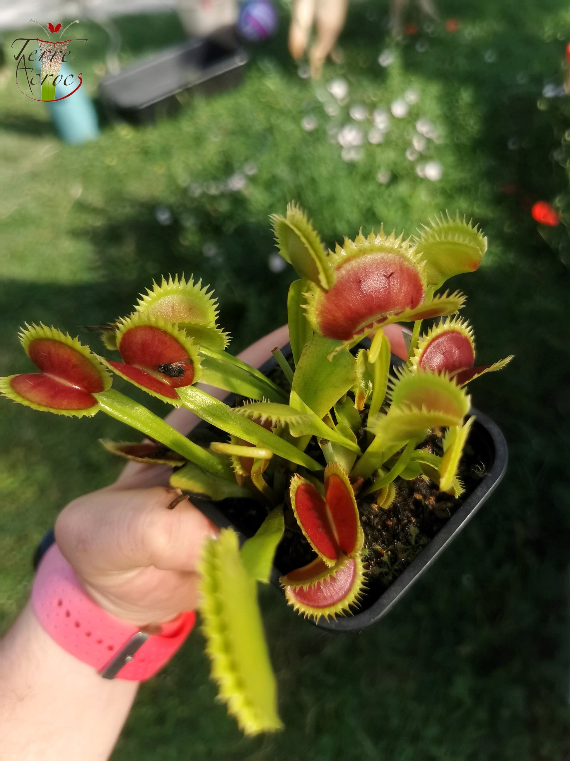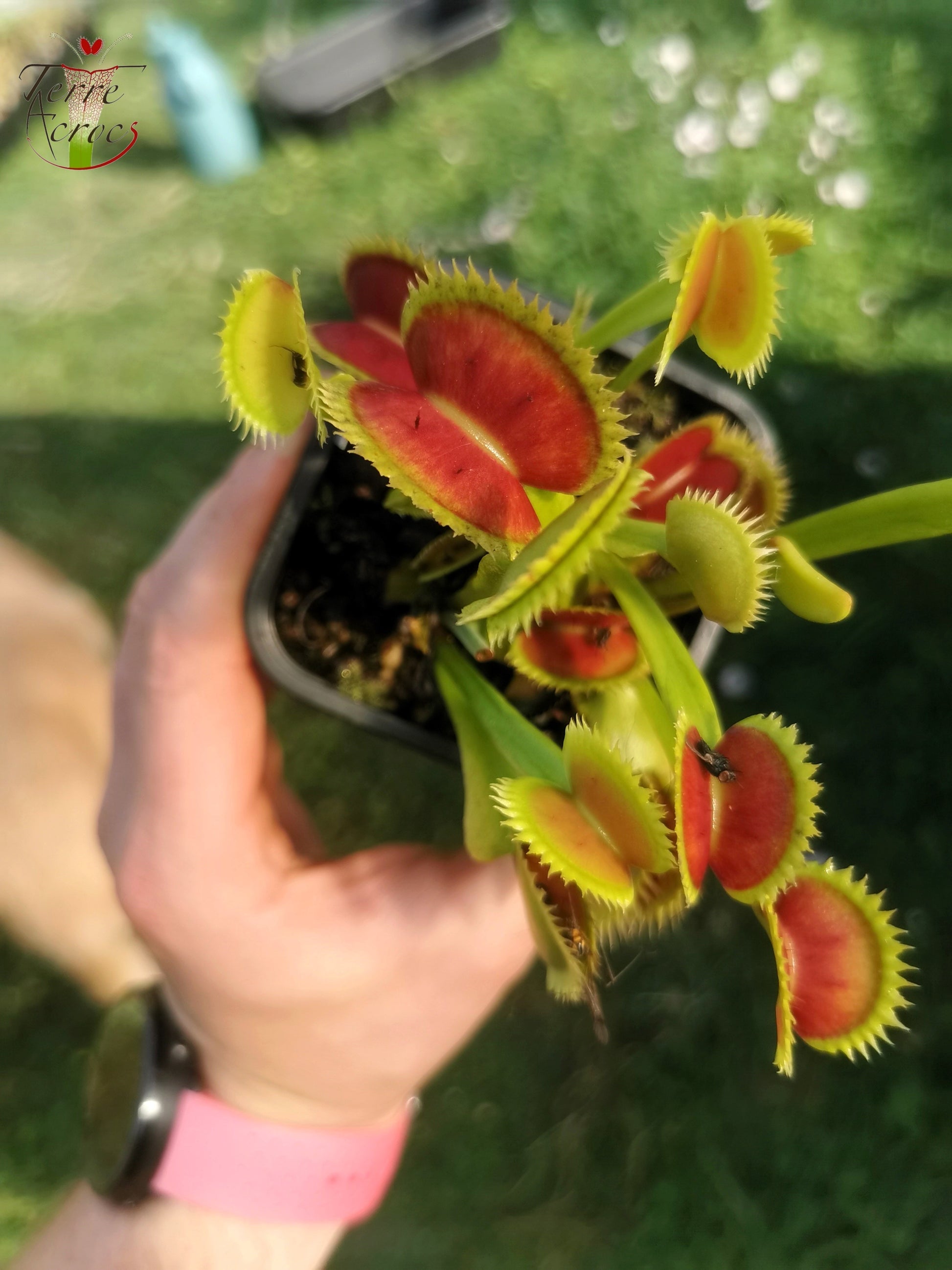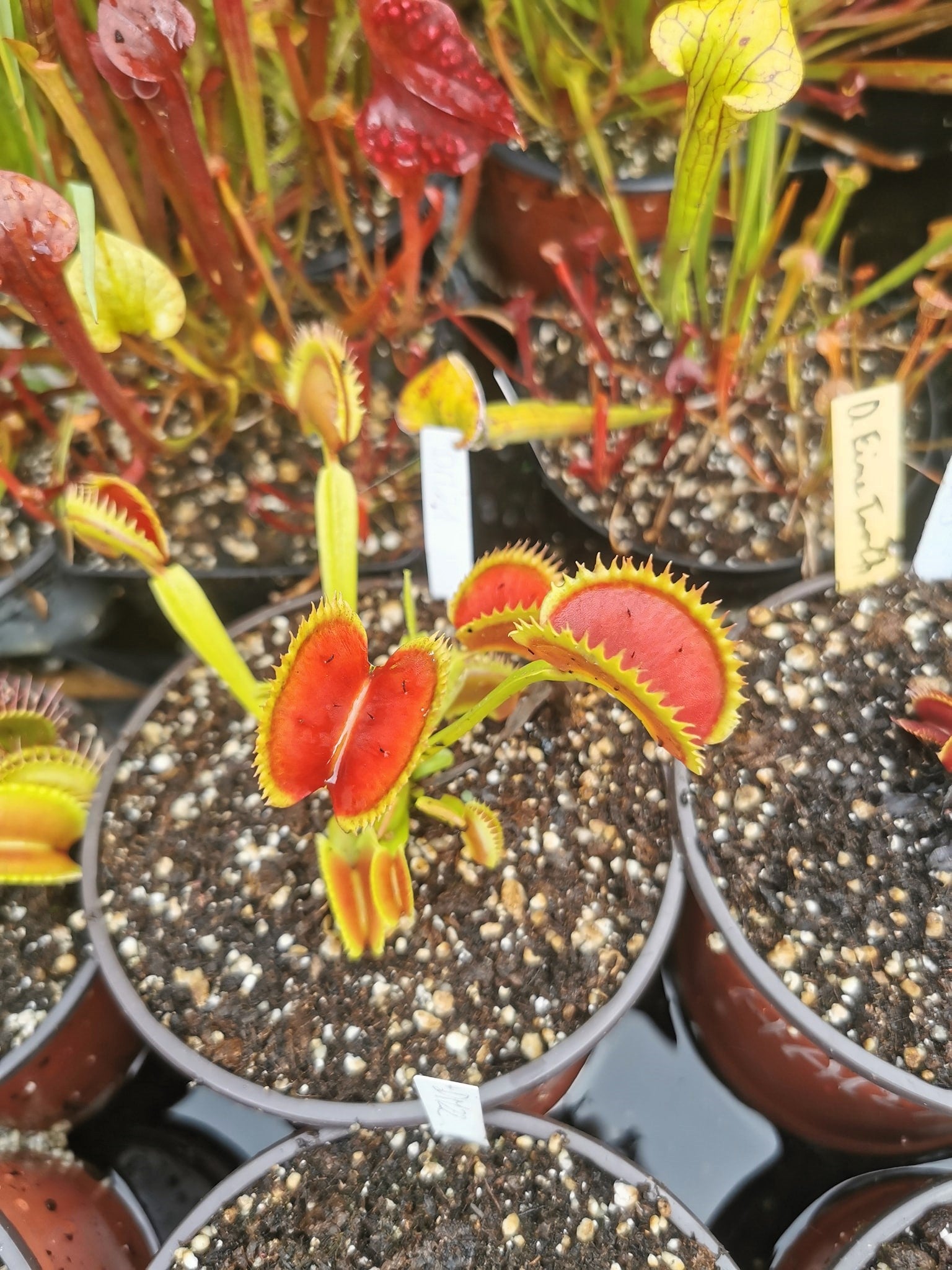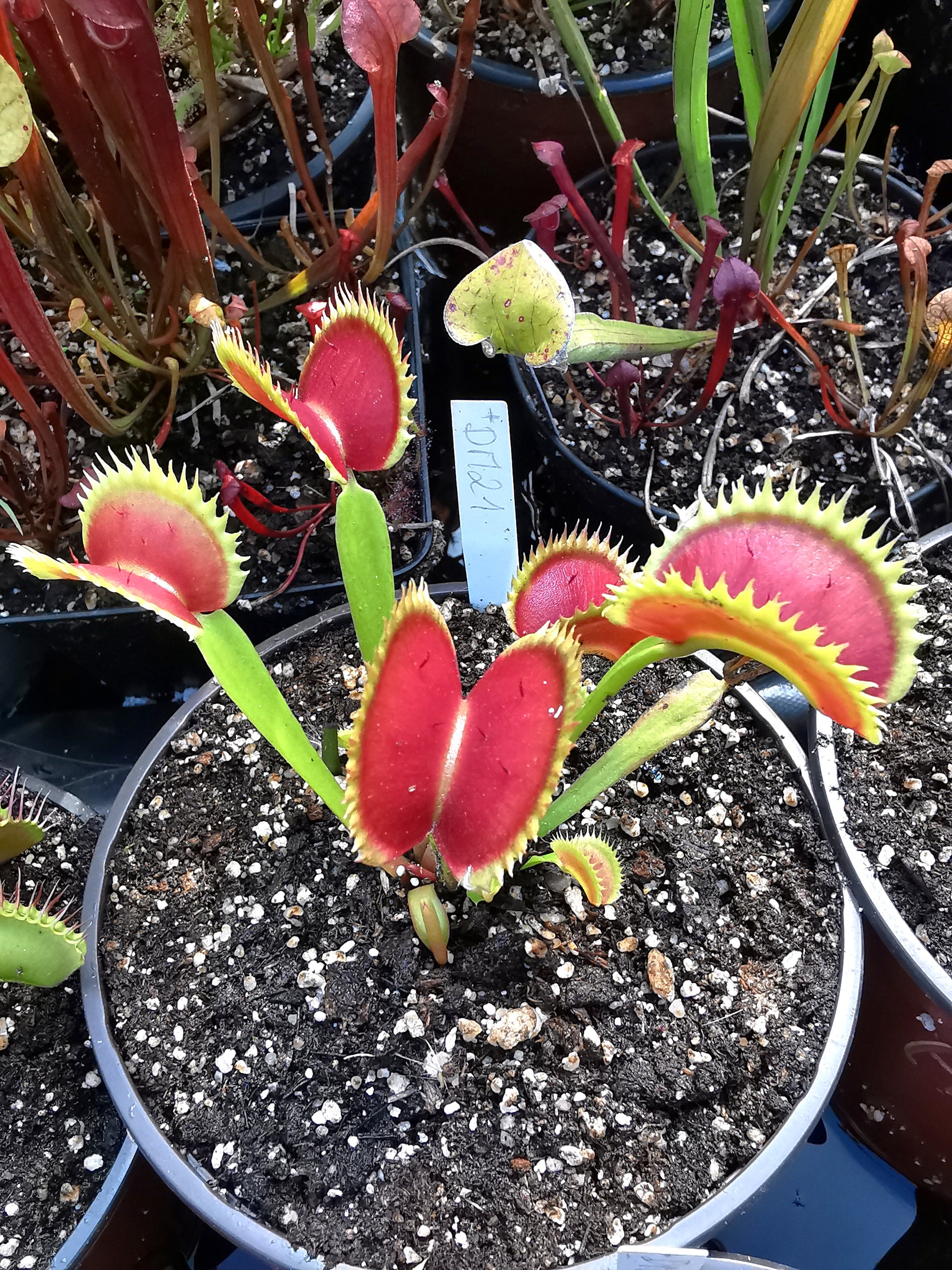Dionaea muscipula cultivar “SL Seedling” qui se caractérise par une forme érigée, les pièges peuvent atteindre une taille bien supérieure à la forme type et peuvent se colorer d’un rouge intense, les poils sensitifs sont très visibles et contrastés. Les dents sont de type sawtooth. Il s’agit d’une plante robuste et vigoureuse.