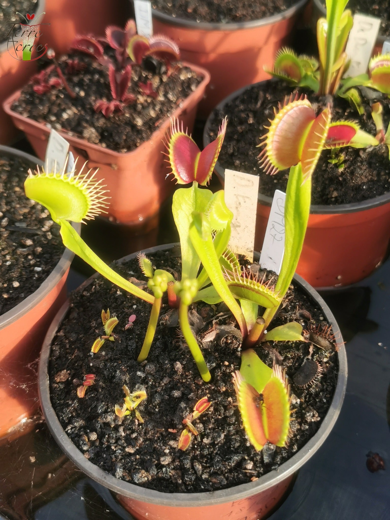 Dionaea muscipula cultivar “Fangs” qui se caractérise par une forme érigée, des pièges de bonne taille avec une belle coloration rouge. Les dents sont assez longues et peuvent se colorer de rouge.