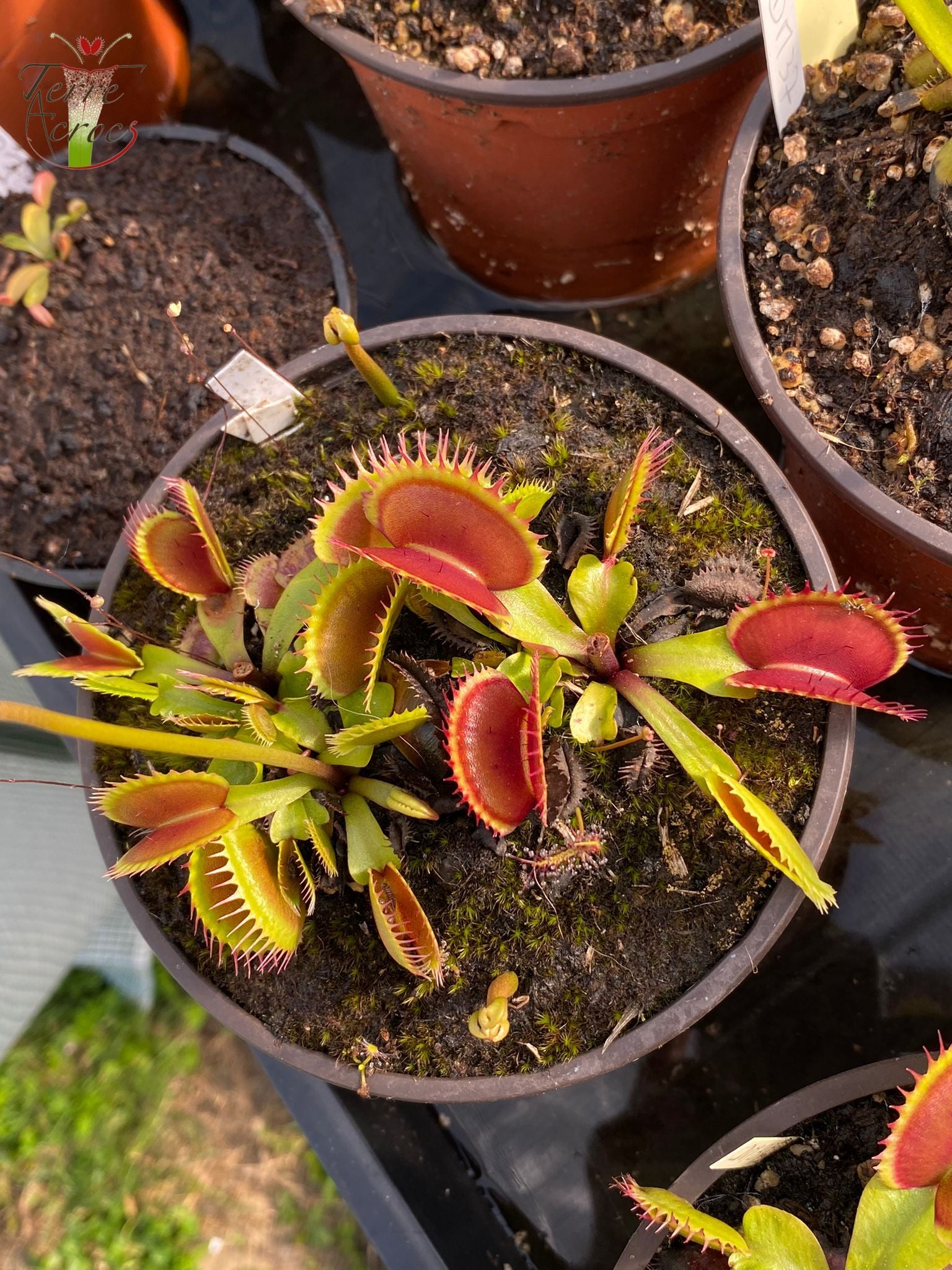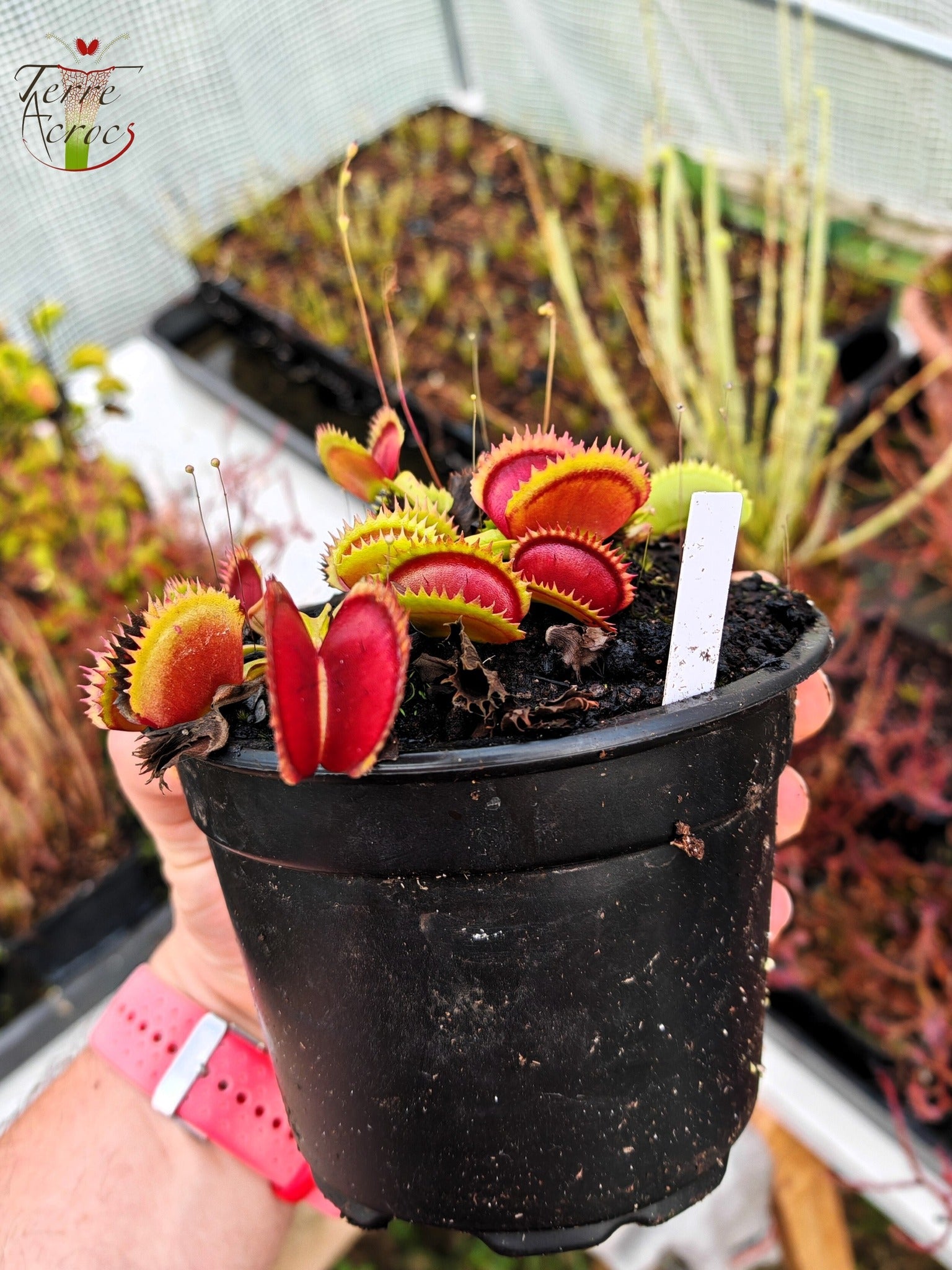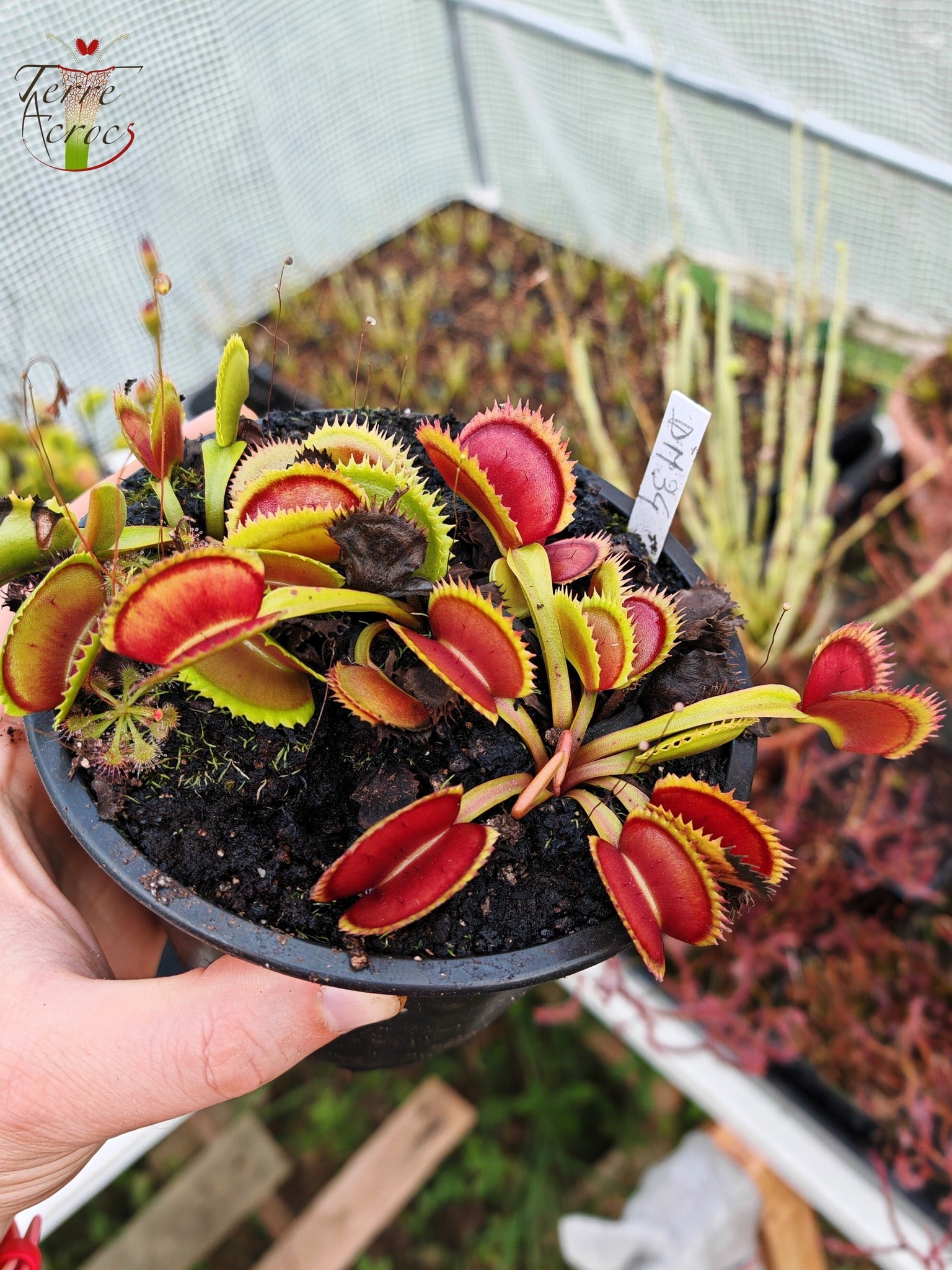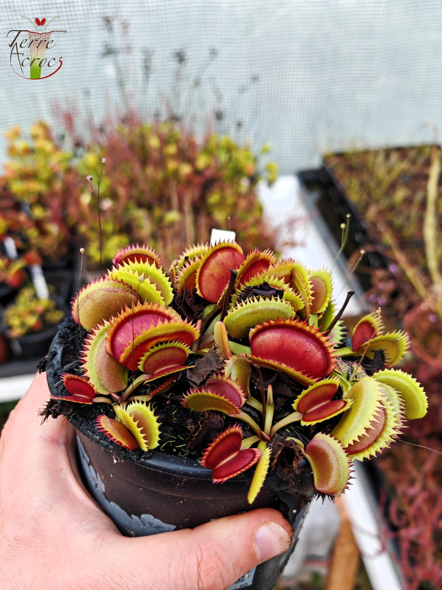 Dionaea muscipula cultivar “Bloody Shark” qui se caractérise par une forme plutôt érigée, comportant des pièges verts à verts pales. Tout l’intérêt du cultivar réside ici en la présence des dents de type shark qui sont fortement colorées de rouge avec aussi la présence d’un liseré lui aussi rouge en périphérie des dents. Le tout apporte un contraste intimidant rappelant une gueule sanglante de requin (d’où son nom) pour une plante qui ne manquera pas d’impressionner.