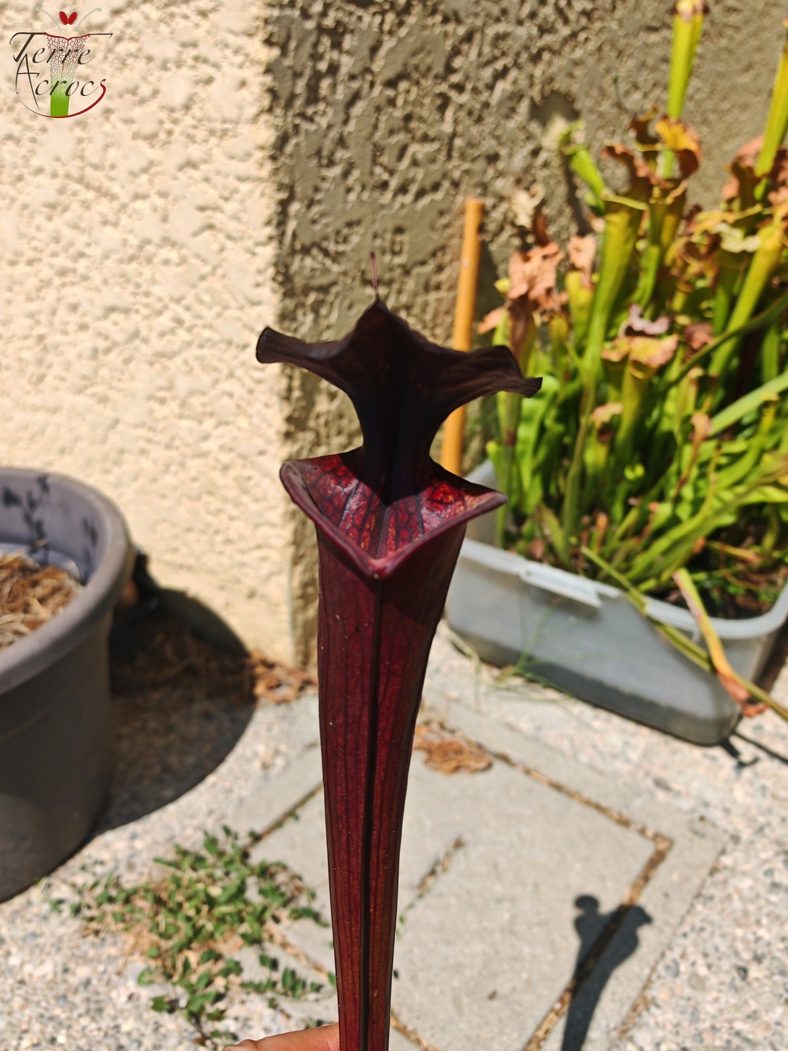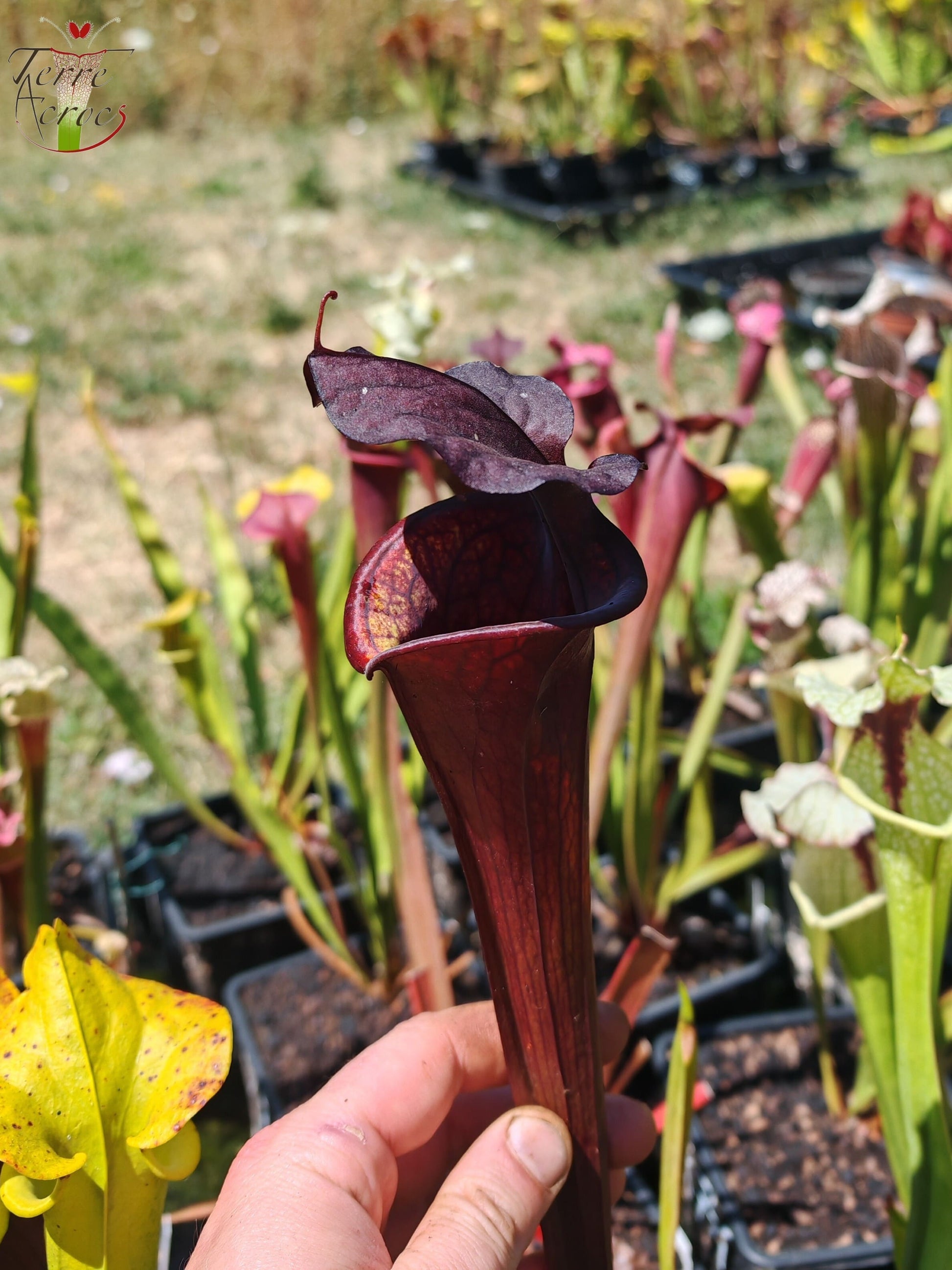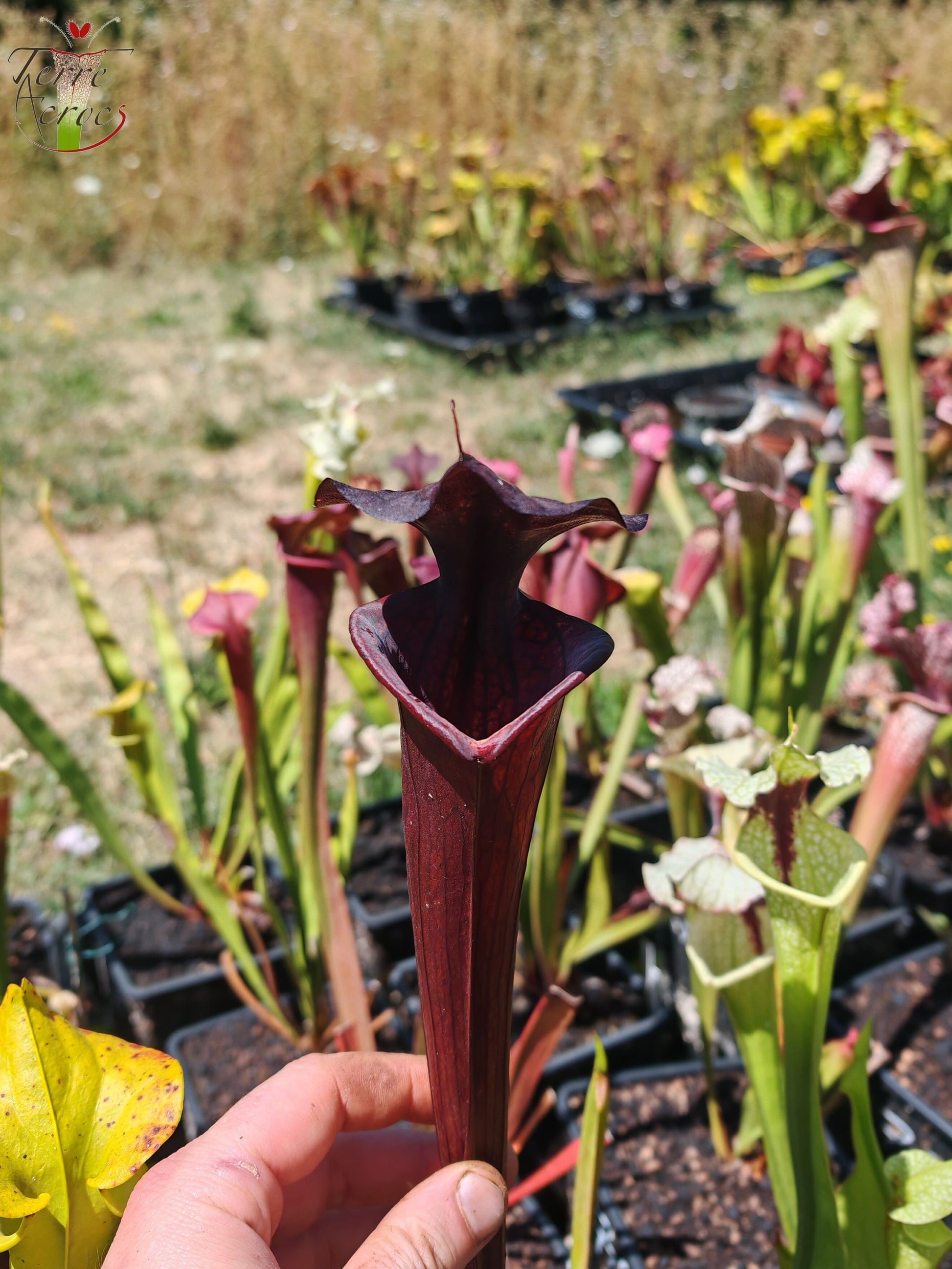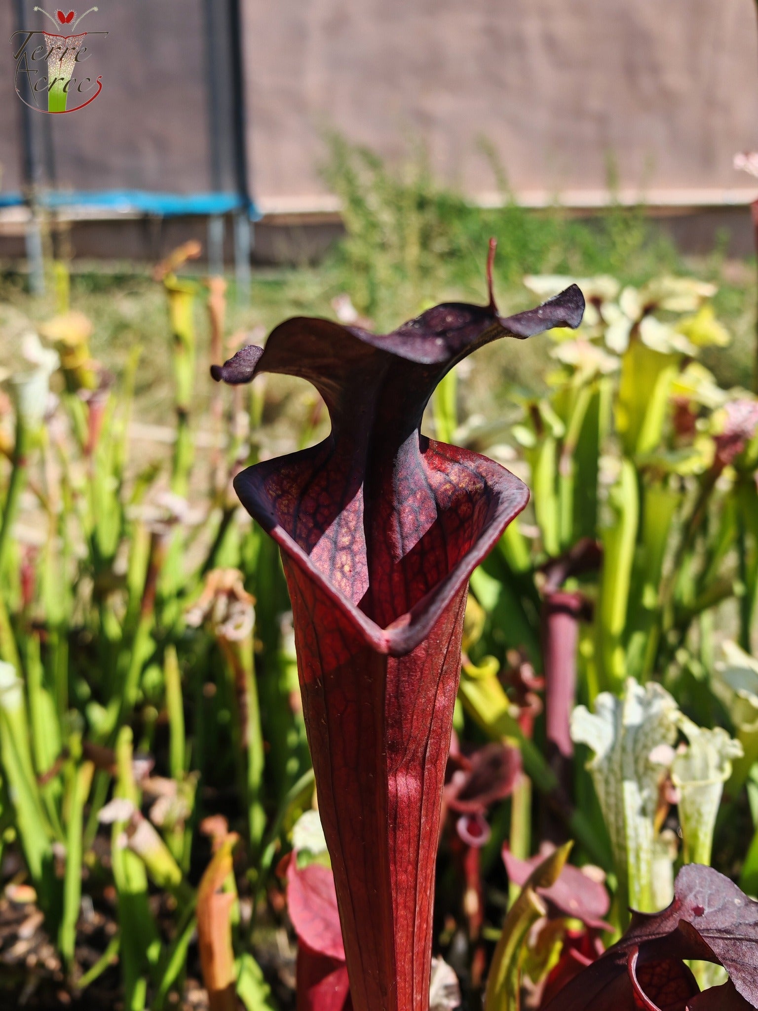 Magnifique Sarracenia hybride inconnu et unique. Avec sa forme plutôt original et ses couleurs : rouge très foncé, intérieur du péristome jaunâtre veiné jusque tard dans la saison et ses veines noires, cette plante se démarque dans les pré sélections 2025. Elle a toutes les caractéristiques pour intégrer la collection de manière permanente et continuera d'être à l'observation dans les années à venir.
