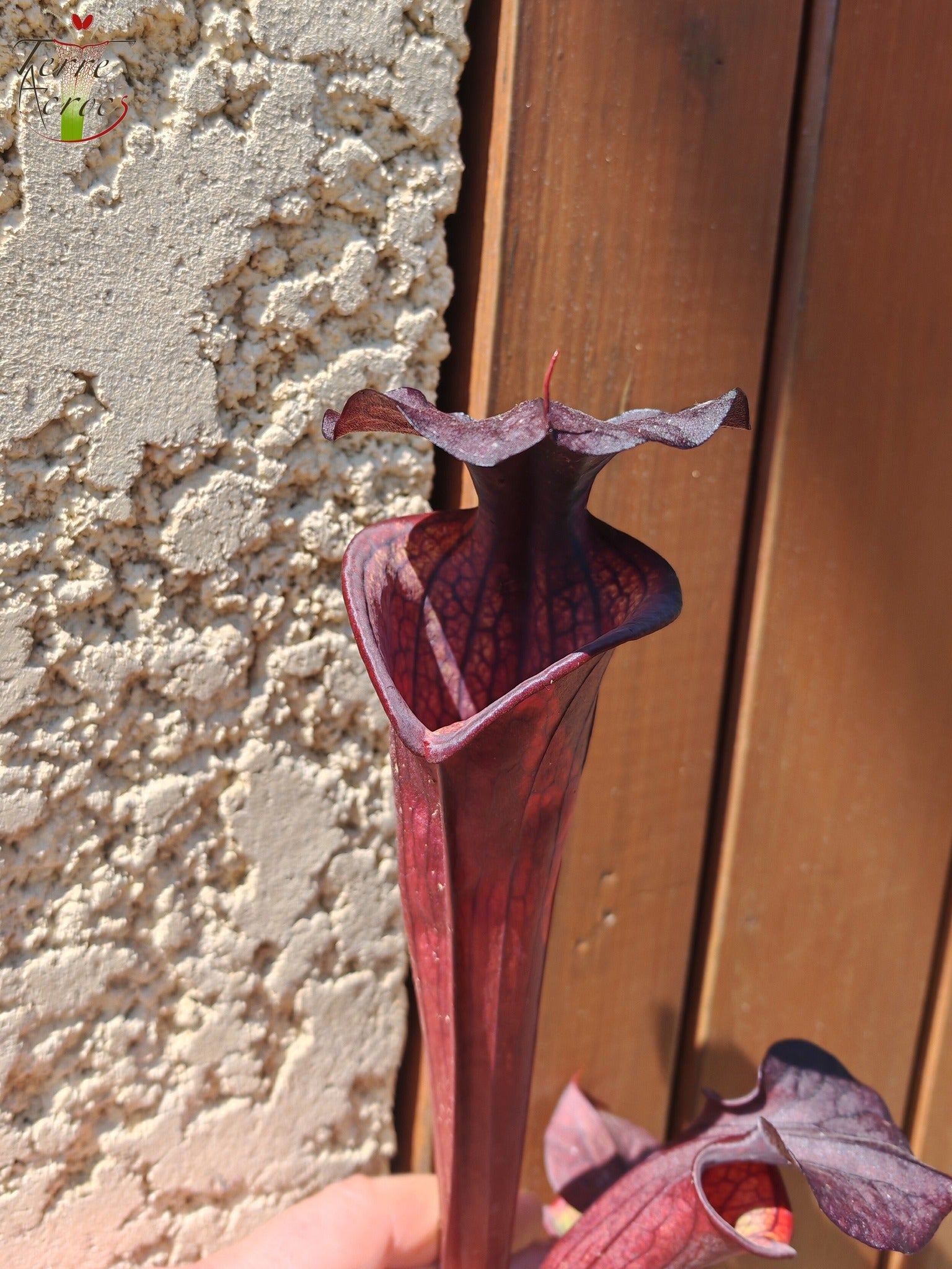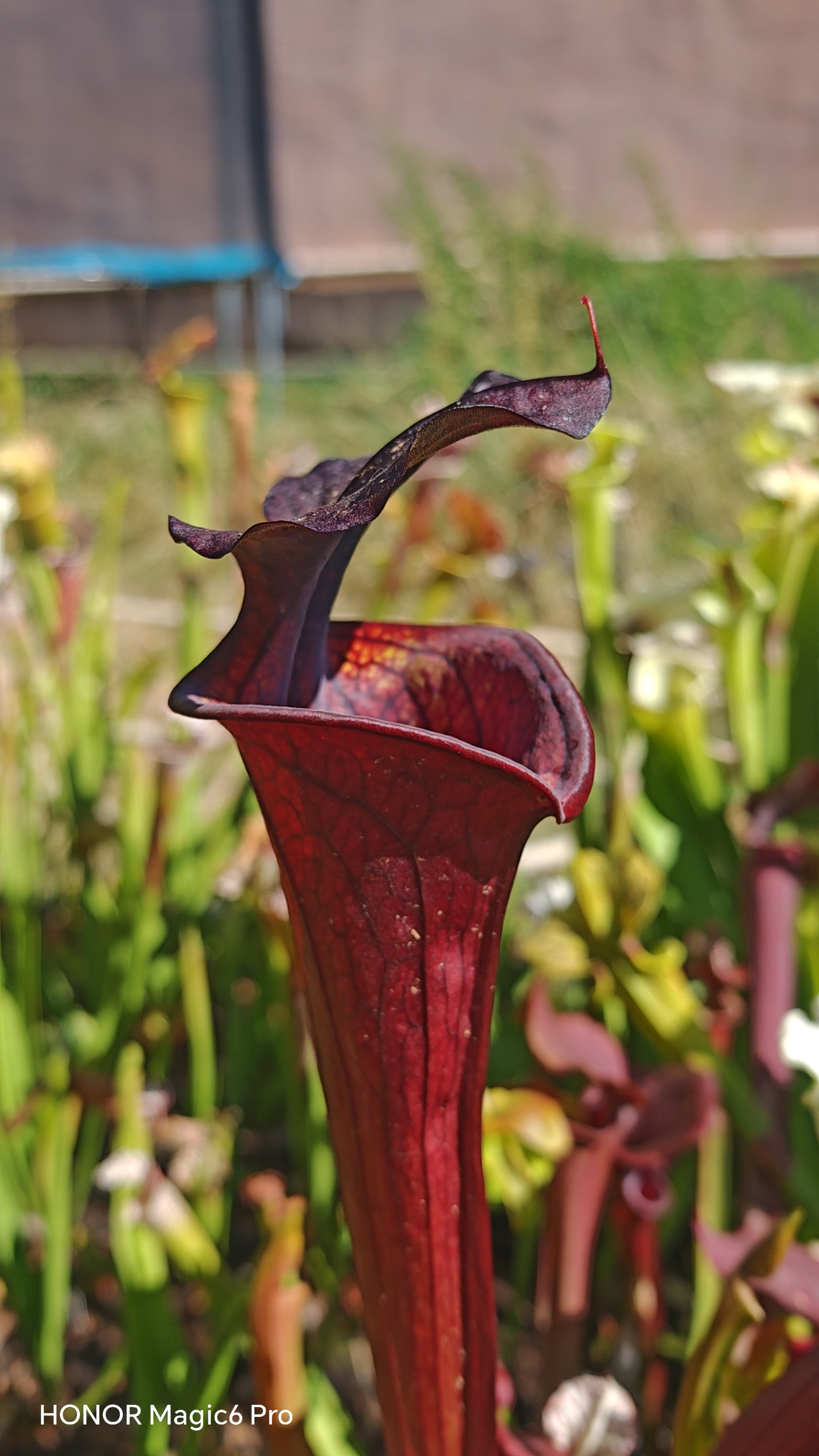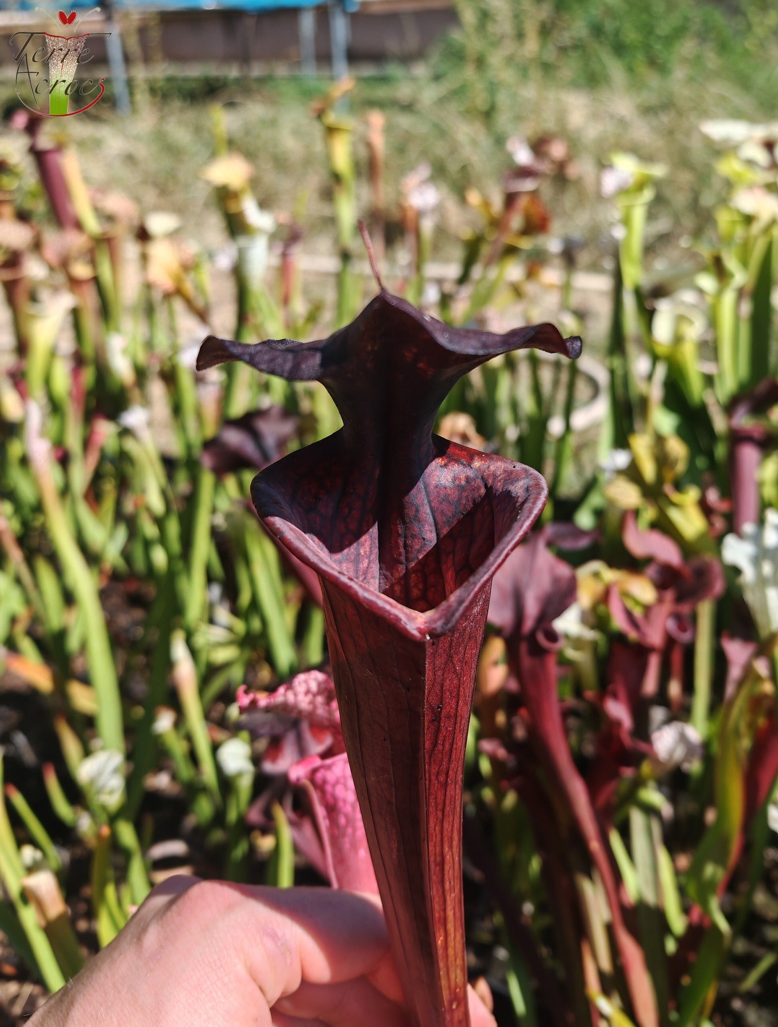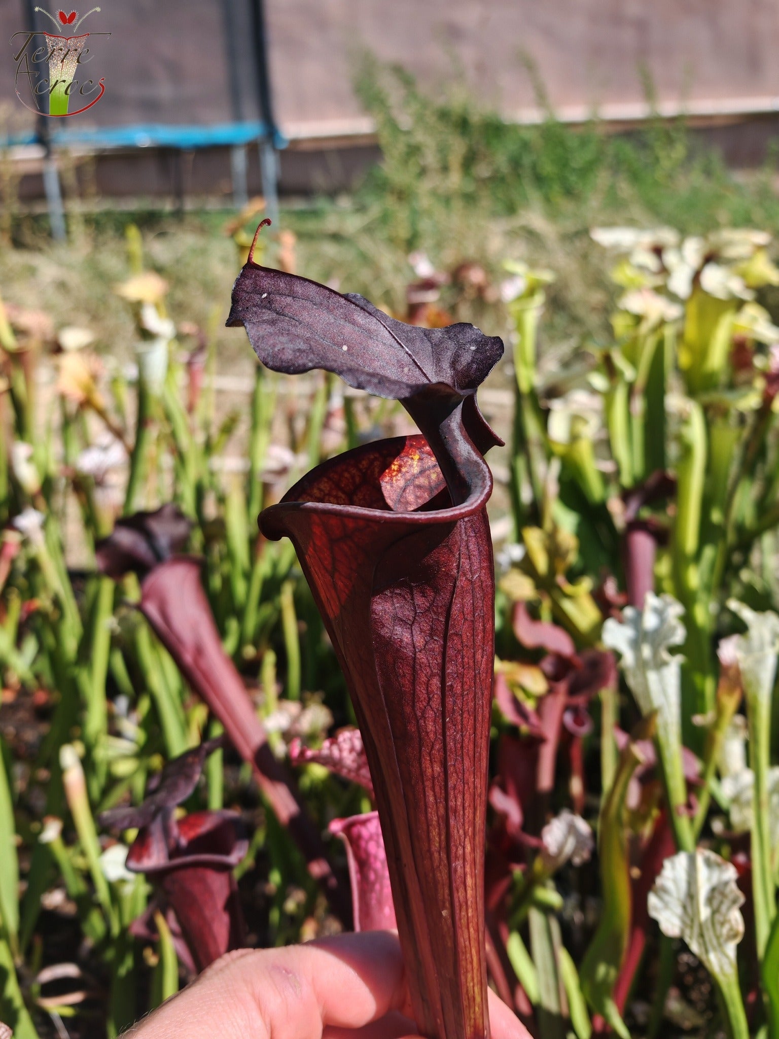 Magnifique Sarracenia hybride inconnu et unique. Avec sa forme plutôt original et ses couleurs : rouge très foncé, intérieur du péristome jaunâtre veiné jusque tard dans la saison et ses veines noires, cette plante se démarque dans les pré sélections 2025. Elle a toutes les caractéristiques pour intégrer la collection de manière permanente et continuera d'être à l'observation dans les années à venir.