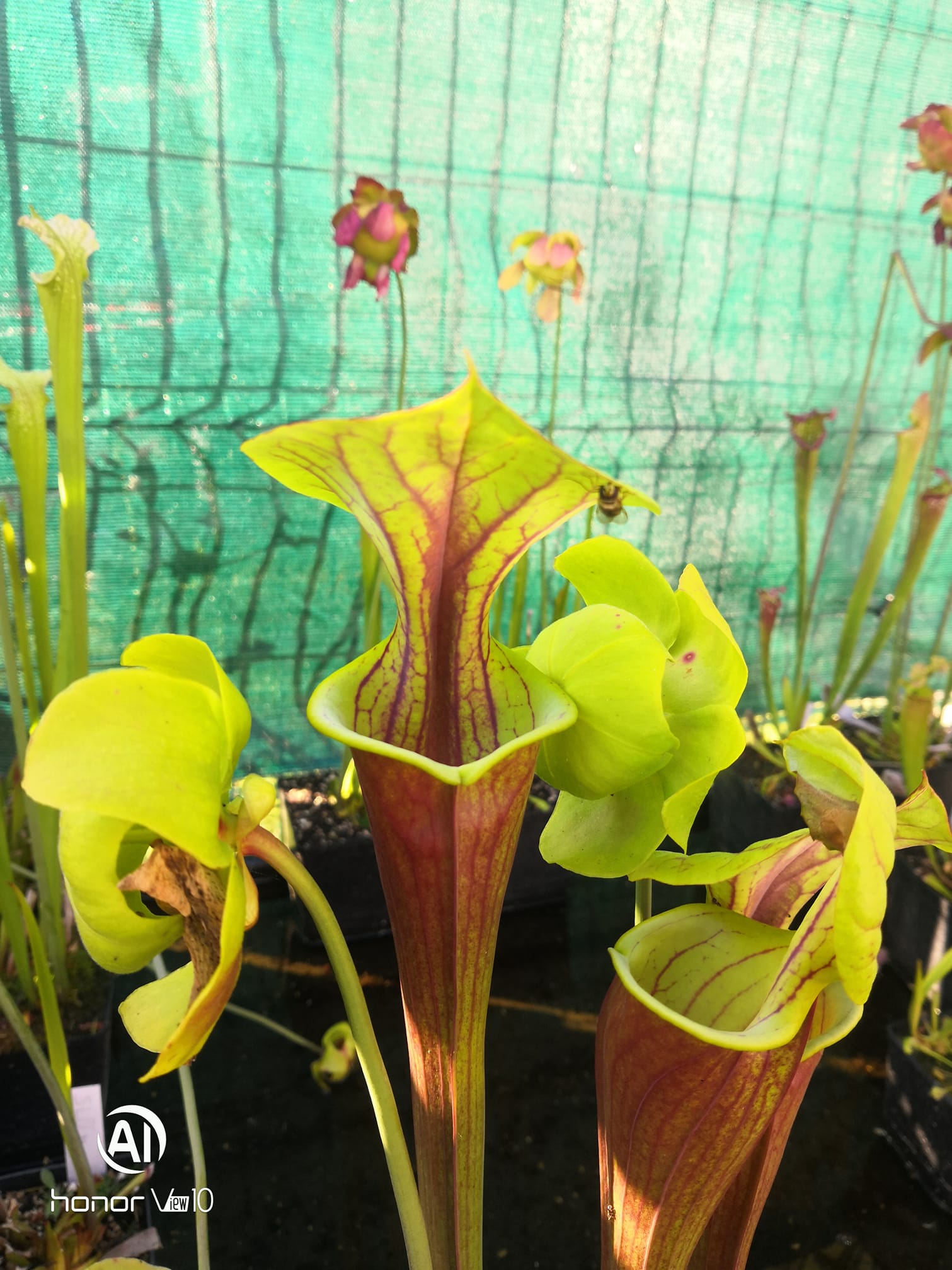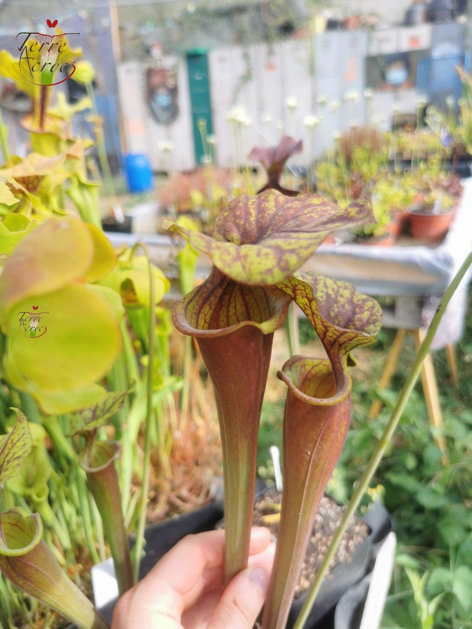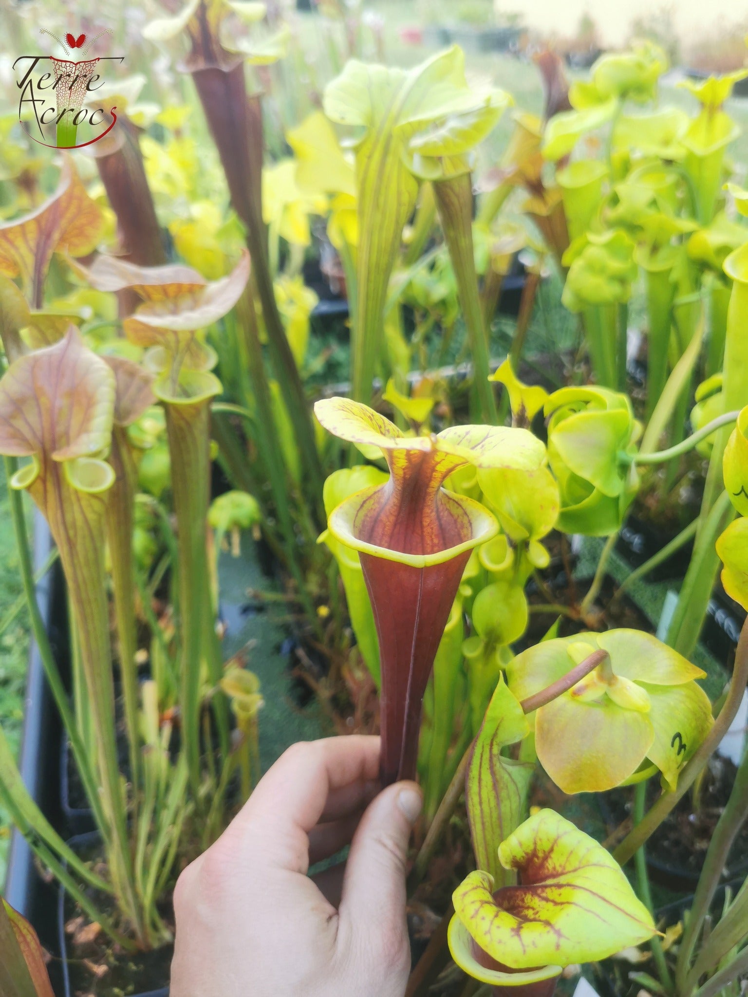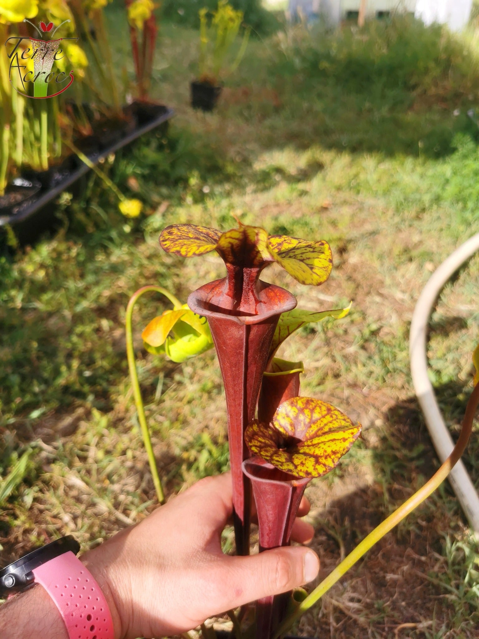 Un superbe Sarracenia flava var. atropurpurea qui se colorera d’un rouge très sombre en fonction de son exposition au soleil.