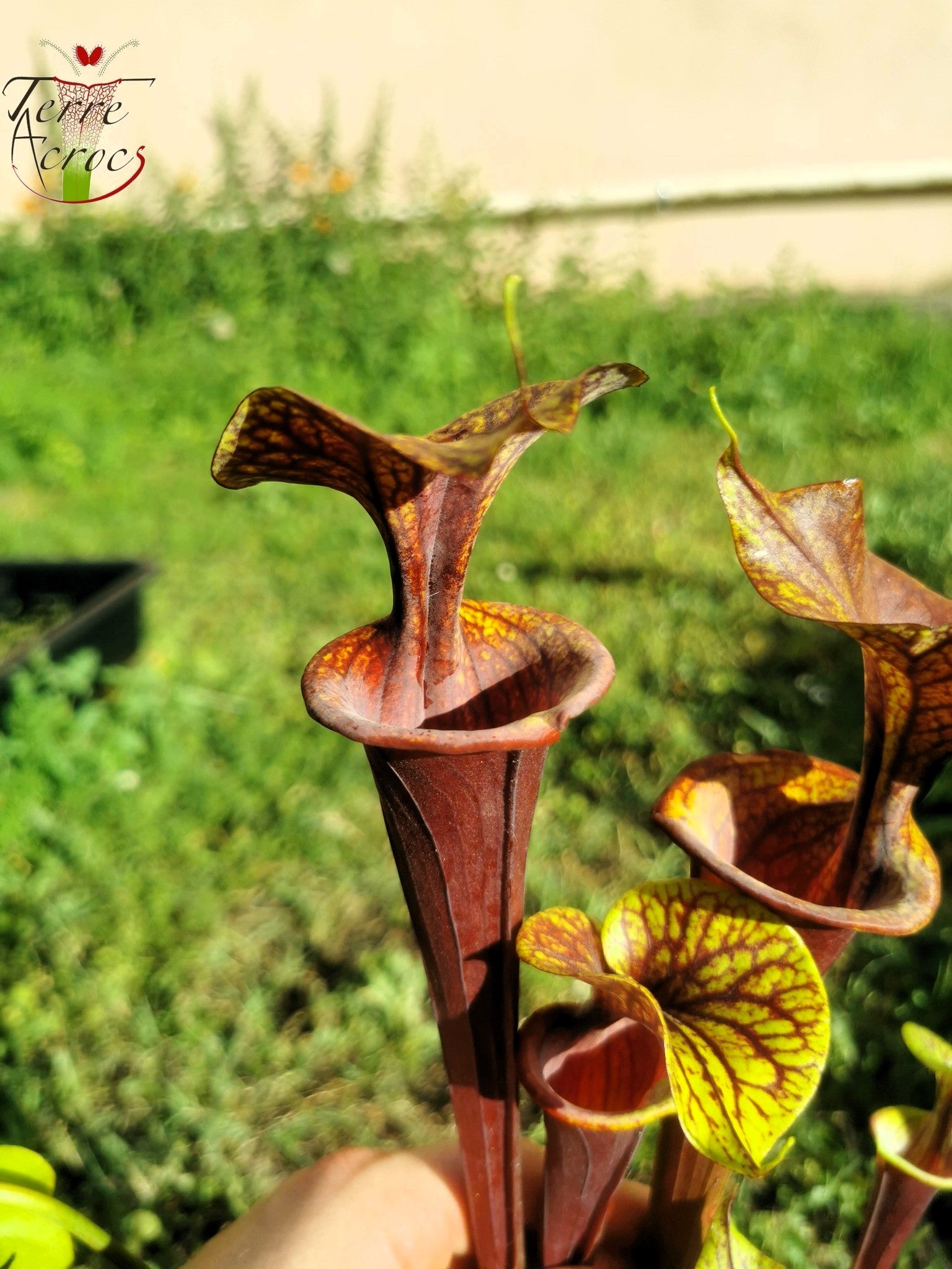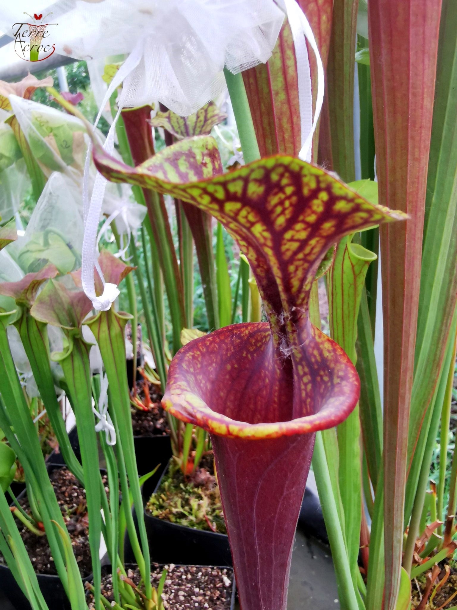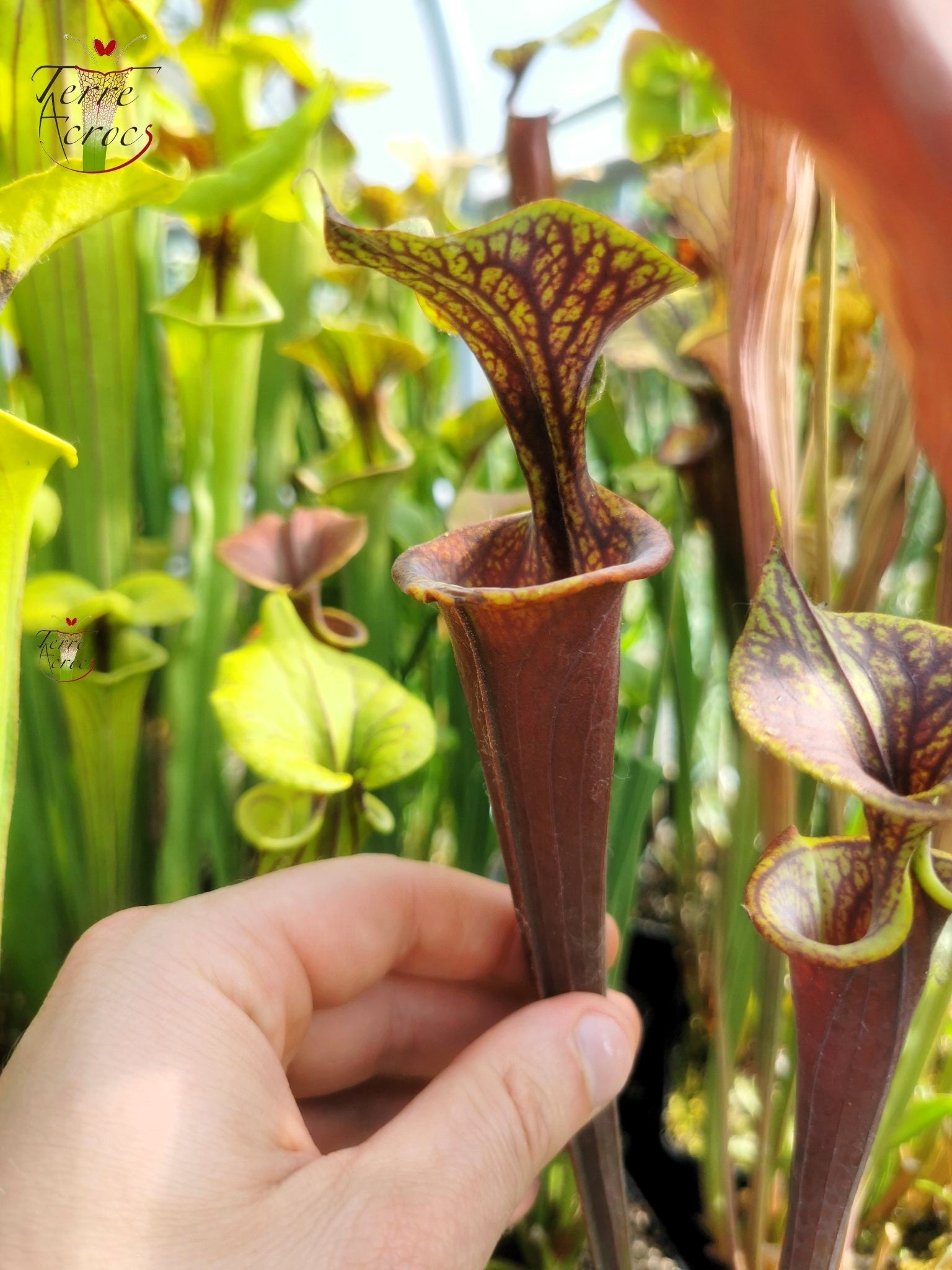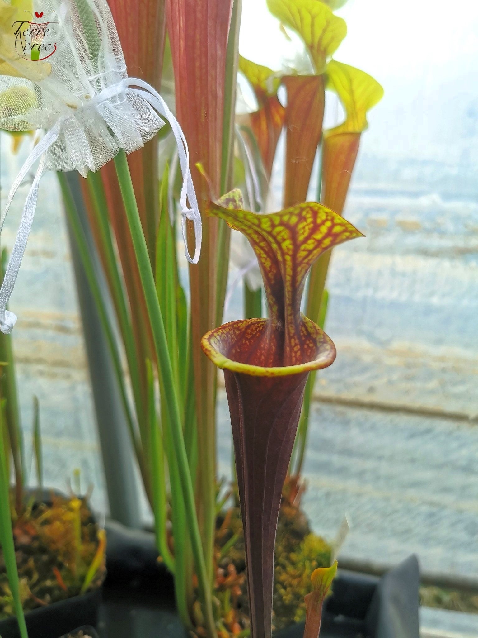 Un magnifique Sarracenia flava var. atropupurea à la coloration rouge très foncé. L'opercule très veiné et une partie de la lèvre peuvent rester jaunes. Un grand classique en collection qui entre dans la catégorie des "must have".