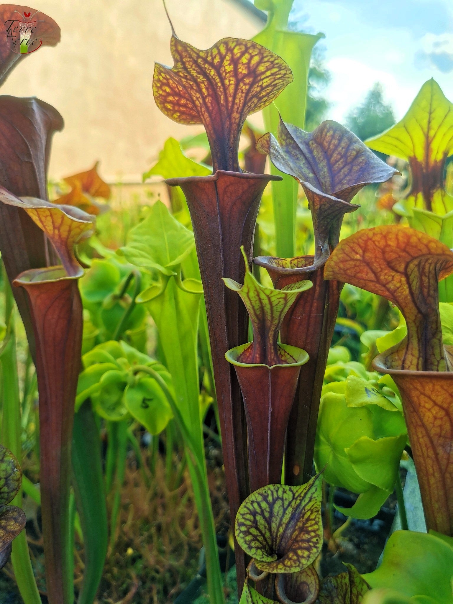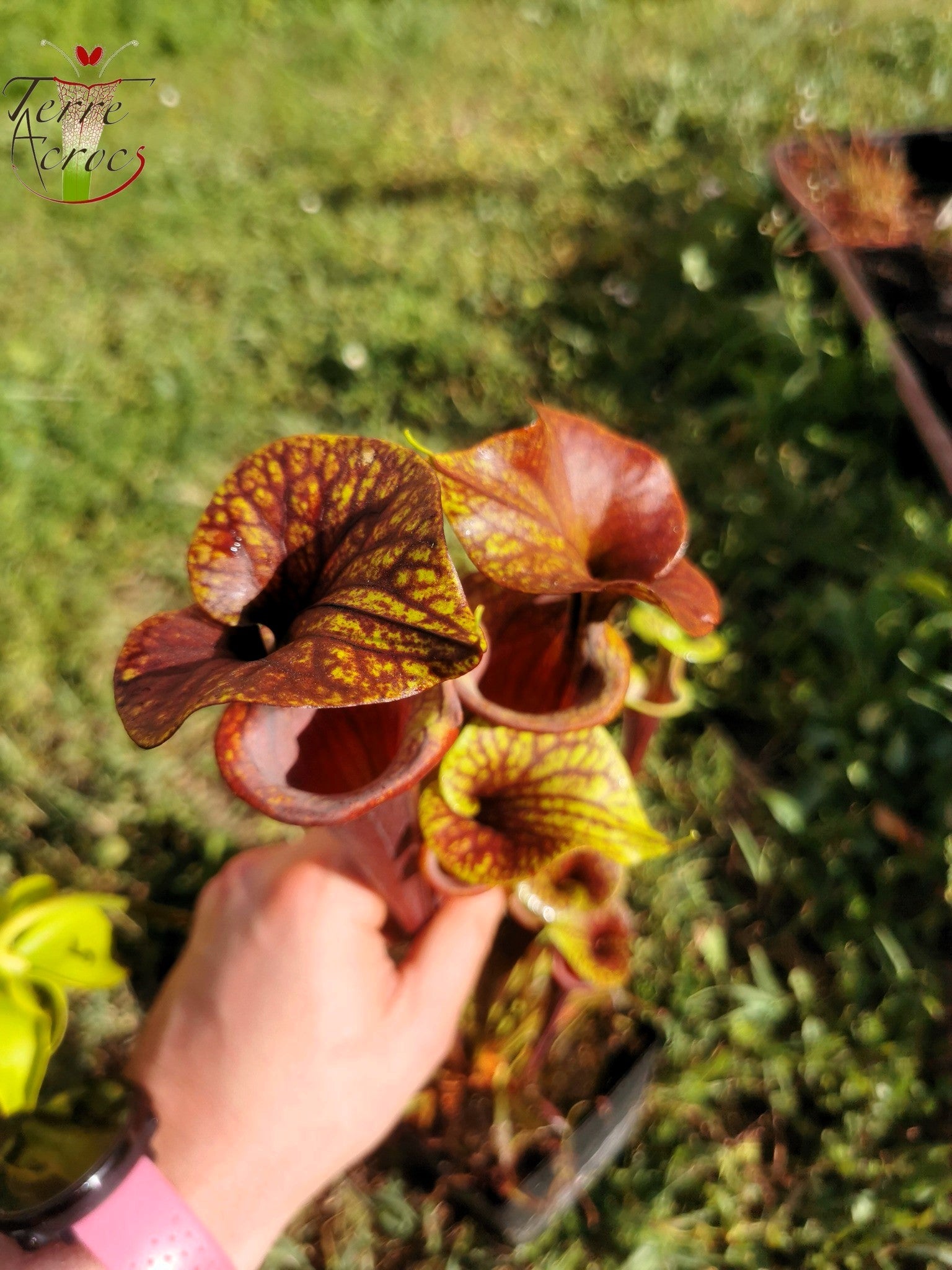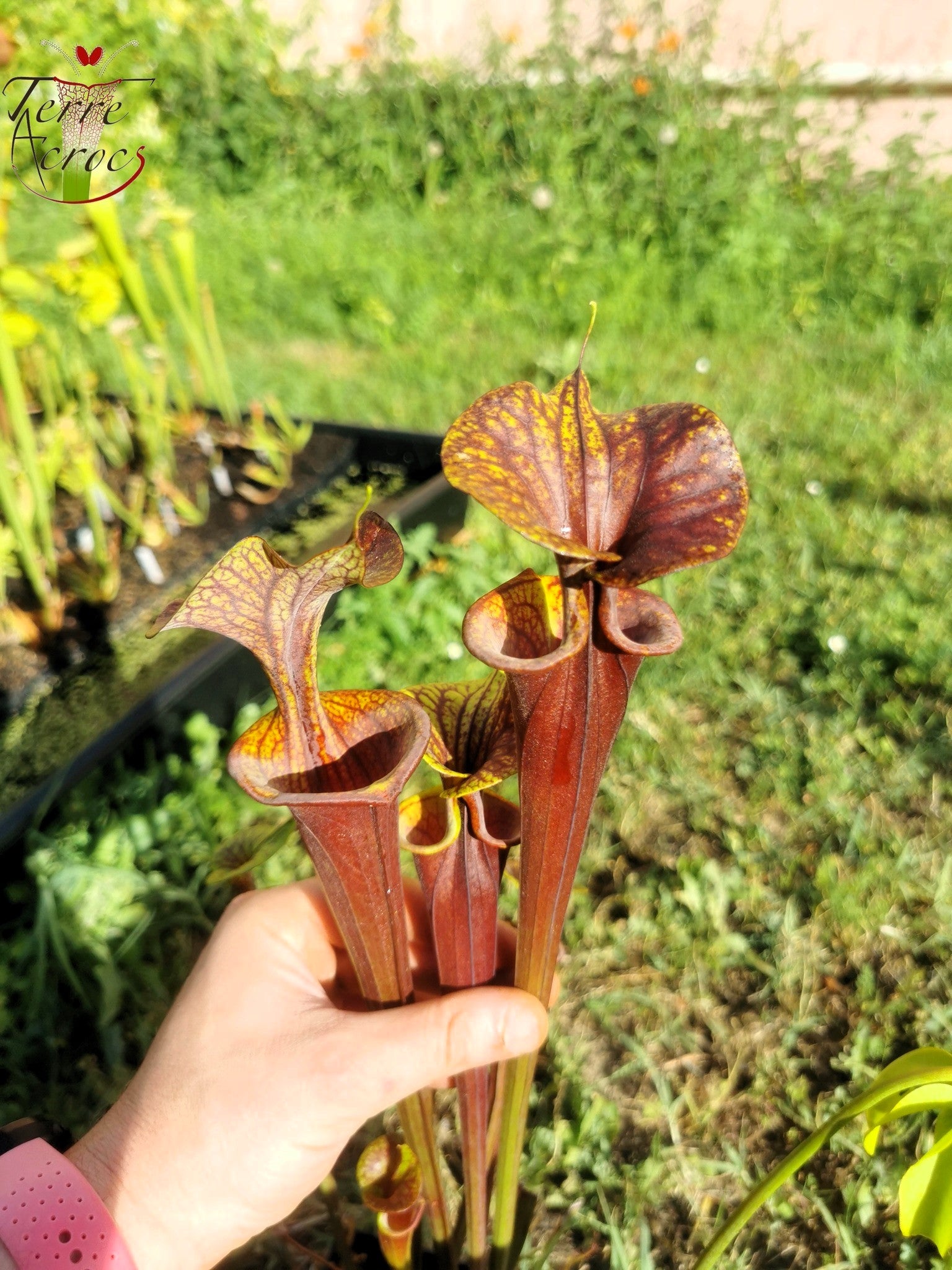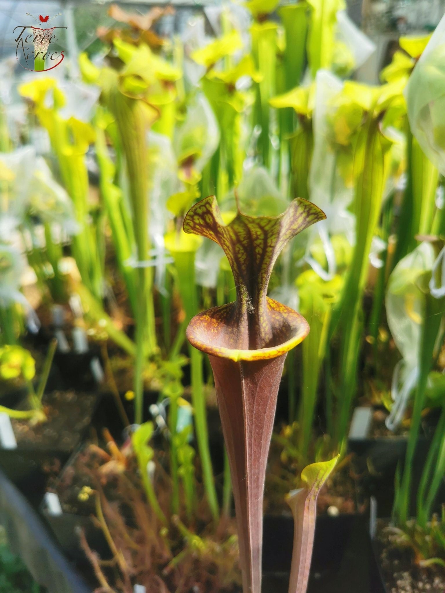 Un magnifique Sarracenia flava var. atropupurea à la coloration rouge très foncé. L'opercule très veiné et une partie de la lèvre peuvent rester jaunes. Un grand classique en collection qui entre dans la catégorie des "must have".