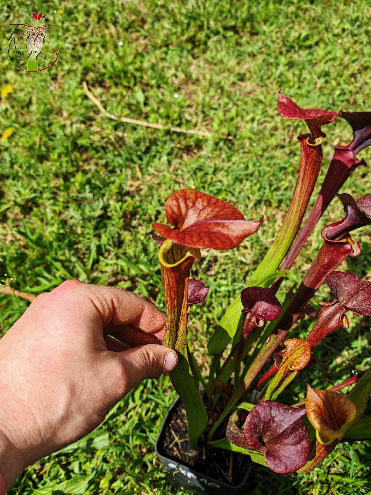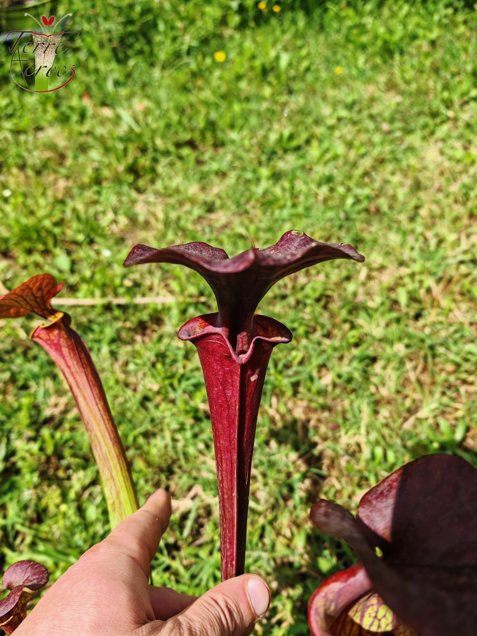 Un bel hybride de Sarracenia flava issu d'une hybridation entre un cuprea et un rubricorpora. Une plante qui s'ouvrira avec de belles veines et qui finira rapidement par être d'un rouge bien uniforme.
