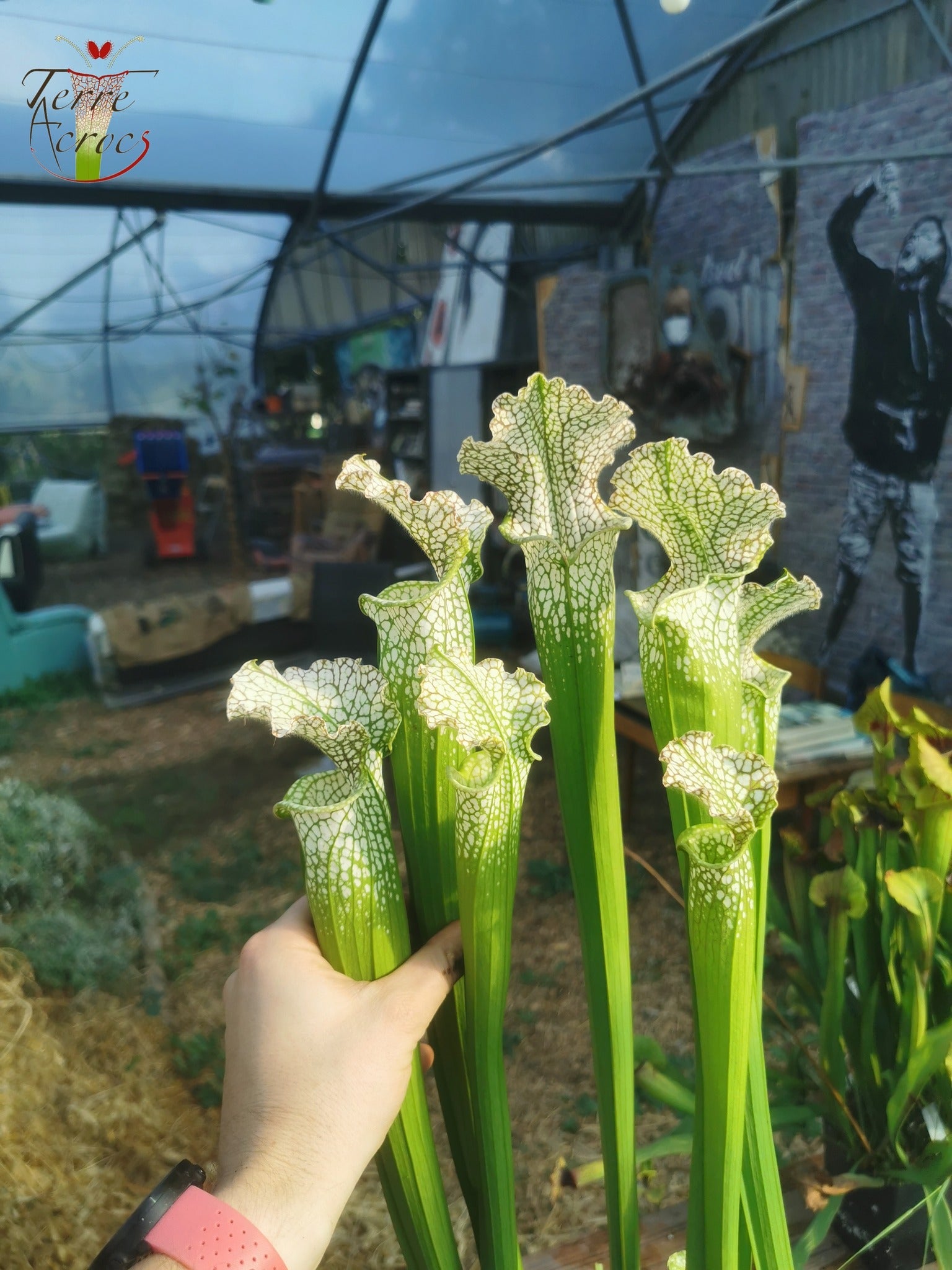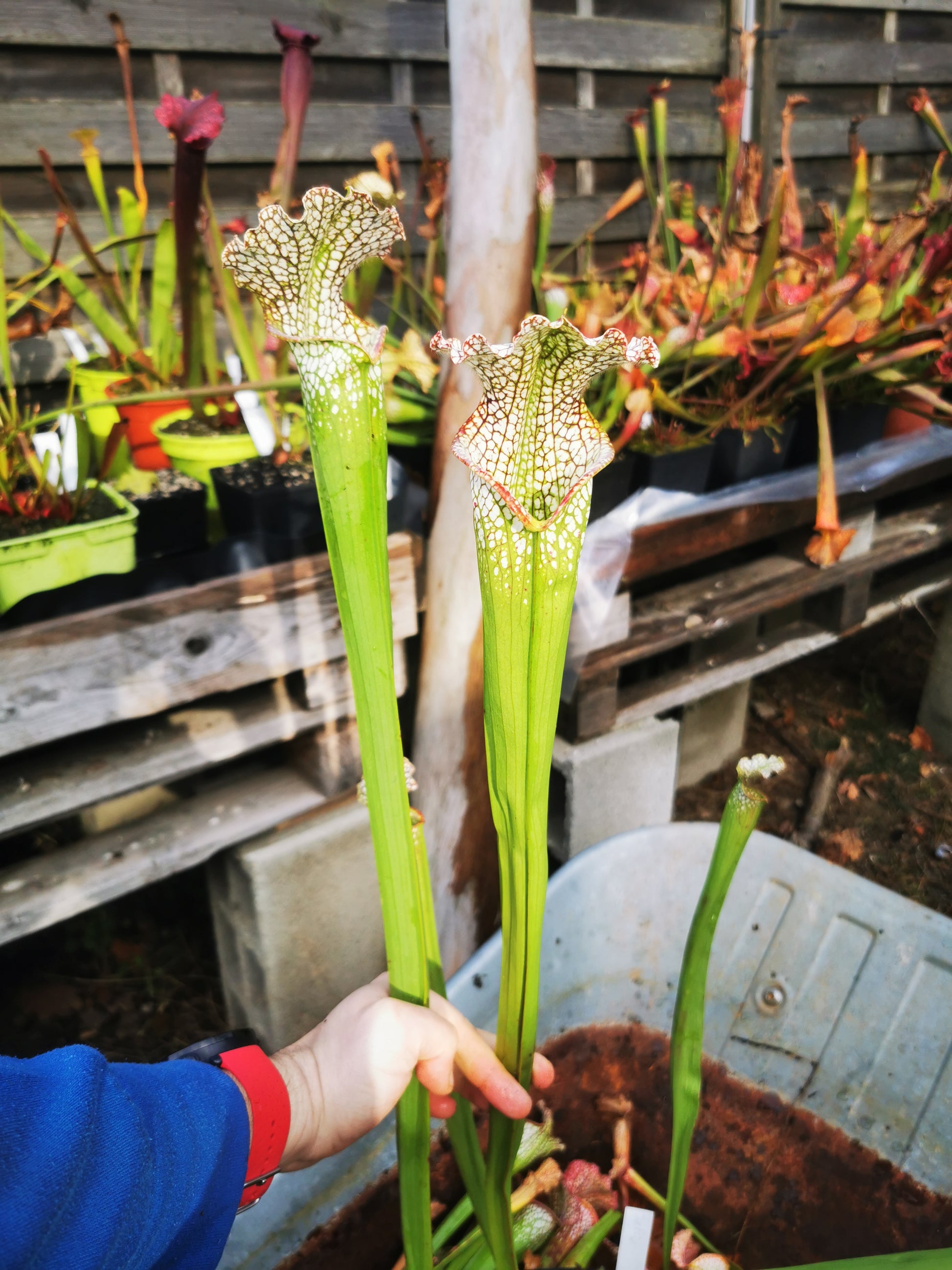 Un Sarracenia leucophylla cultivé à partir de mes propres graines, spécialement sélectionné pour sa forme et sa taille. Cela fait plusieurs années qu’il domine le reste de ma collection en fin d’été. Le péristome est bien prononcé en forme de bec.