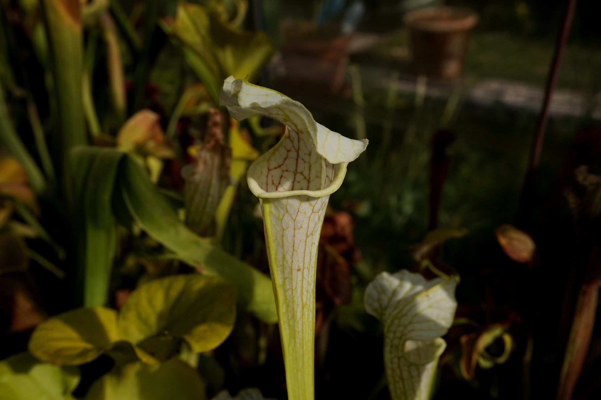 Un sarracenia leucophylla à l’opercule très ondulé. En maturant les pièges acquièrent une tache rose dans la gorge.