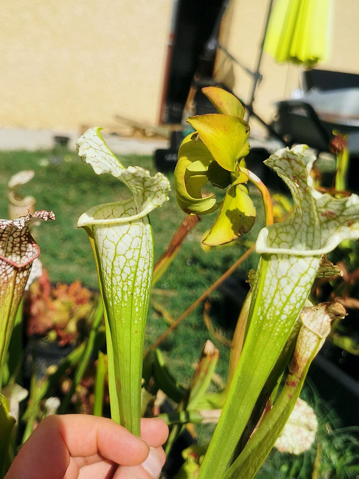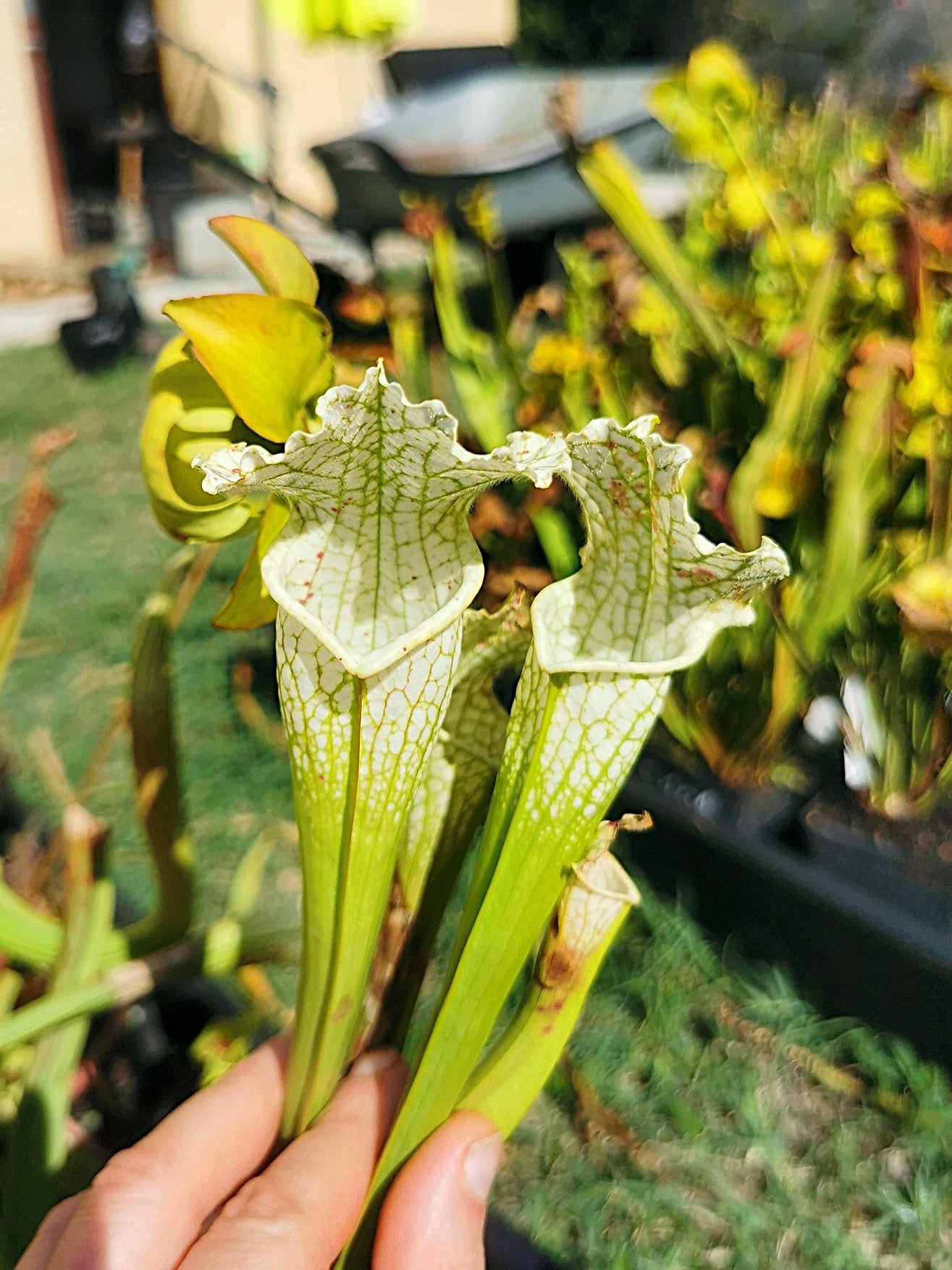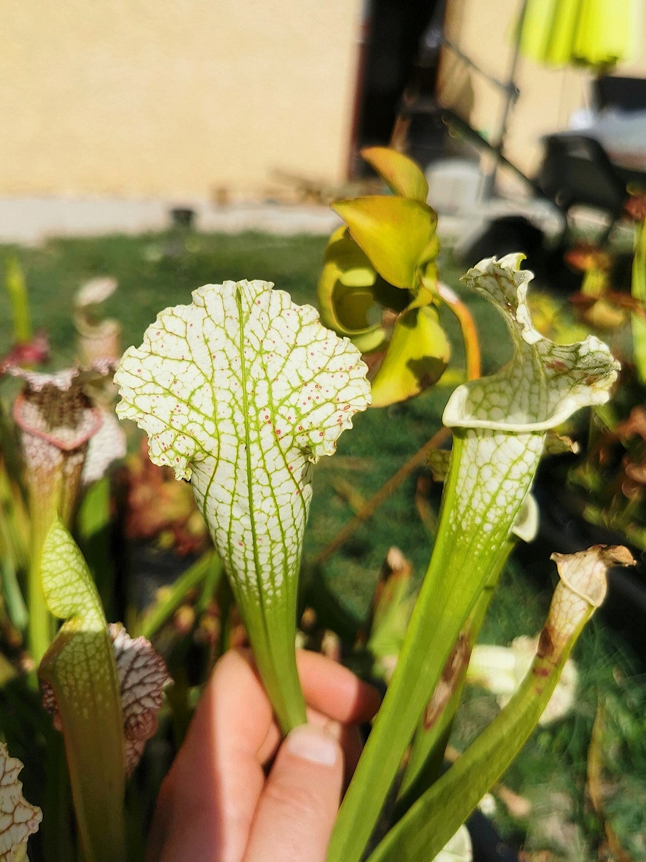 Un sarracenia leucophylla 'Hurricane Creek White' issu d'un semis vigoureux, croisé avec lui même.