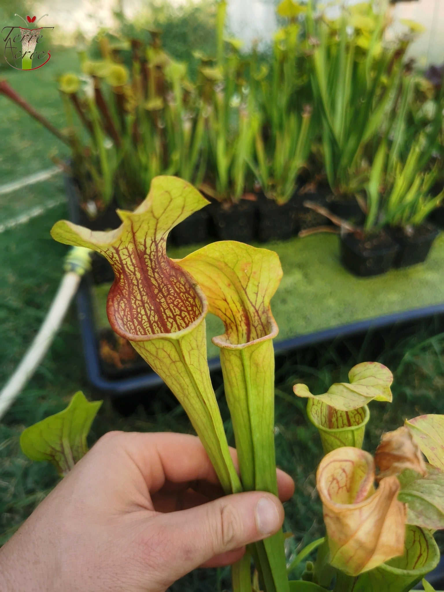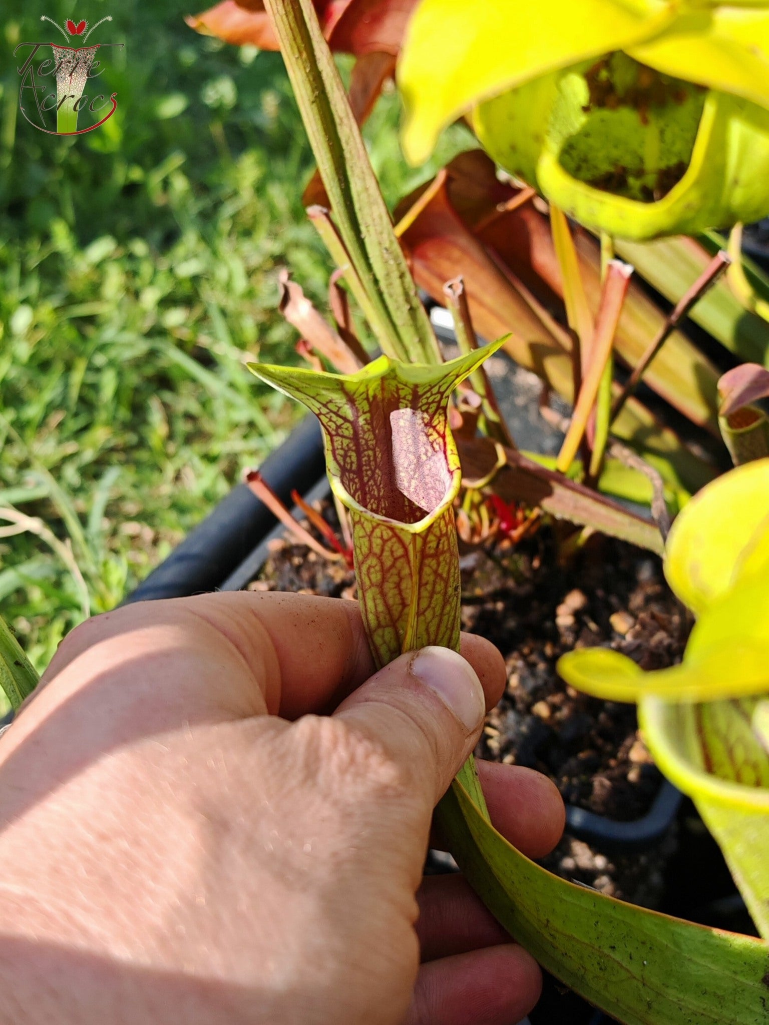 Un joli Sarracenia oreophila avec un veinage assez prononcé dans la partie interne des pièges et de la gorge mais les veines sont peu marquées sur la partie extérieure.