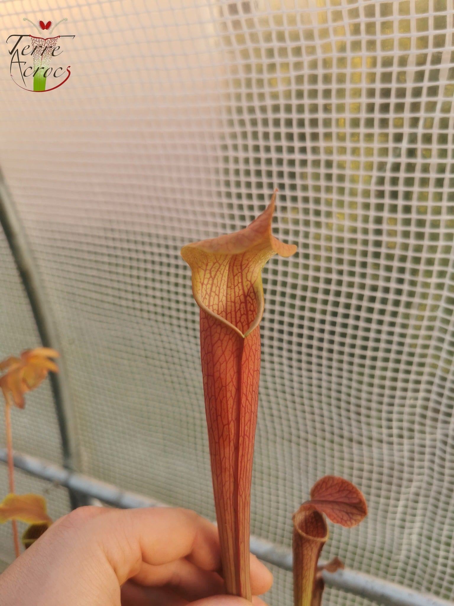 Un joli Sarracenia rubra avec des urnes plutôt grandes, de couleur rouge sombre et au veinage délicat.