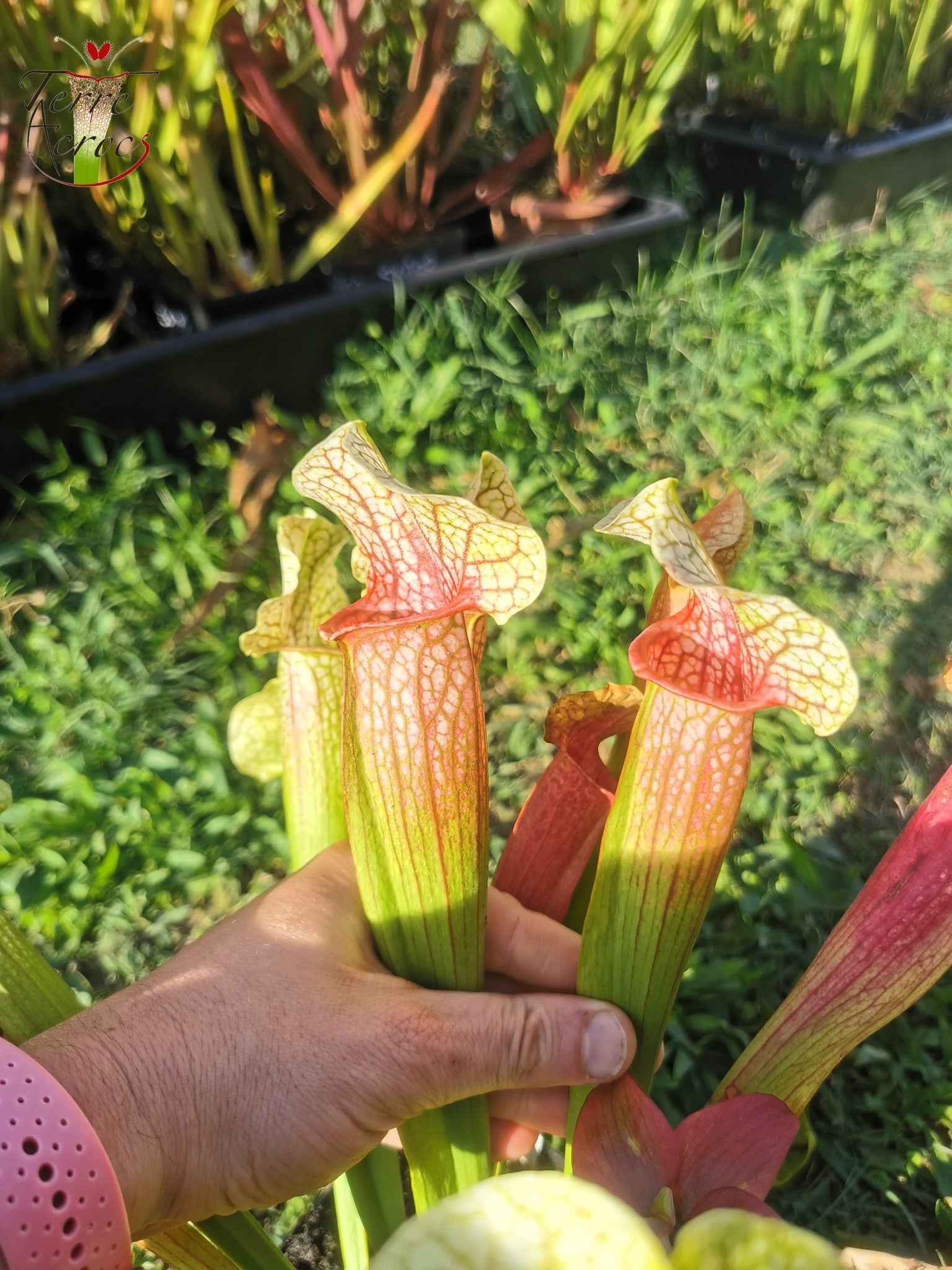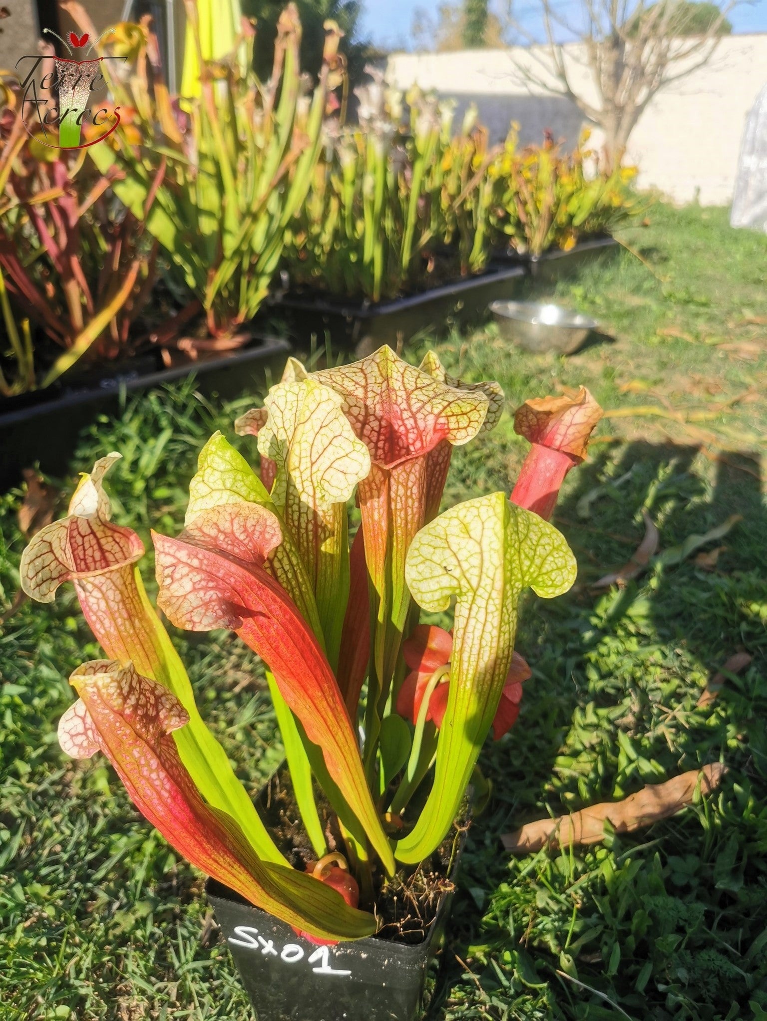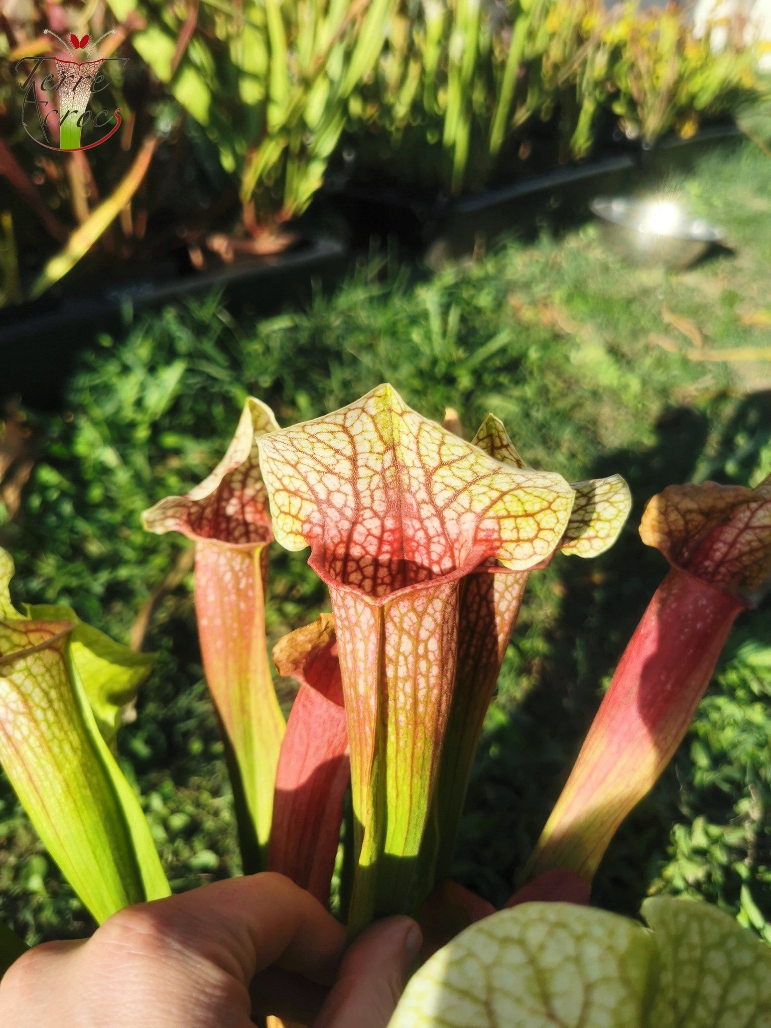 Un Sarracenia hybride joliment coloré. Une plante qui se révèlera bien plus à l'aise en tourbière ou dans un pot de bonne taille.
