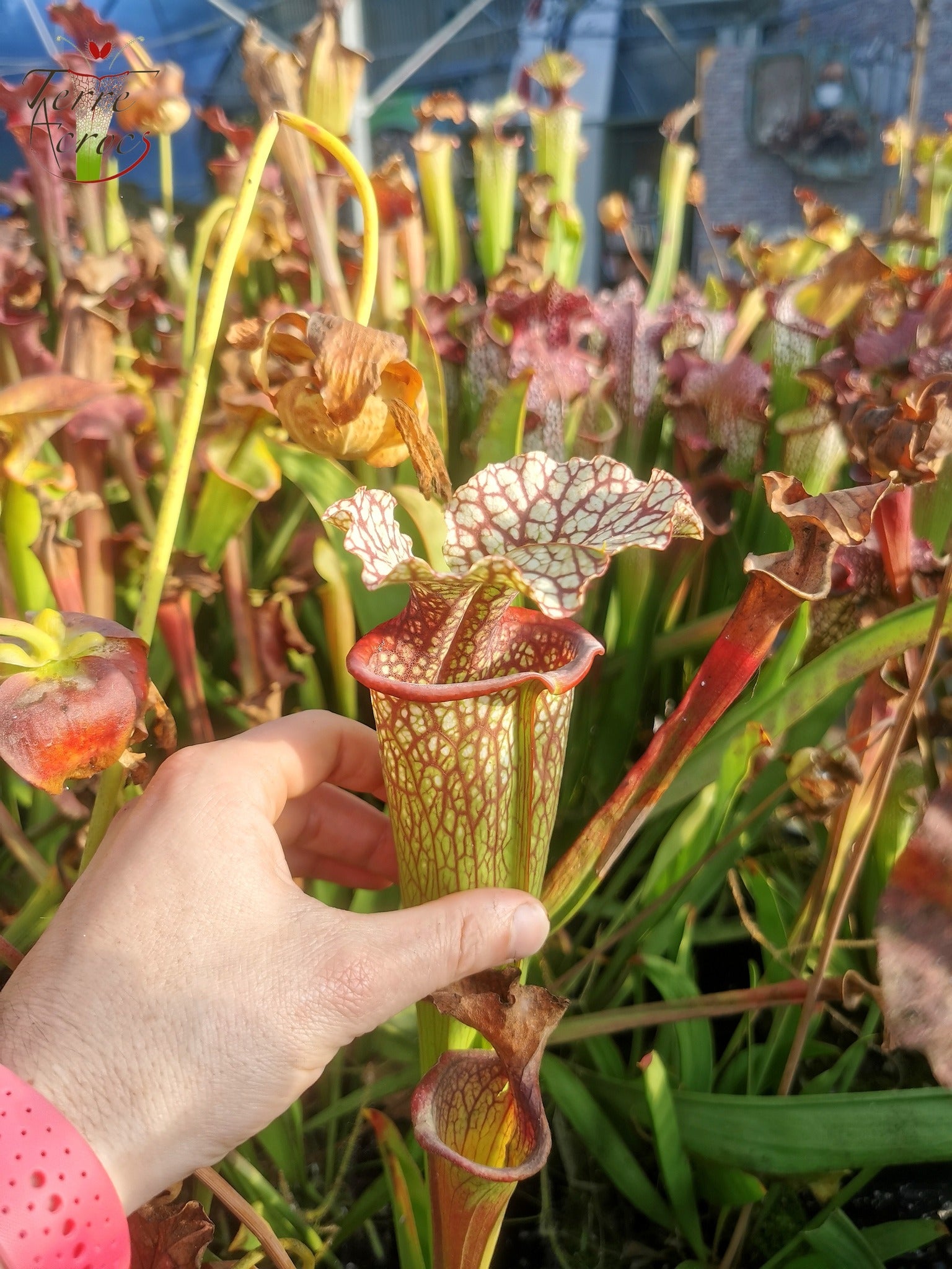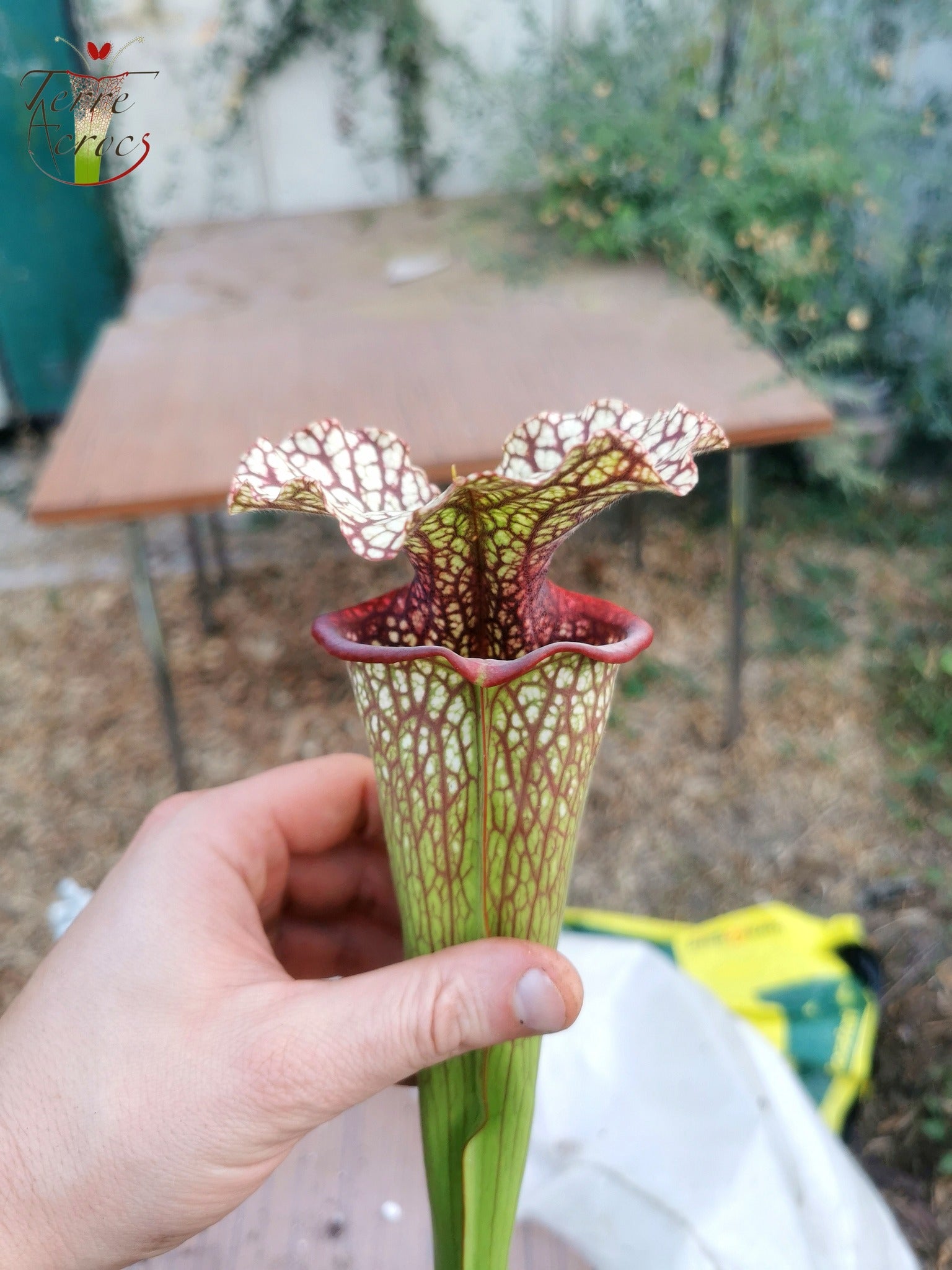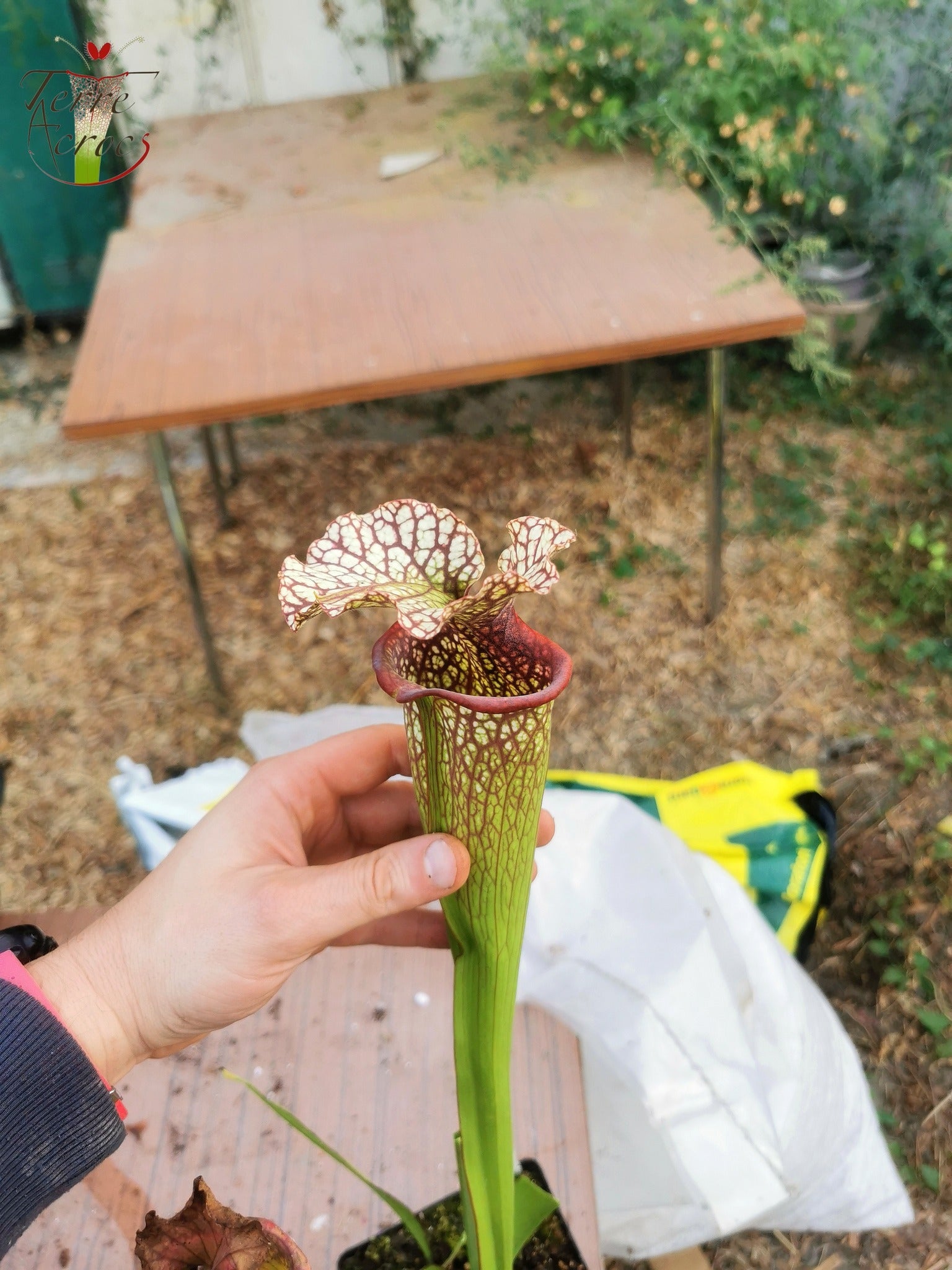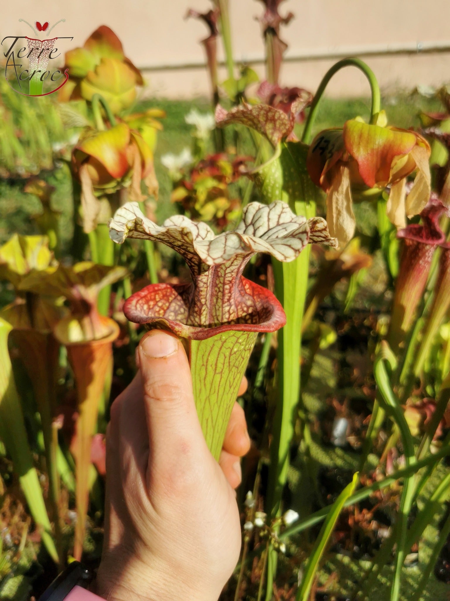 Un gros hybride de Sarracenia leucophylla et Sarracenia oreophila sélectionné par Miroslav Srba sous l'appellation HA40B. Une plante qui peut devenir assez impressionnante dans de bonnes conditions de culture. Les pièges sont hauts et larges et très contrastés entre la lèvre bien rouge et l'opercule bien blanc.