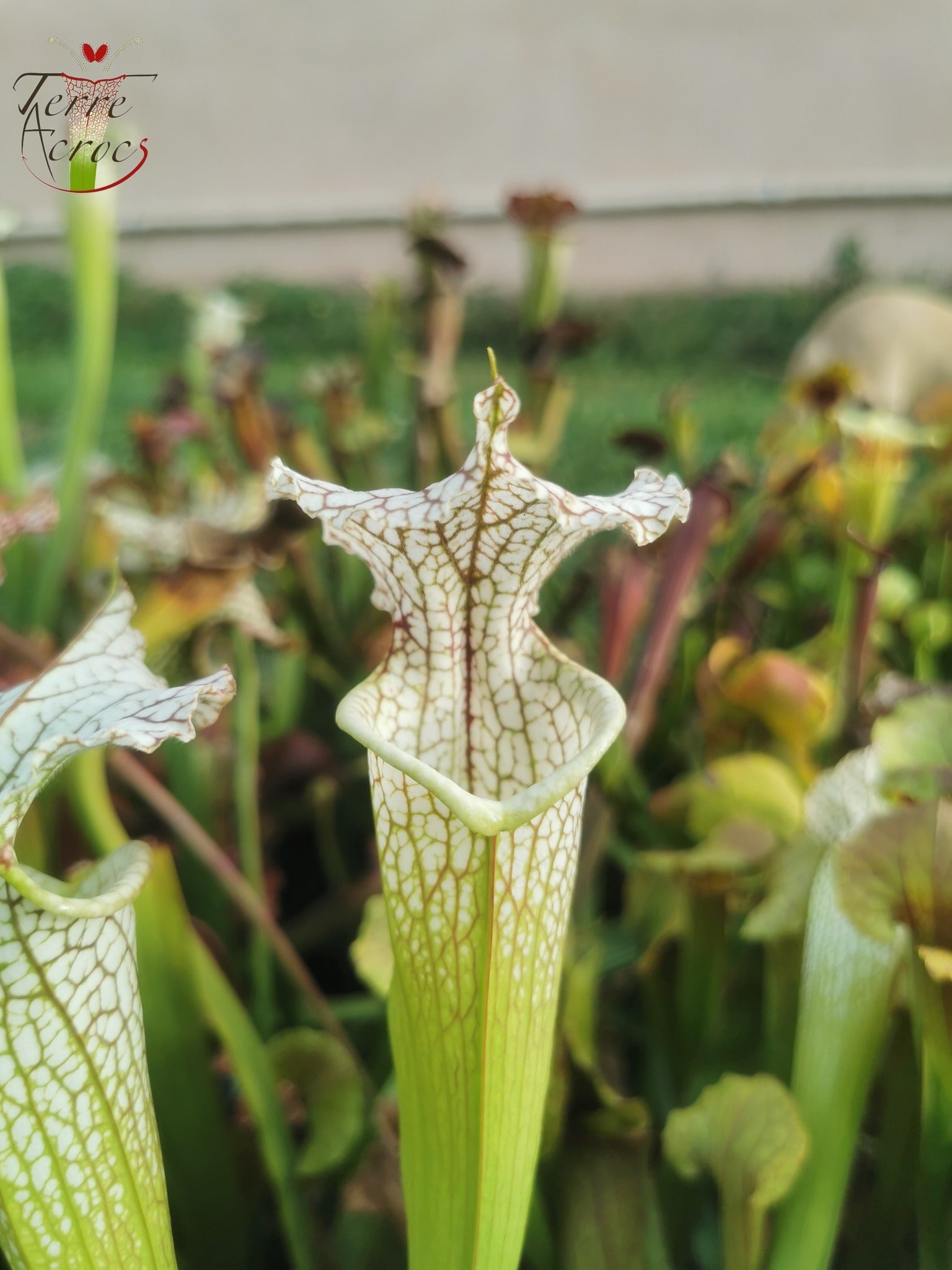Un magnifique Sarracenia issu d'un croisement très intéressant entre le célèbre moorei "A Porais" et le leucophylla L30A de MSrba Ce croisement se retrouve pas mal chez les collectionneurs mais il en existe autant de clones différents que de collectionneurs. Le clone de notre collection est une plante vigoureuse et robuste qui propose facilement des tubes de plus de 80 cm de hauteur et assez massifs le tout en conditions de culture en extérieur. Un fin liseré rouge est présent dans le creux de la gorge.