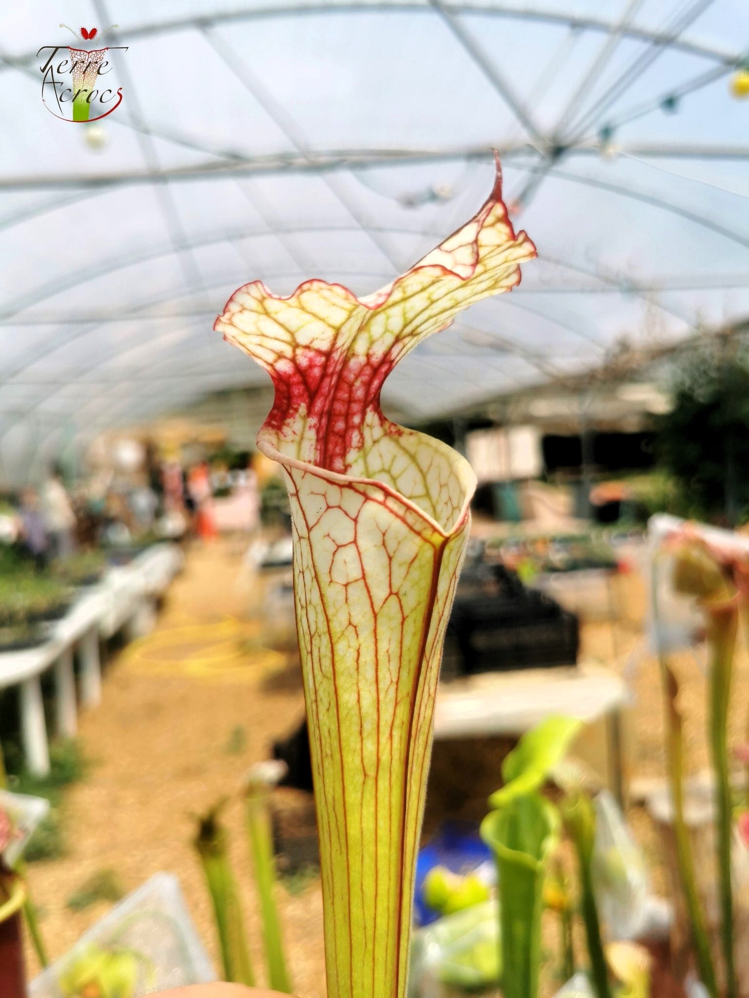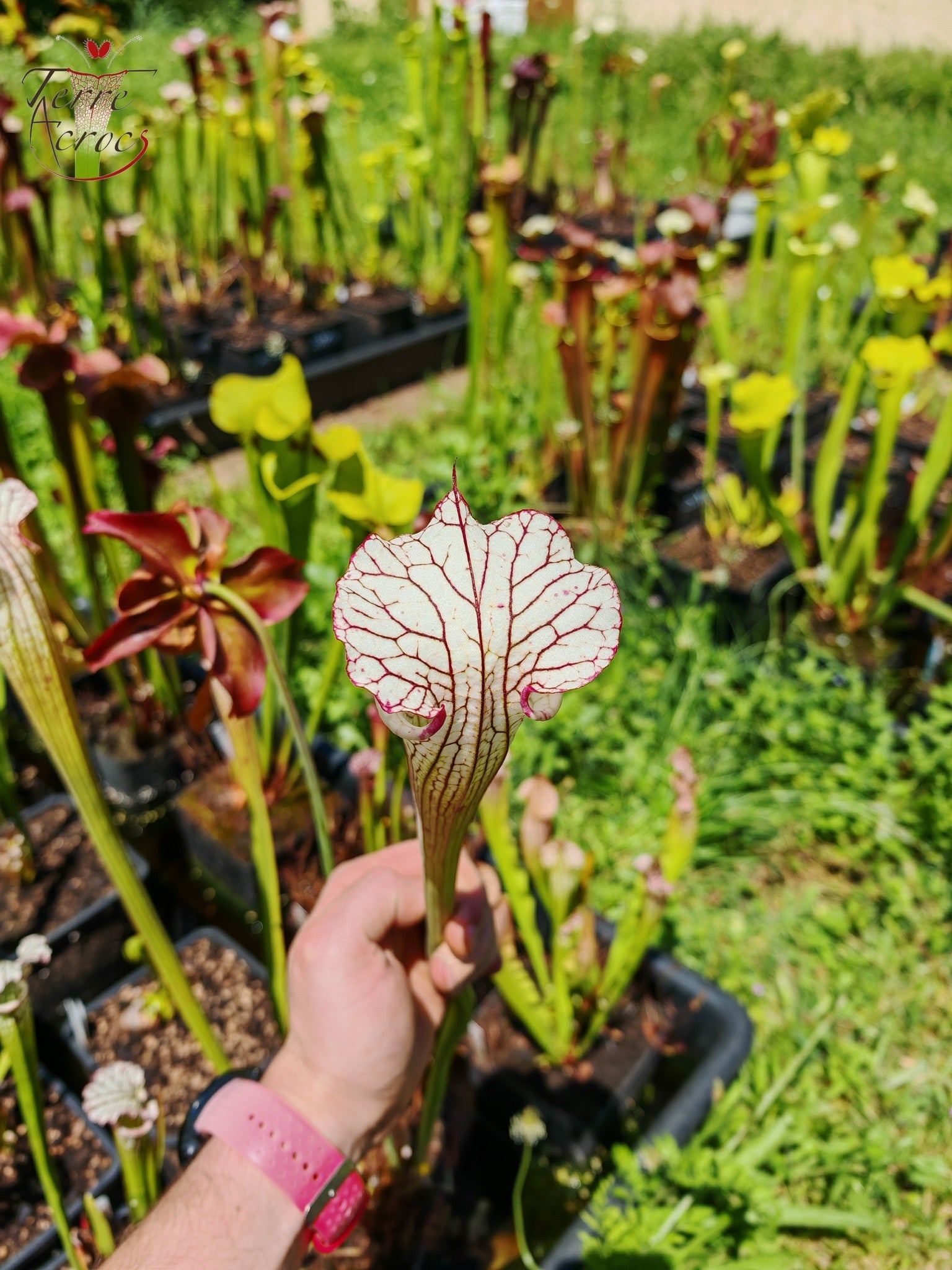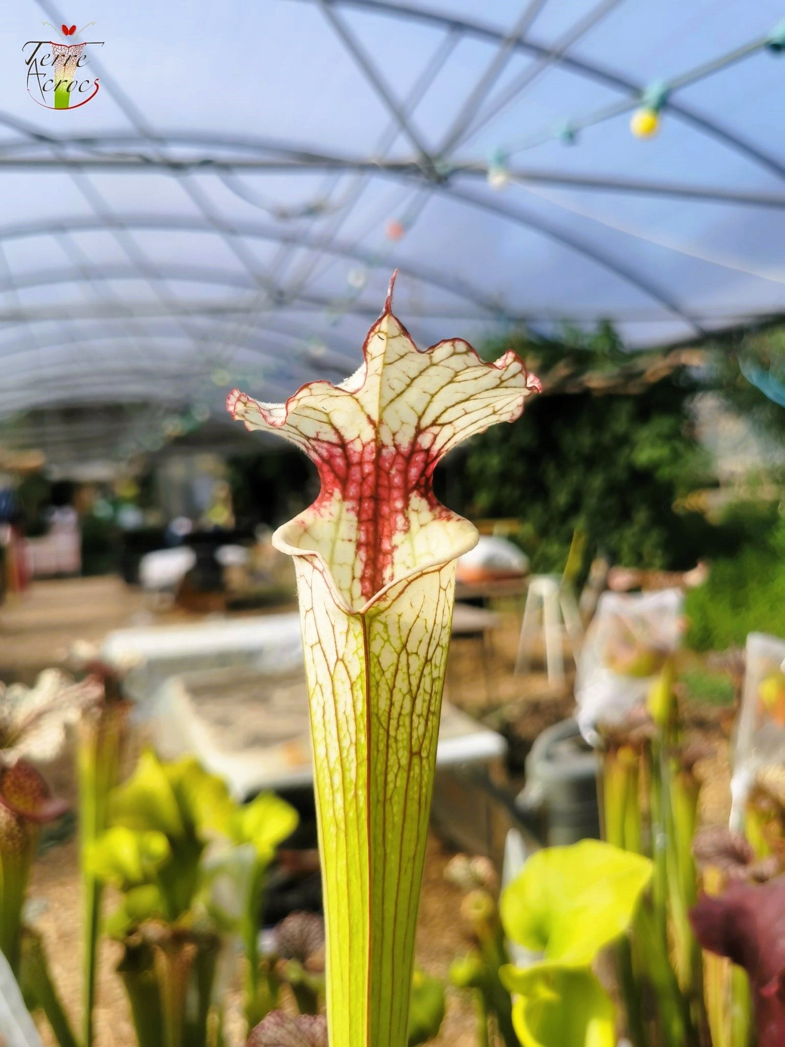 Sarracenia x 'Iamsatyricon' est un fabuleux sarracenia obtenu à partir de graines en 2010 et enregistré en 2017. Il est issu du croisement entre 'Leah Wilkerson' et un leucophylla pubescent (L7, MK). Le caractère pubescent est ici aussi présent (pubescent= urnes poilues, un peu comme une peau de pêche).