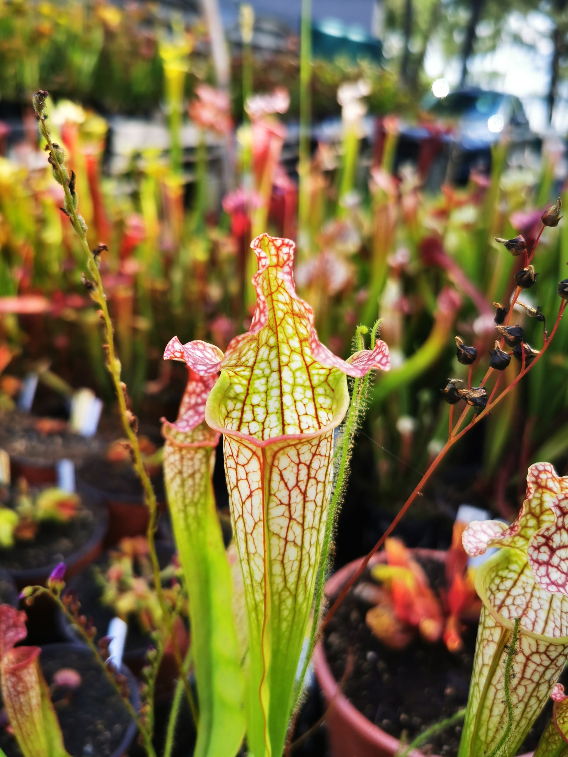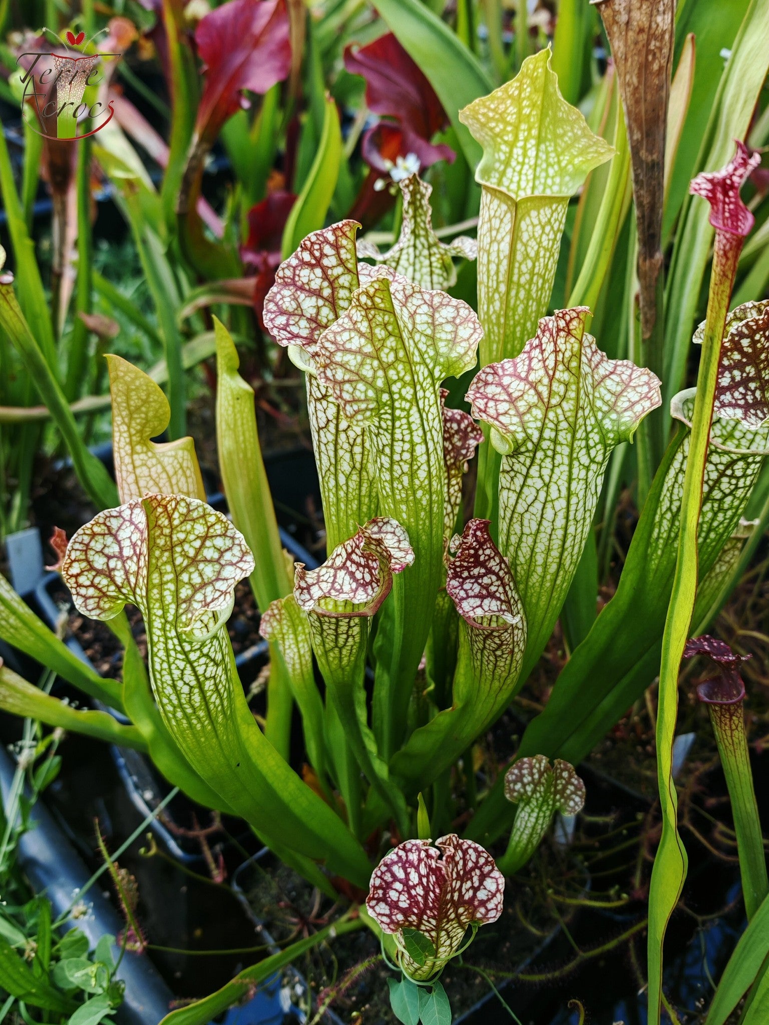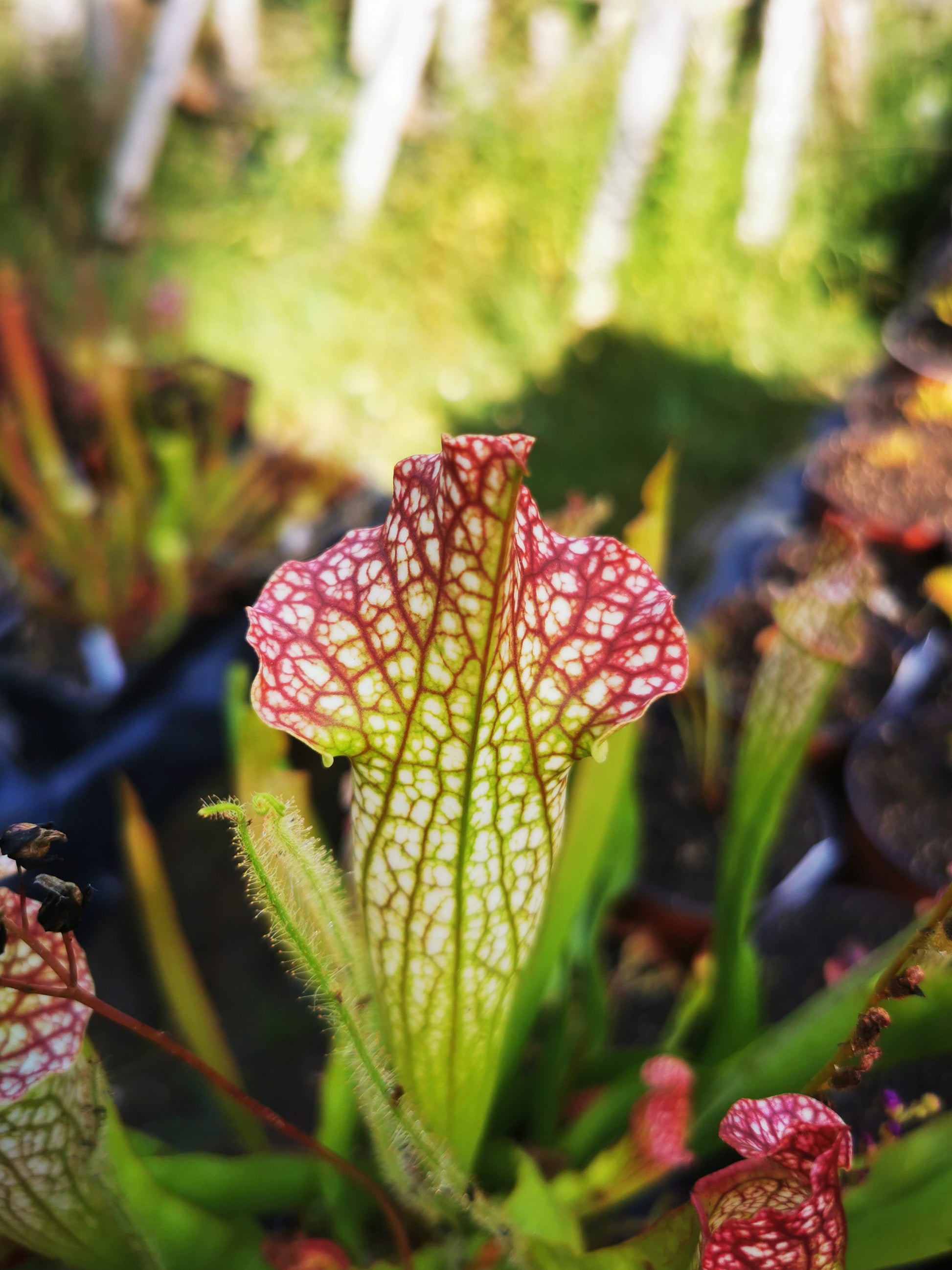 Un sarracenia qui présente un beau dégradé de couleurs du blanc vers le vert et enfin le rouge. Forme trapue. Cette plante est issue d’une sélection de graines personnelles.