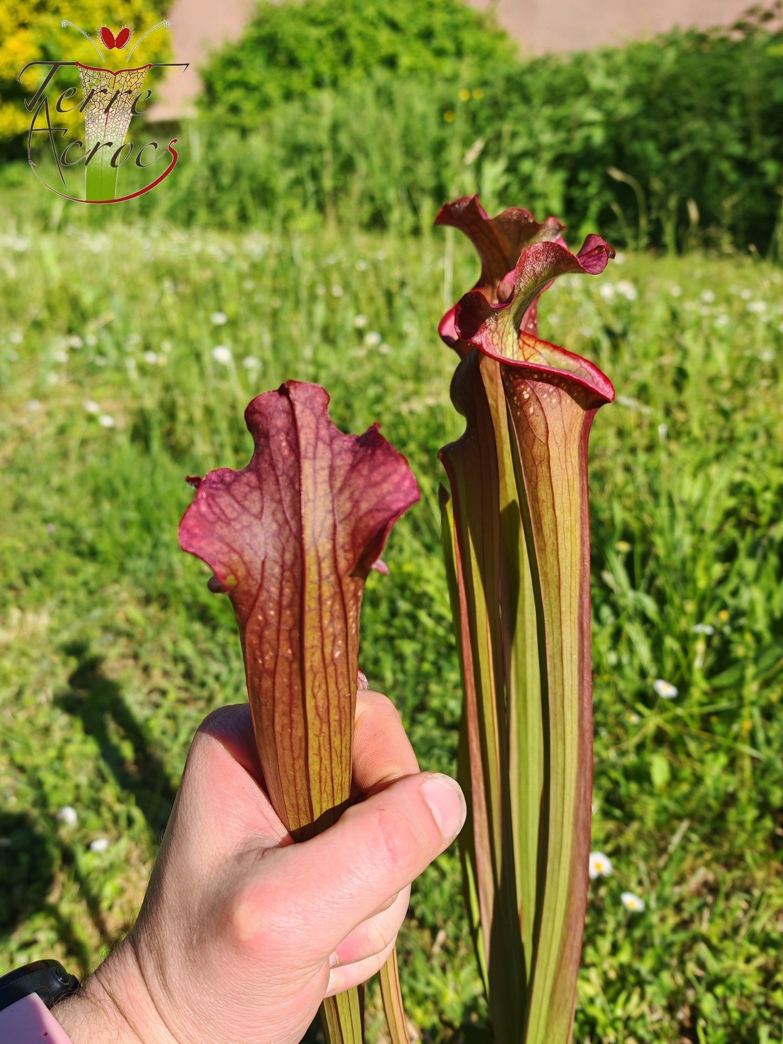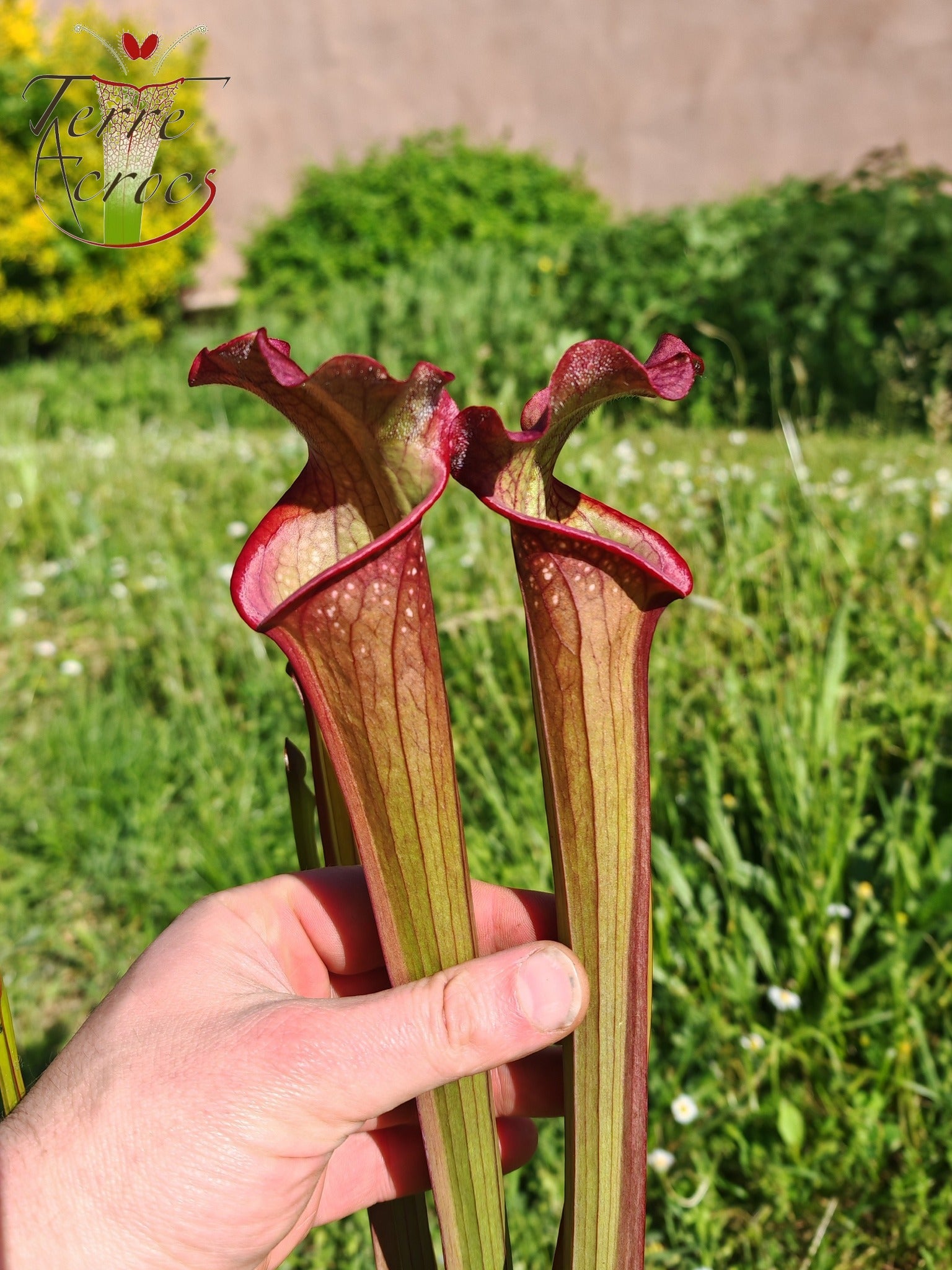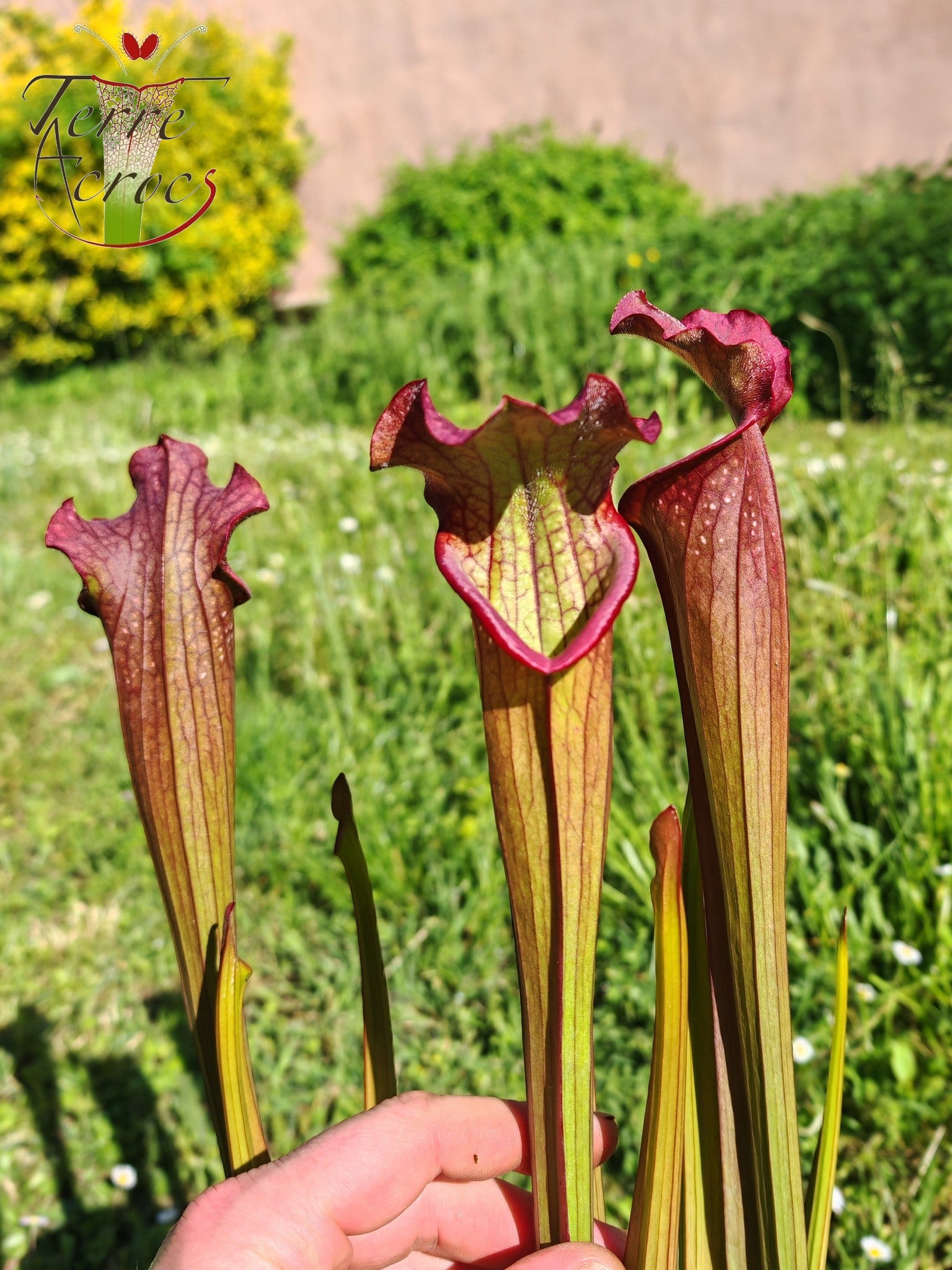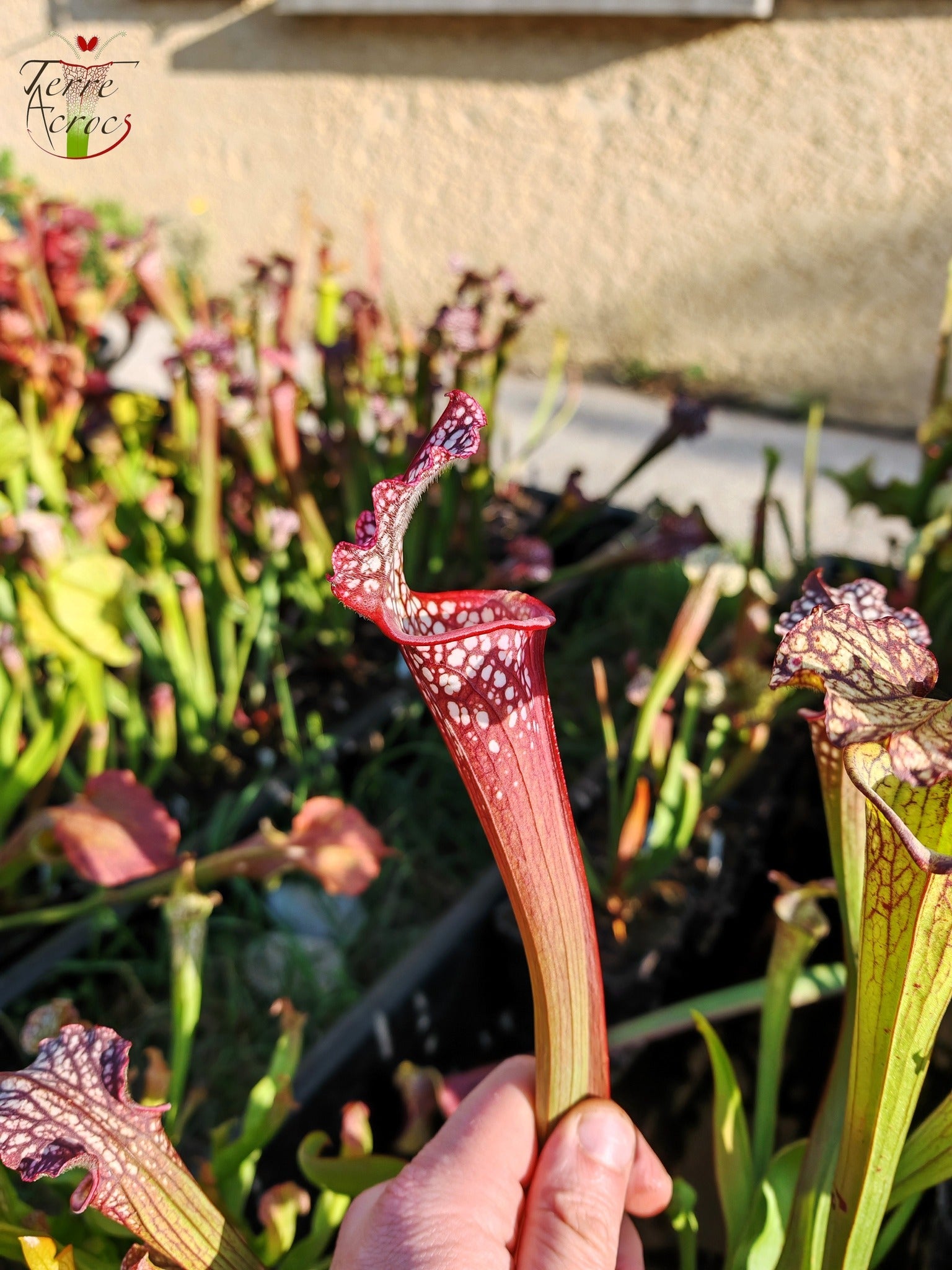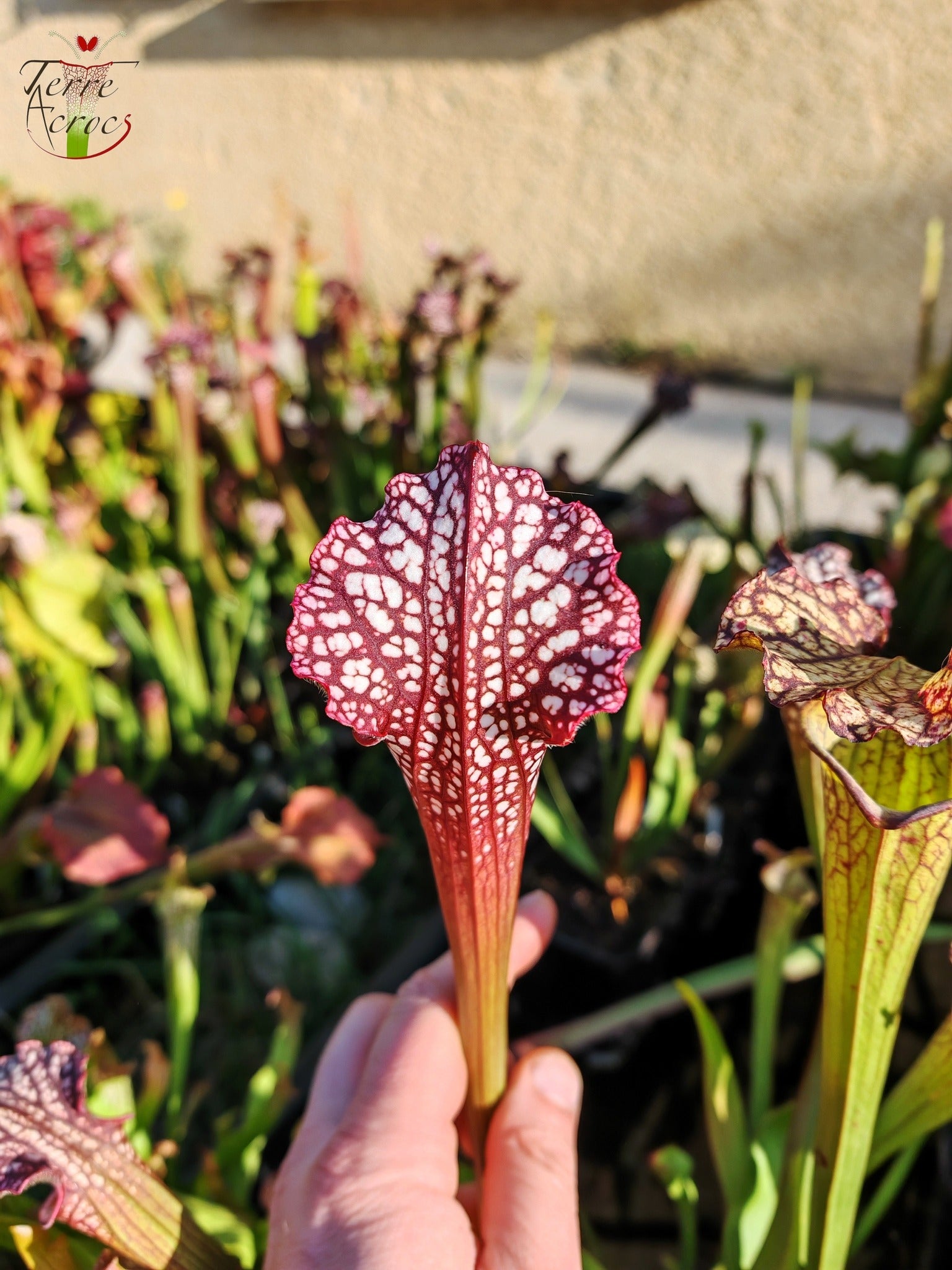 Sarracenia hybride issu de nos semis toujours en observation. Pré sélectionné en collection pour la forme de sa bouche et du péristome qui présentent un angle d'ouverture élevé. La présence de Sarracenia leucophylla dans sa parenté lui apporte une double croissance printanière et automnale.