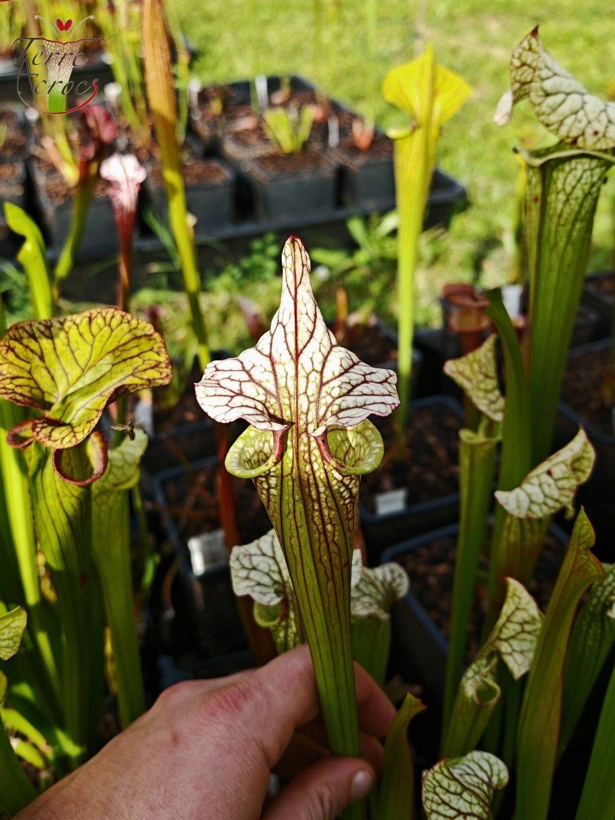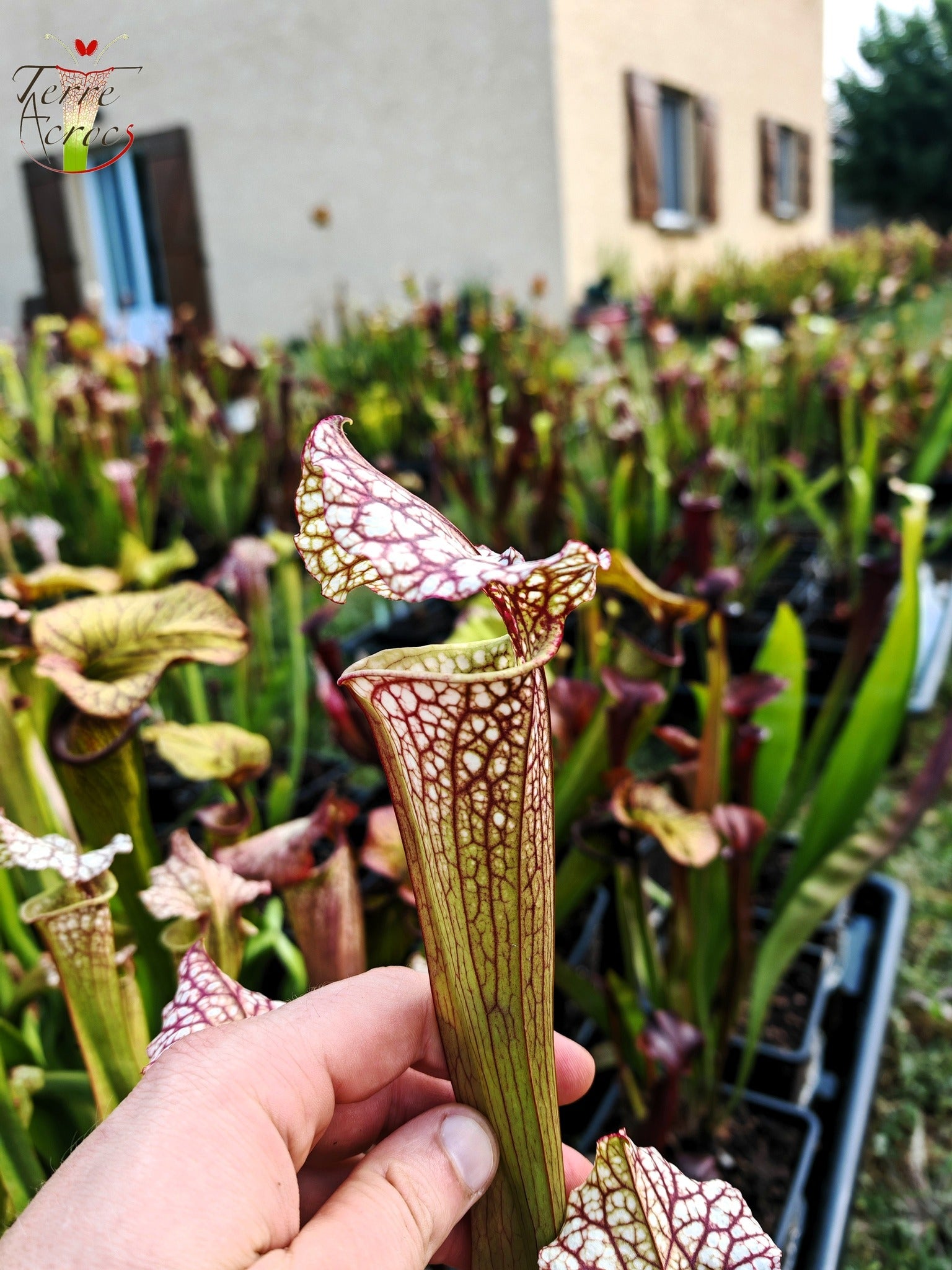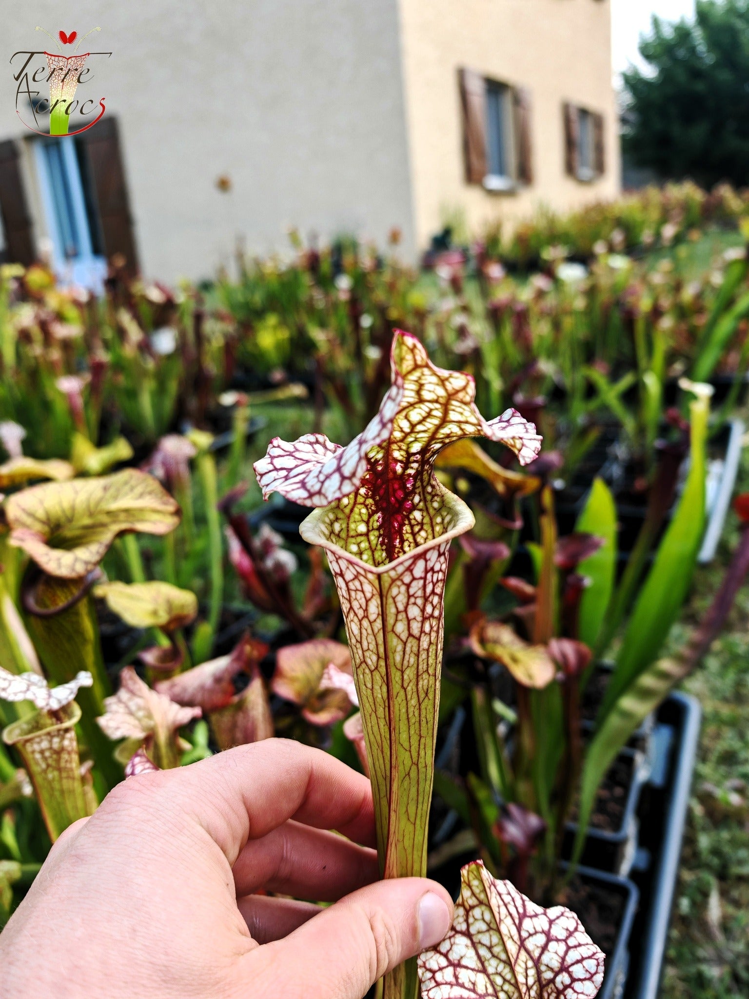 Un hybride de Sarracenia croisé et sélectionné chez TerreAcrocs. Une plante sans prétention issue d'un croisement entre le moorei 'Leah Wilkerson' et l'hybride "French Kiss'.