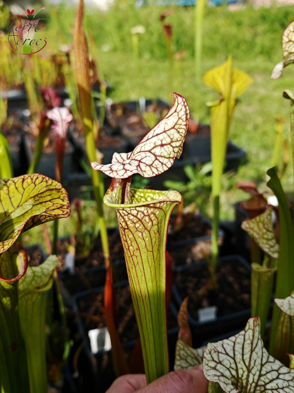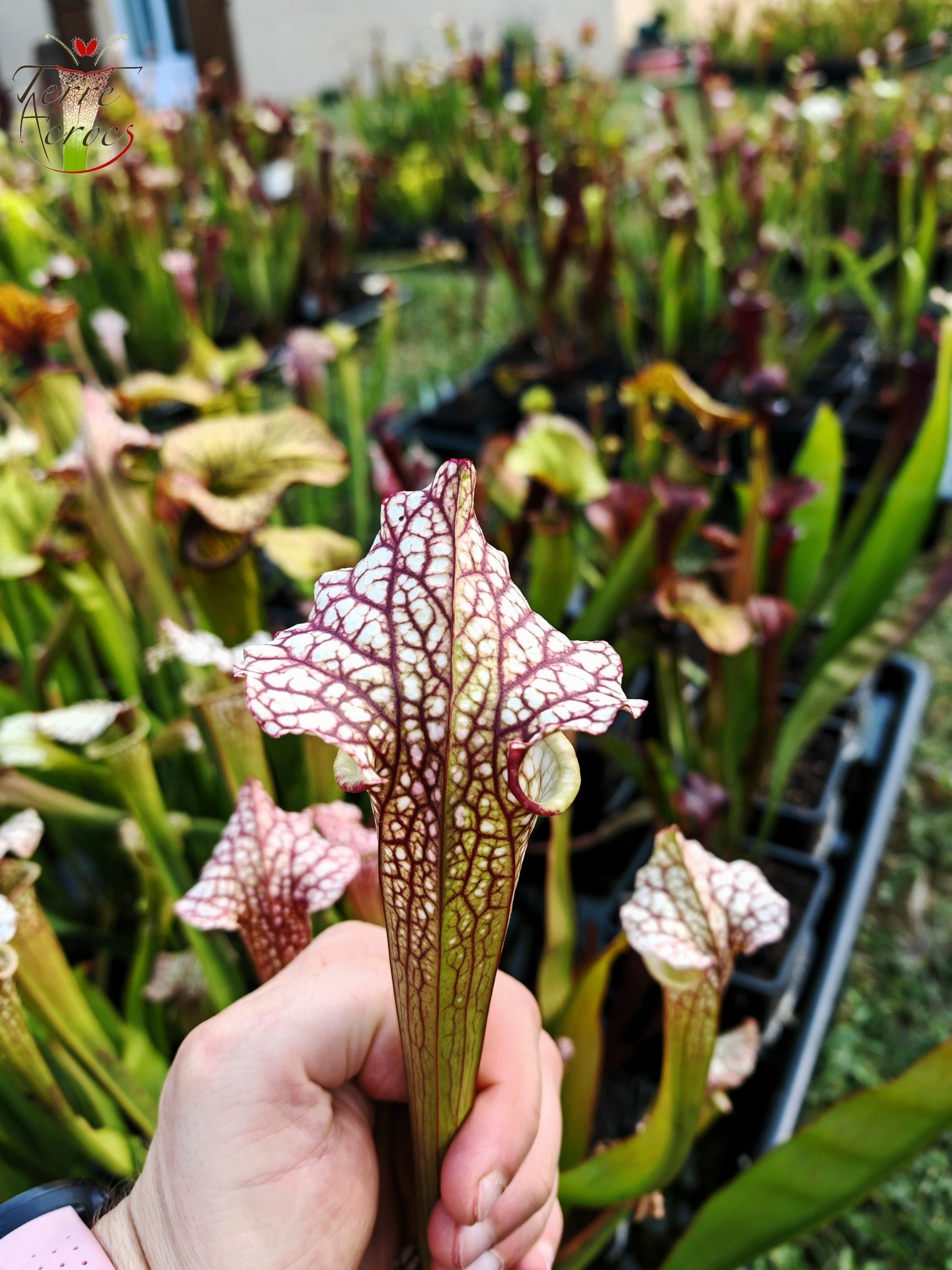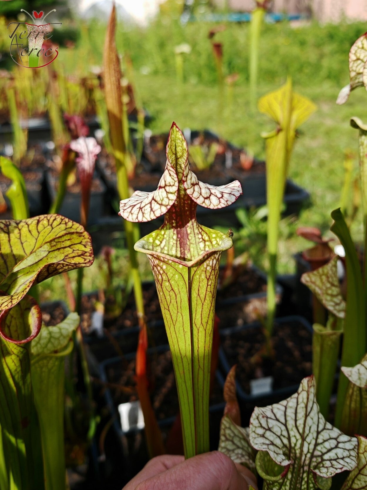 Un hybride de Sarracenia croisé et sélectionné chez TerreAcrocs. Une plante sans prétention issue d'un croisement entre le moorei 'Leah Wilkerson' et l'hybride "French Kiss'.