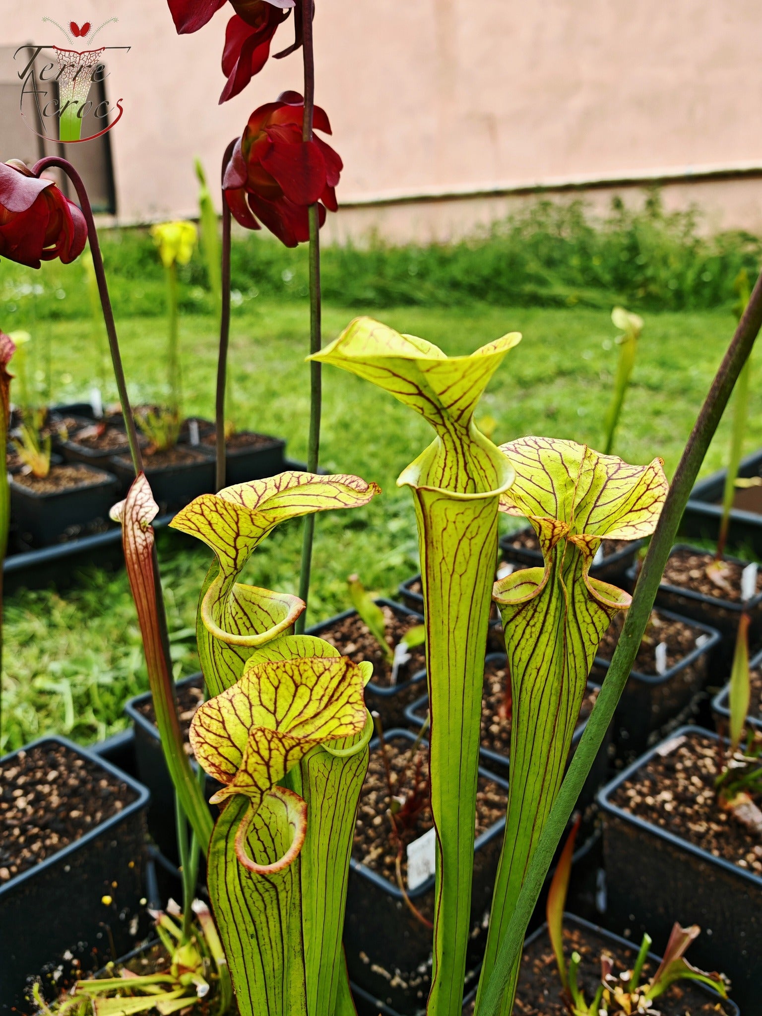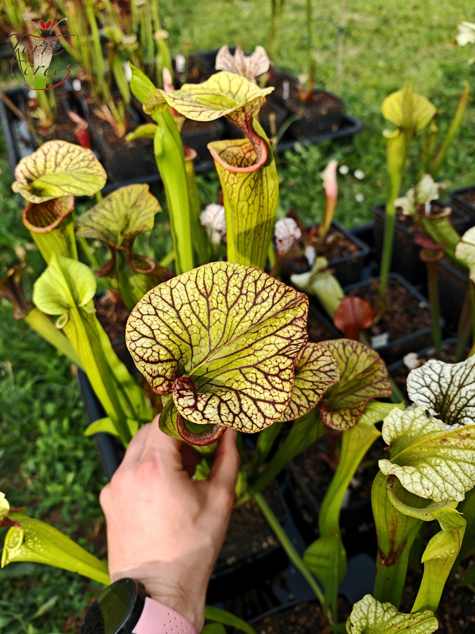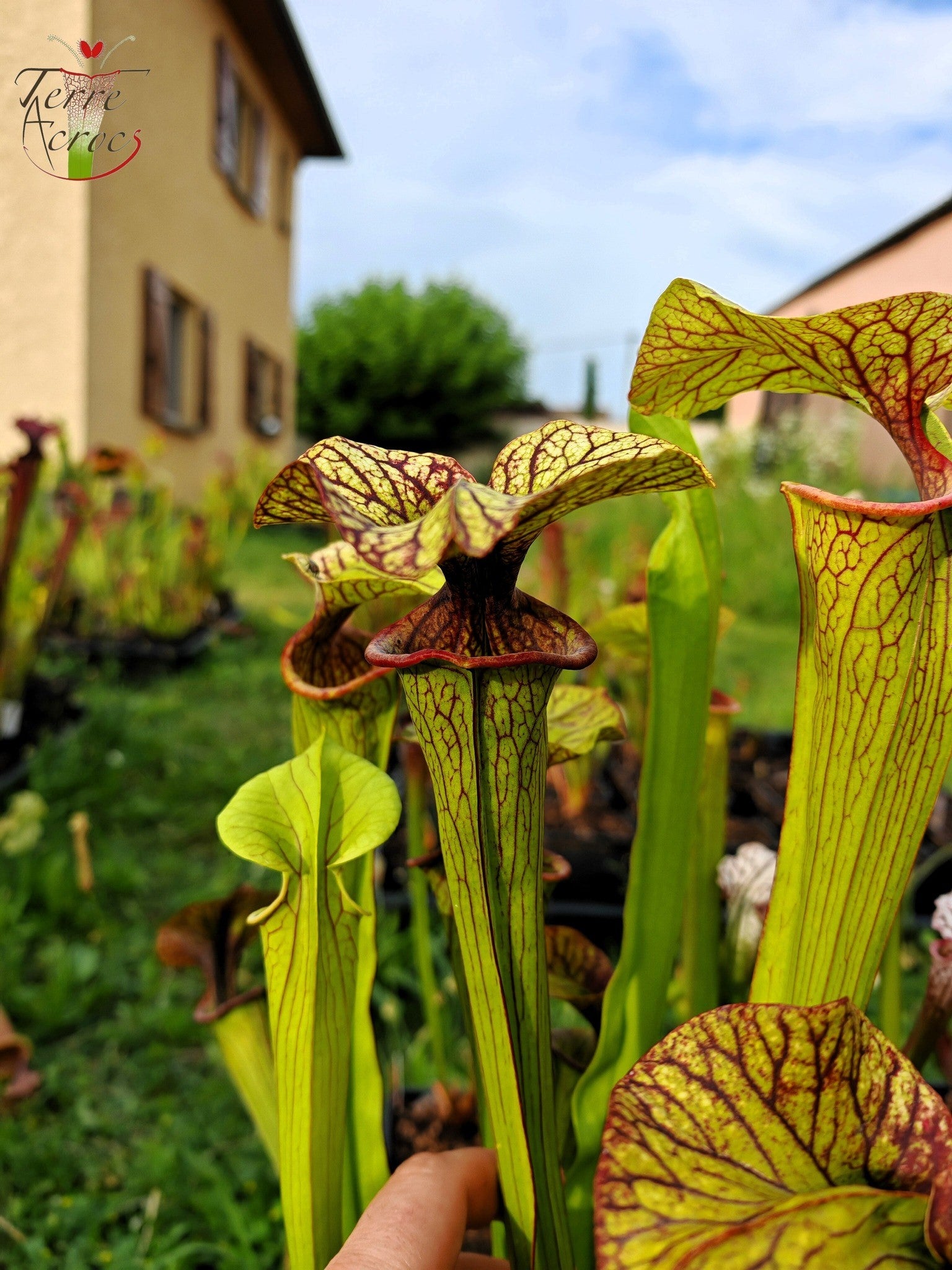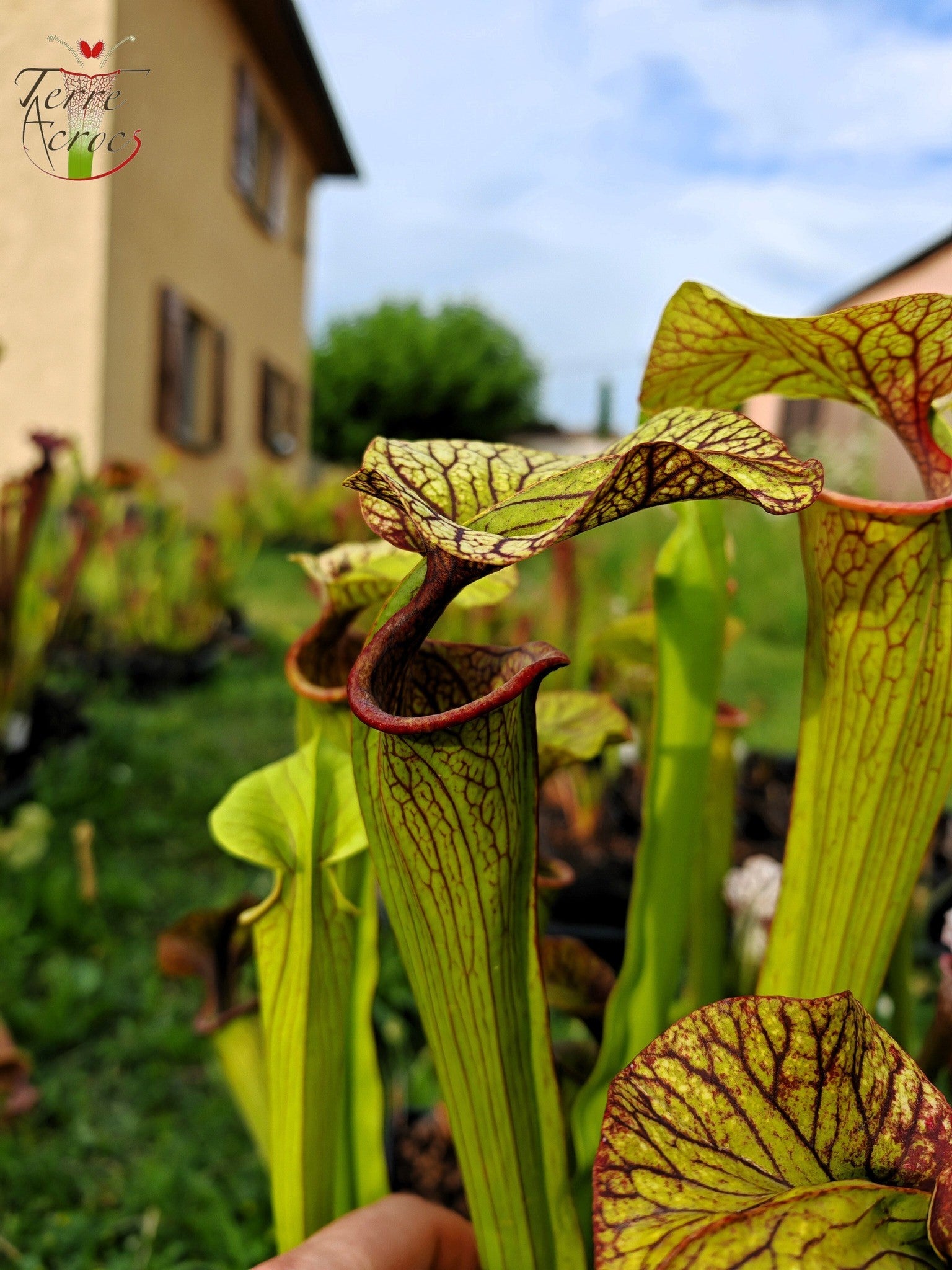 Un beau sarracenia issu d'un mix de graines de chez O. Bres. Des urnes vertes et bien veinées avec de très beaux capuchons, une gorge assez rouge.