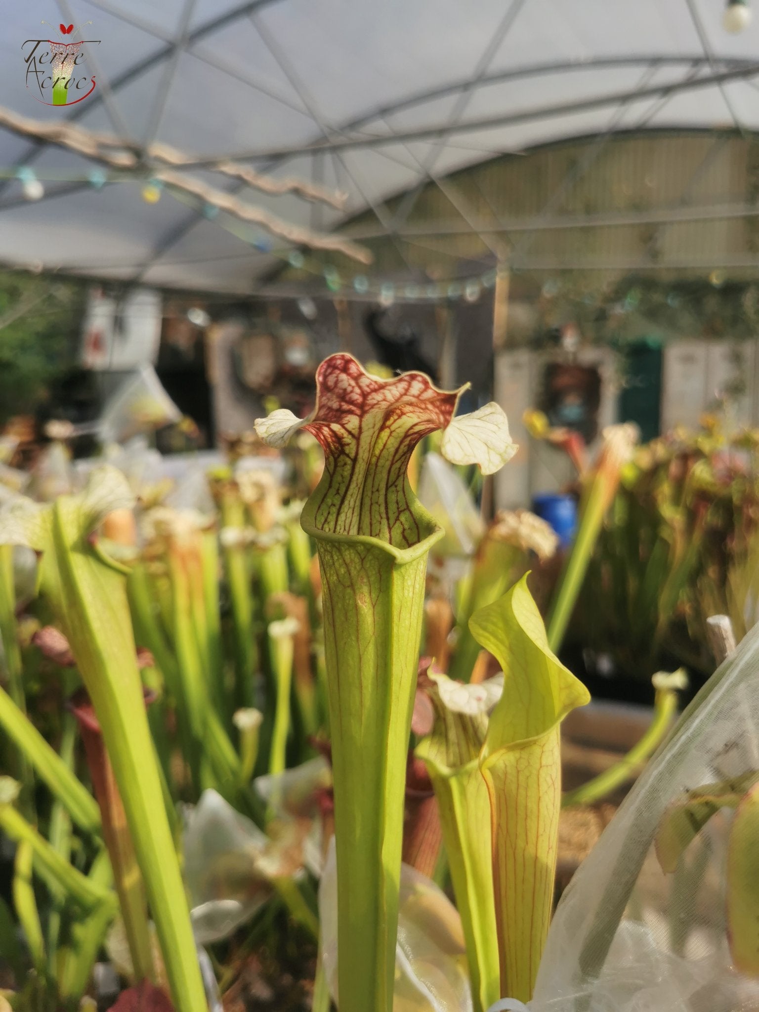 Un immense Sarracenia x areolata dont l’intérieur de l’opercule est teinté de rose. De très jolies urnes assez fines et délicatement veinées mais qui peuvent monter assez haut.