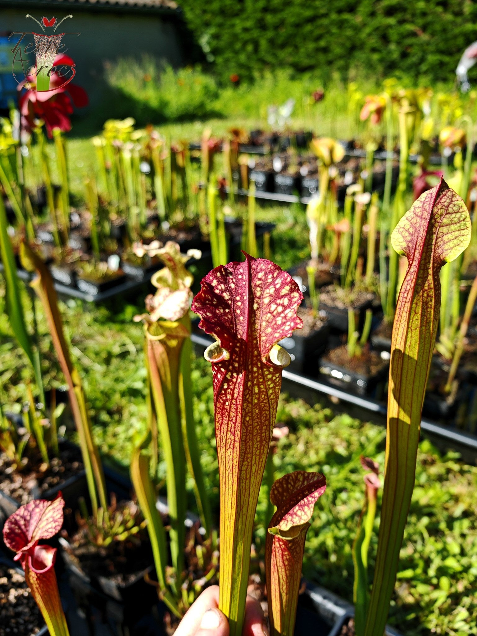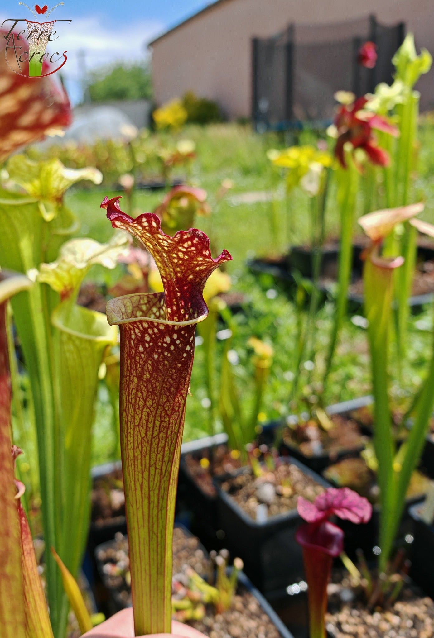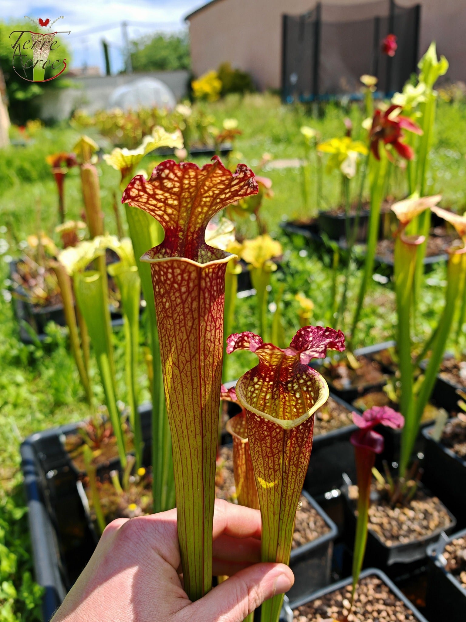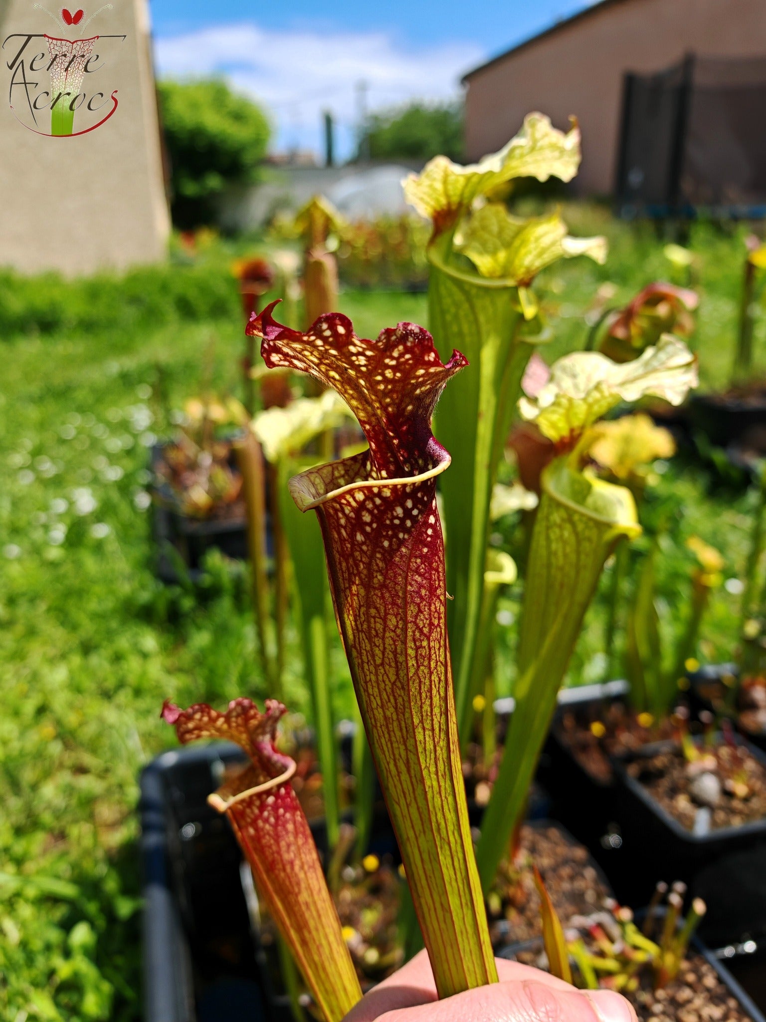 Un Sarracenia x moorei aux couleurs très intéressantes croisé et sélectionné par Guillaume Billy. Au delà de ses couleurs grenat et doré, cette plante à l'avantage de ne produire que peu de phyllodes et donc d'être belle tout au long de la saison, du printemps à l'automne.