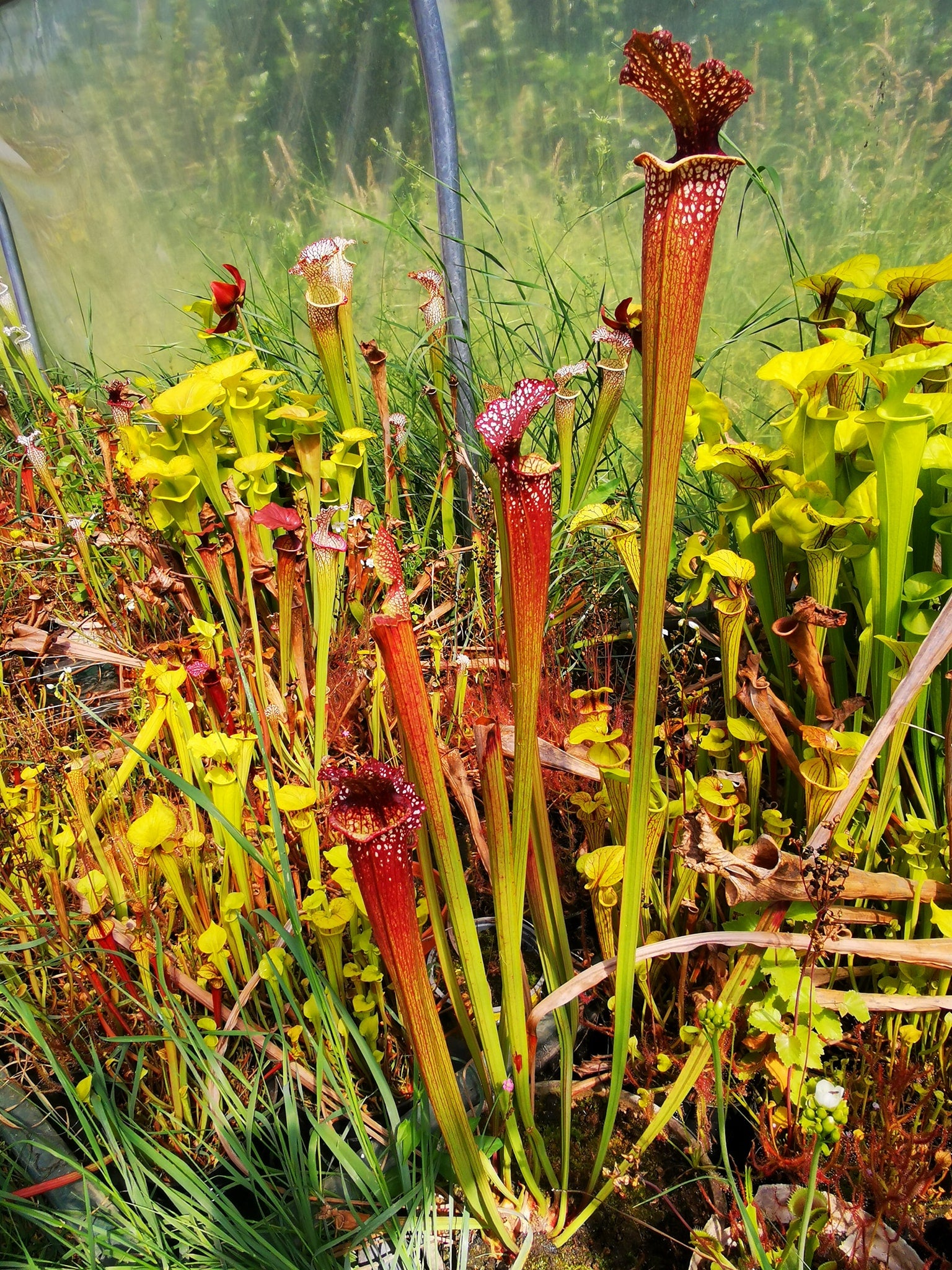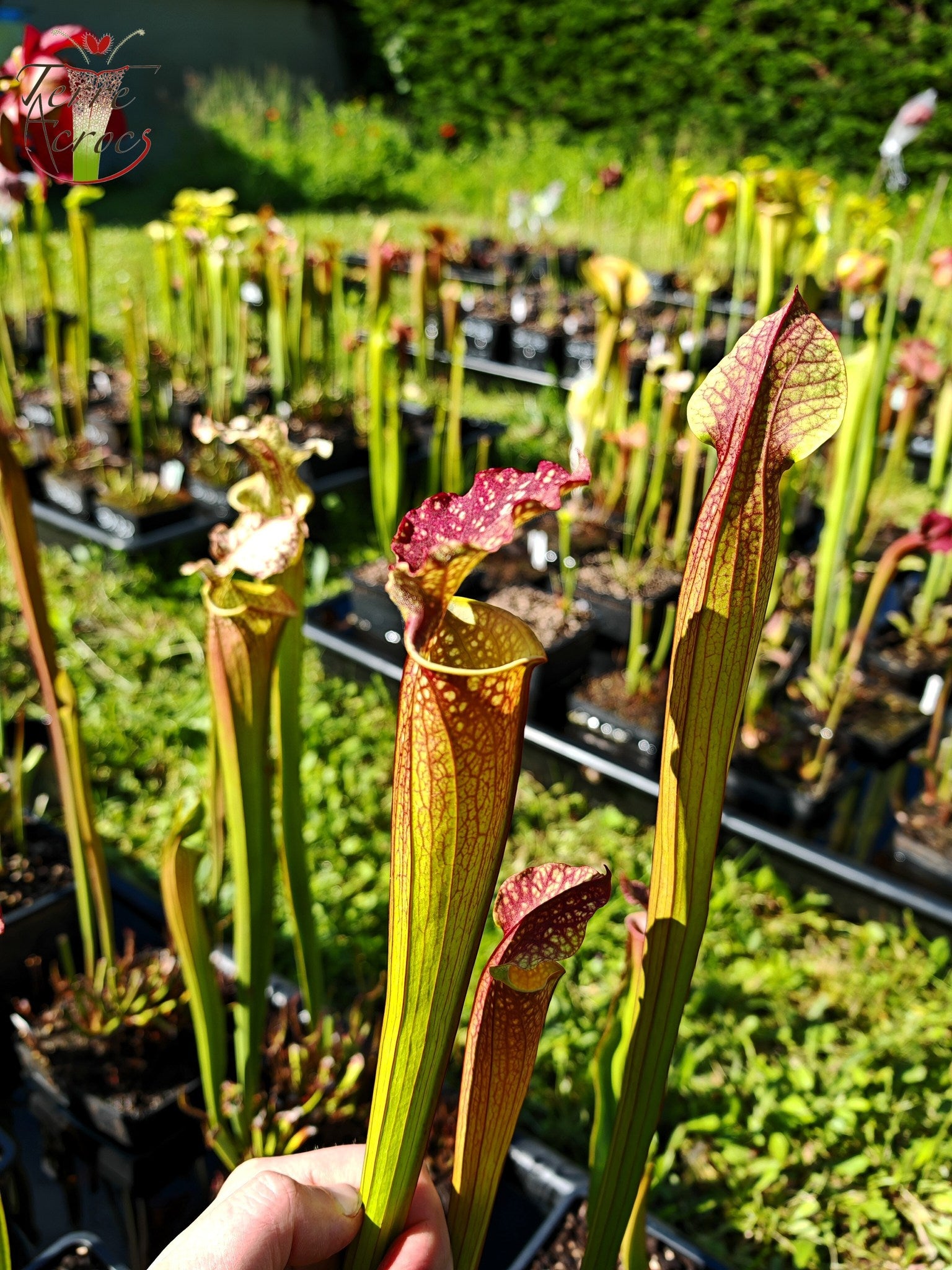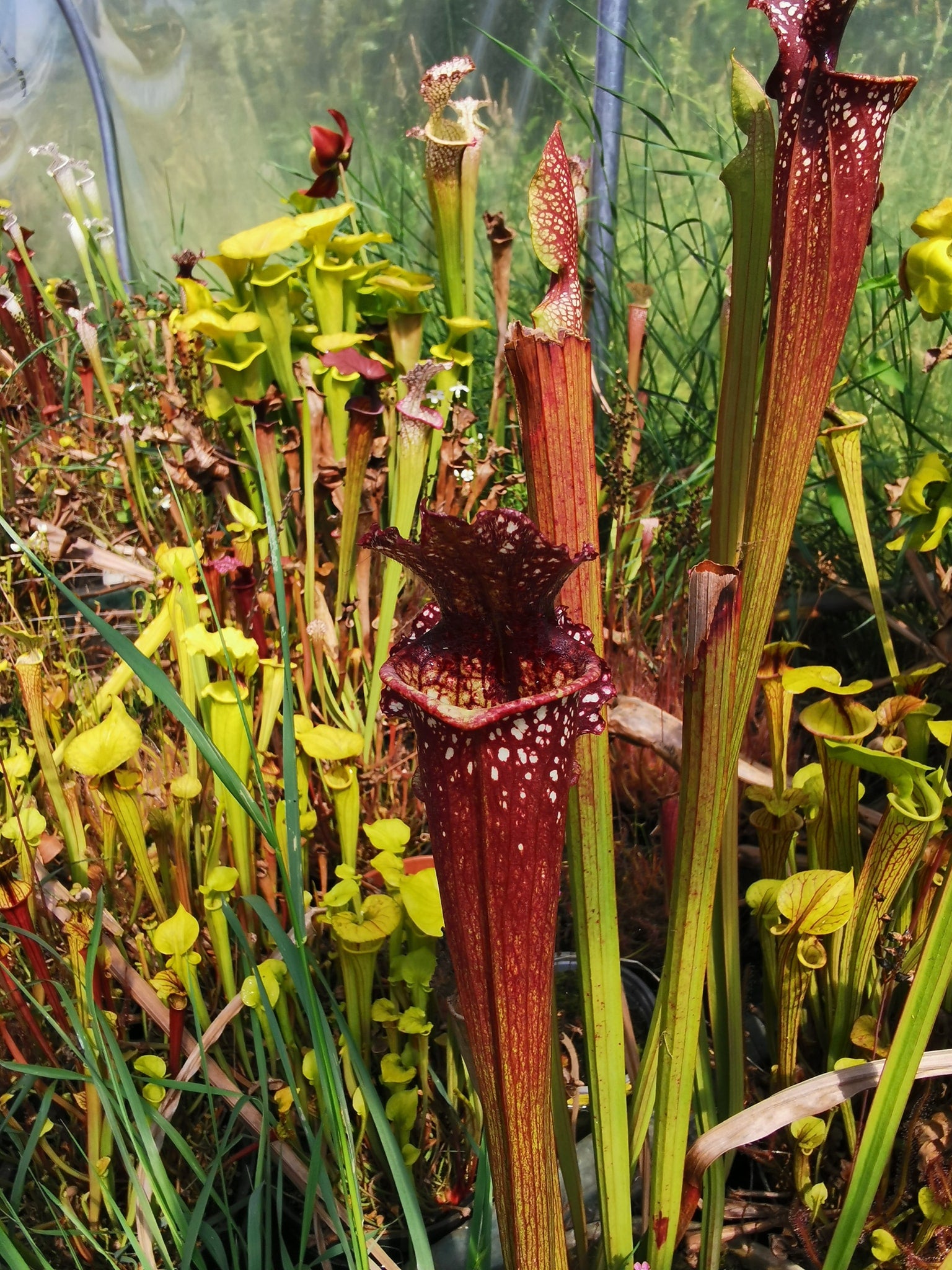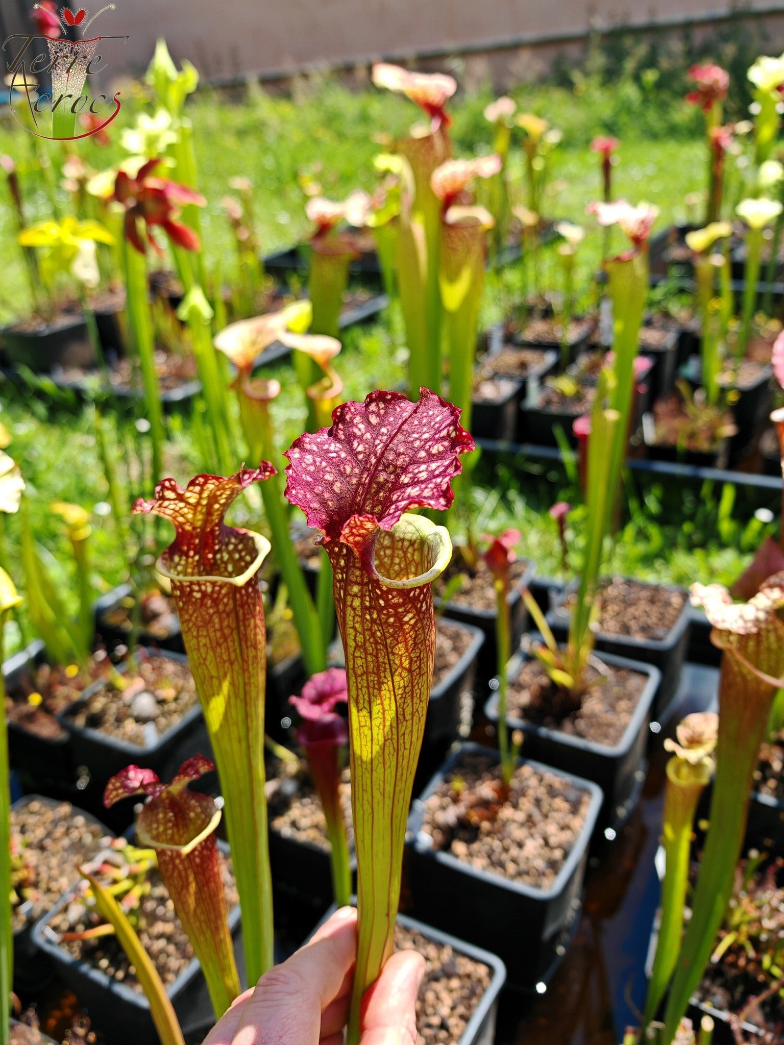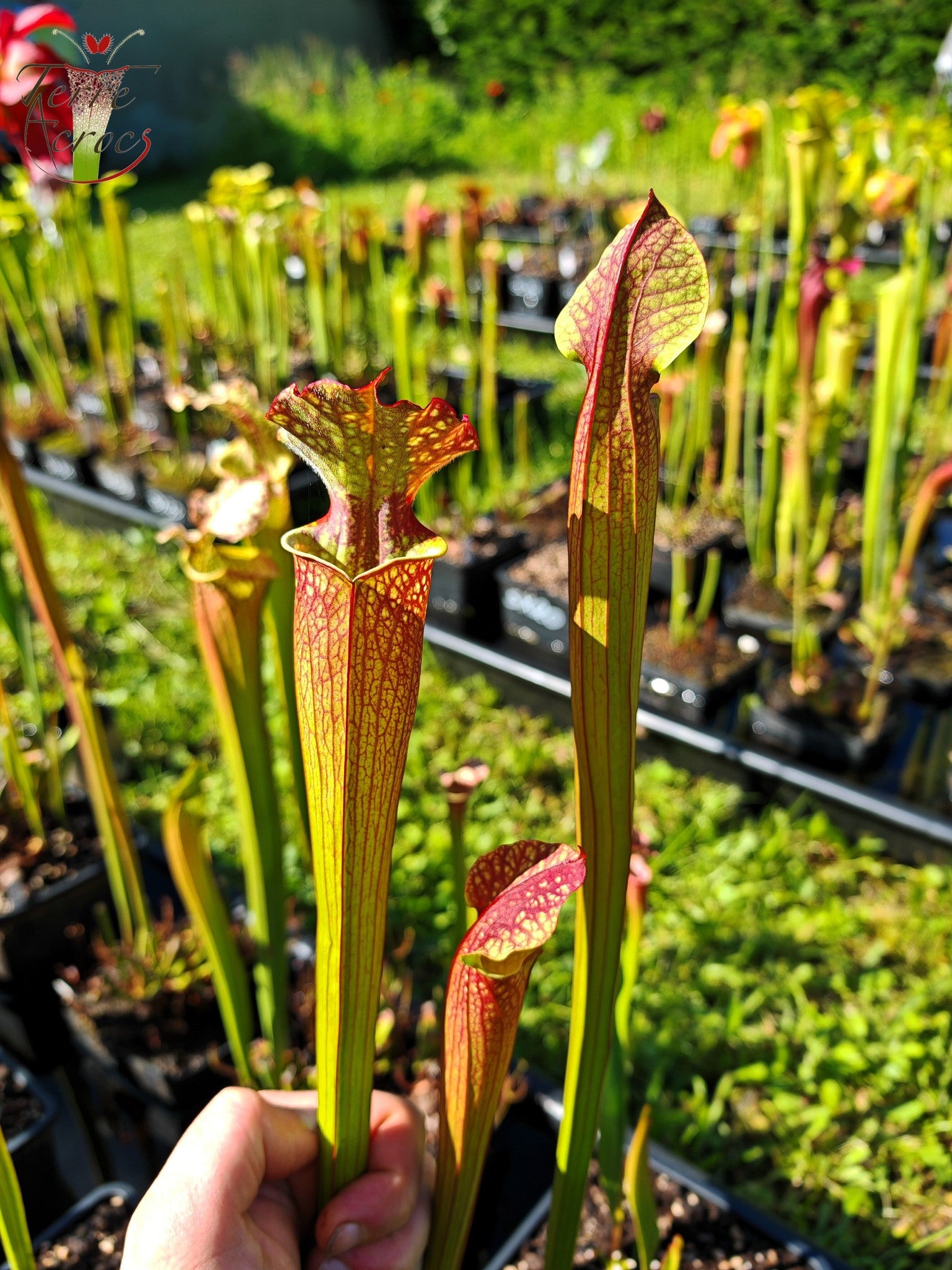 Un Sarracenia x moorei aux couleurs très intéressantes croisé et sélectionné par Guillaume Billy. Au delà de ses couleurs grenat et doré, cette plante à l'avantage de ne produire que peu de phyllodes et donc d'être belle tout au long de la saison, du printemps à l'automne.