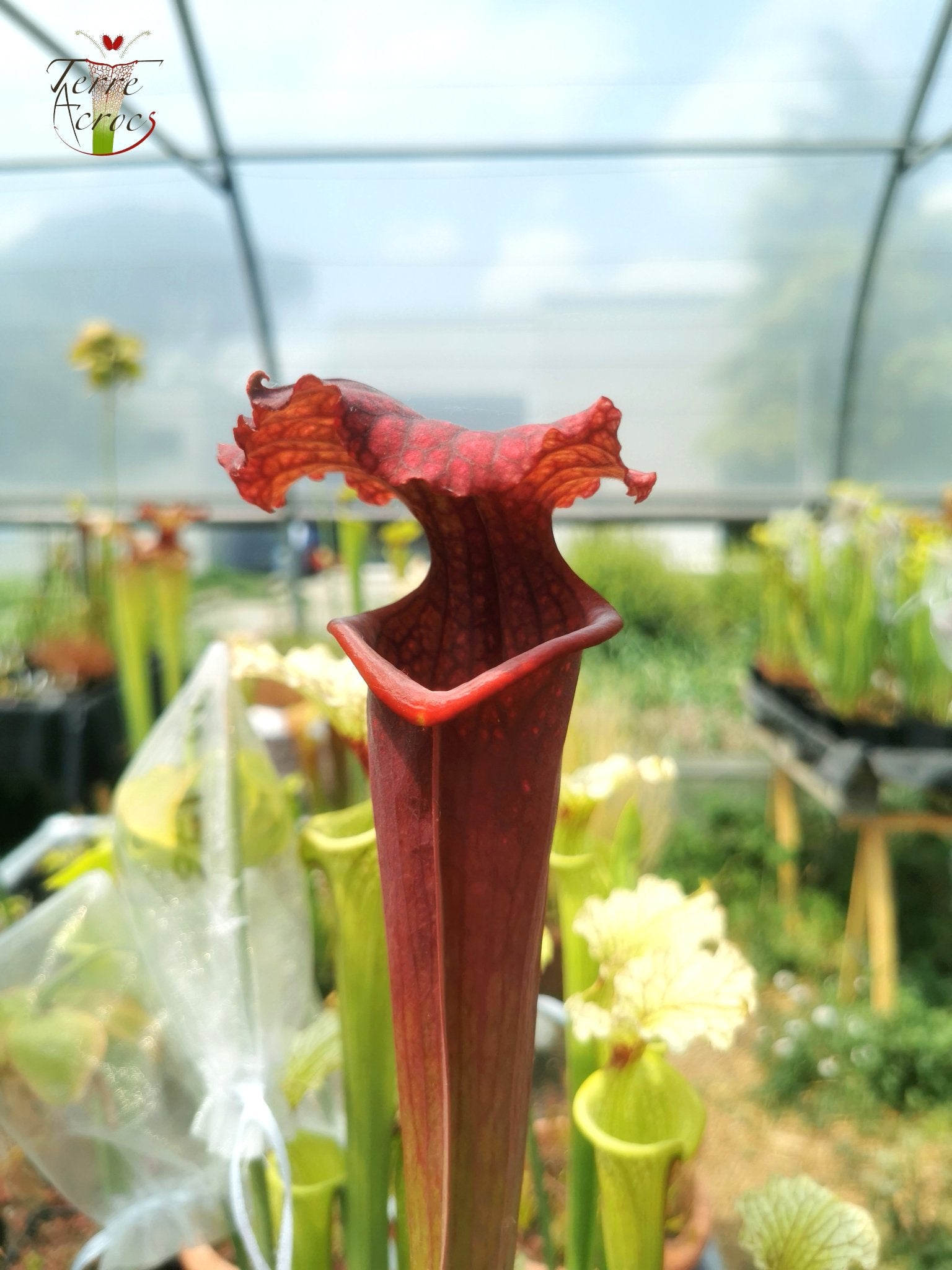 Un Sarracenia x moorei magnifique, tout de rouge sombre, à l’allure reconnaissable et bien robuste. L’opercule présente des ocelles roses et une forme dentelée assez caractéristique. Une très belle plante en collection !