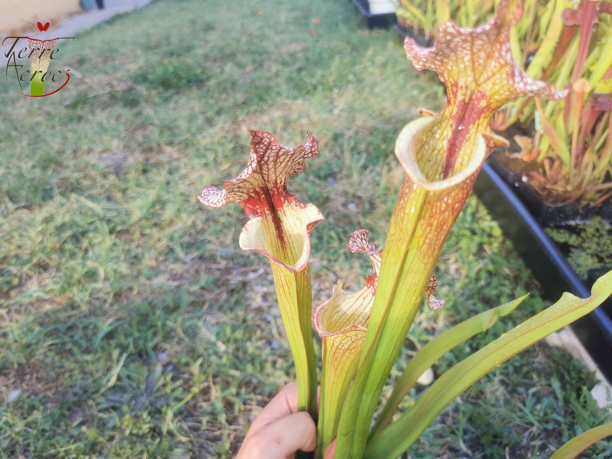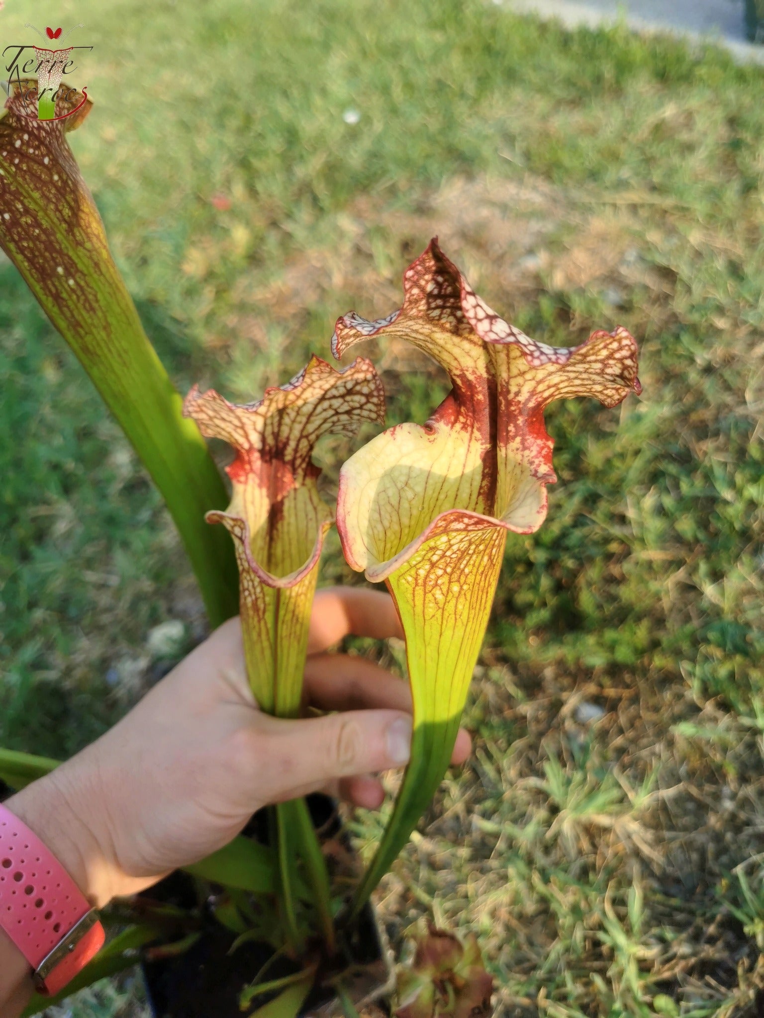 Sarracenia x moorei "Tyrex" est une magnifique sélection française. La principale caractéristique de cette plante est d'avoir une bouche déformée qui lui apporte toute son originalité. Comme beaucoup de moorei, la plante a 2 périodes de croissances à la fois printanière et automnale qui lui amène aussi de la diversité de couleurs. La croissance printanière est plus rouge veinée et l'automnale elle est plus blanche faisant ressortir la tâche rouge dans la gorge.