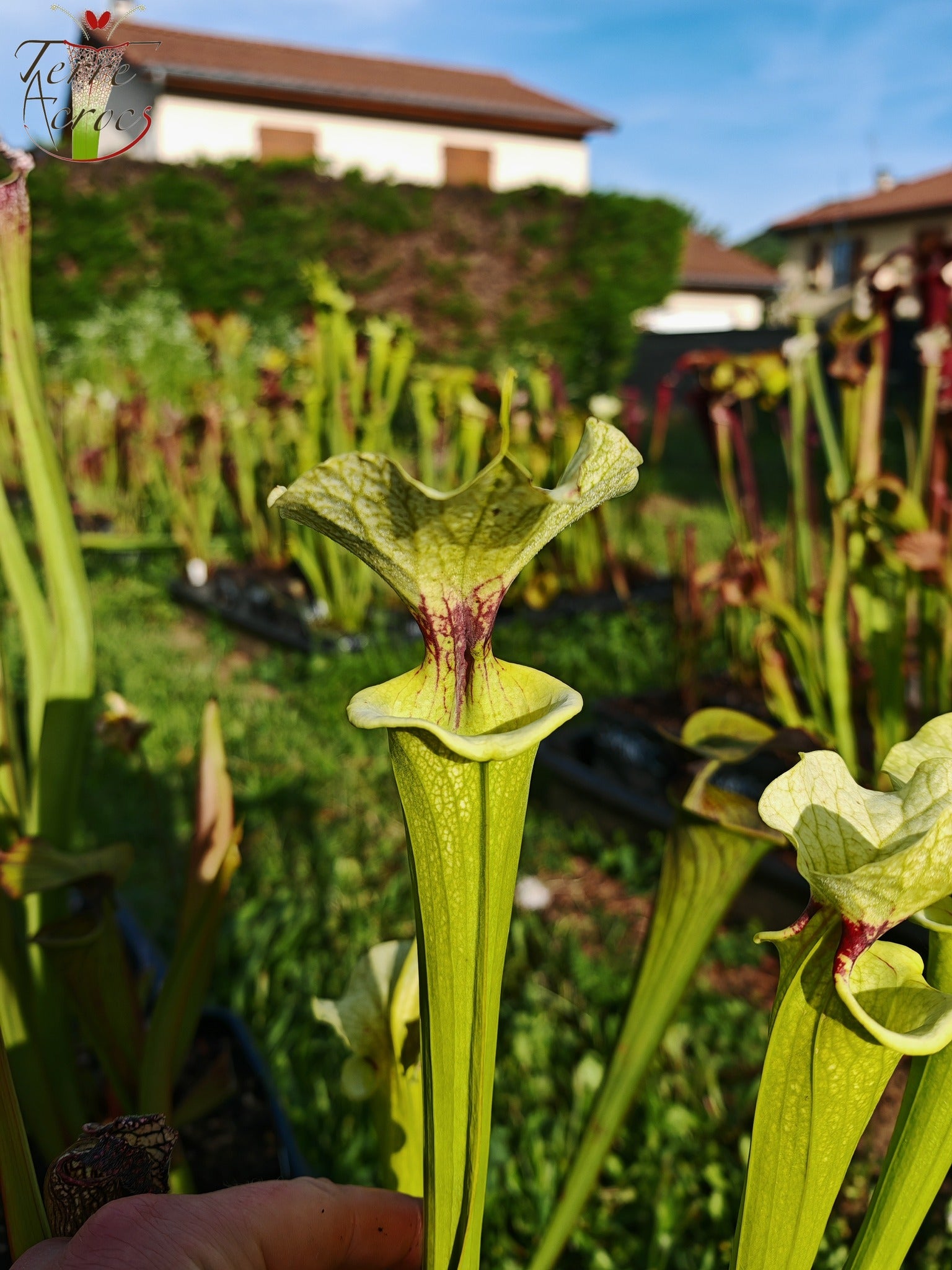 Un Sarracenia x moorei issu d'un croisement entre un leucophylla et un flava "Goldie". La plante est d'un vert pale avec une tâche rose / rouge veinée dans la gorge. Une fois l'ouverture des pièges de printemps la gorge et le dessous de l'opercule peuvent se colorer d'un rose intense au fur et à mesure de la maturité des pièges. Une plante assez exigeante pour offrir son plus beau spectacle.
